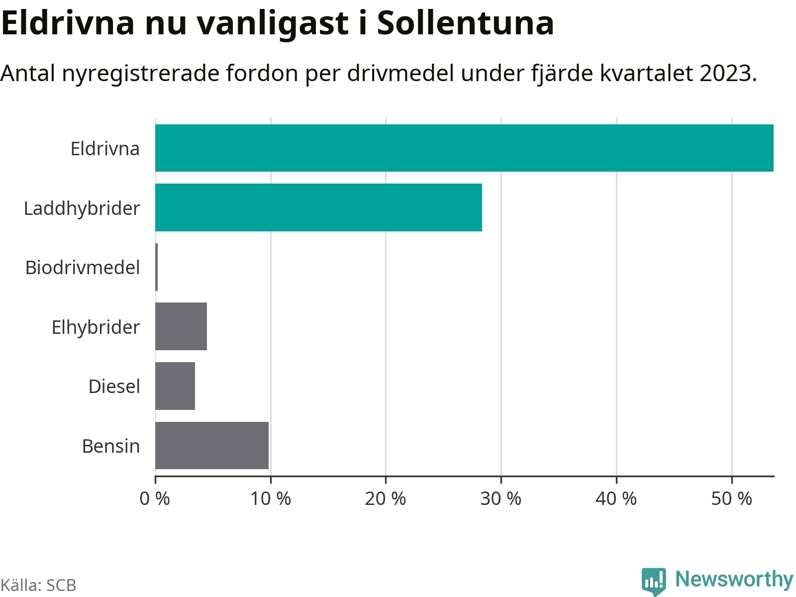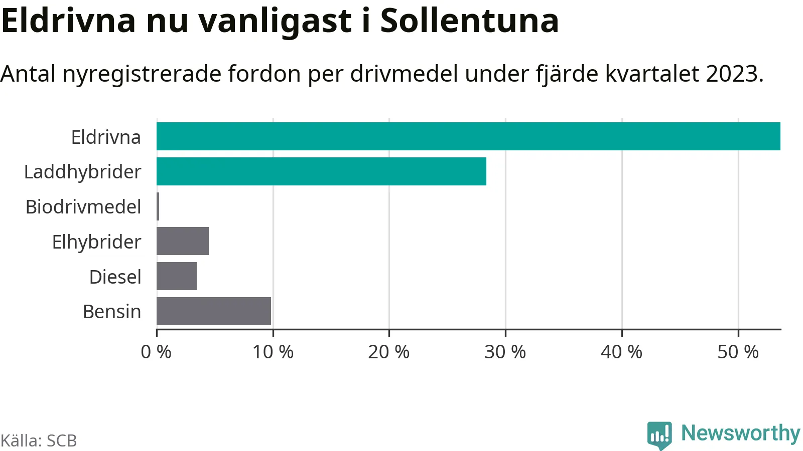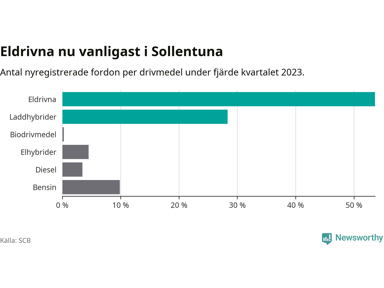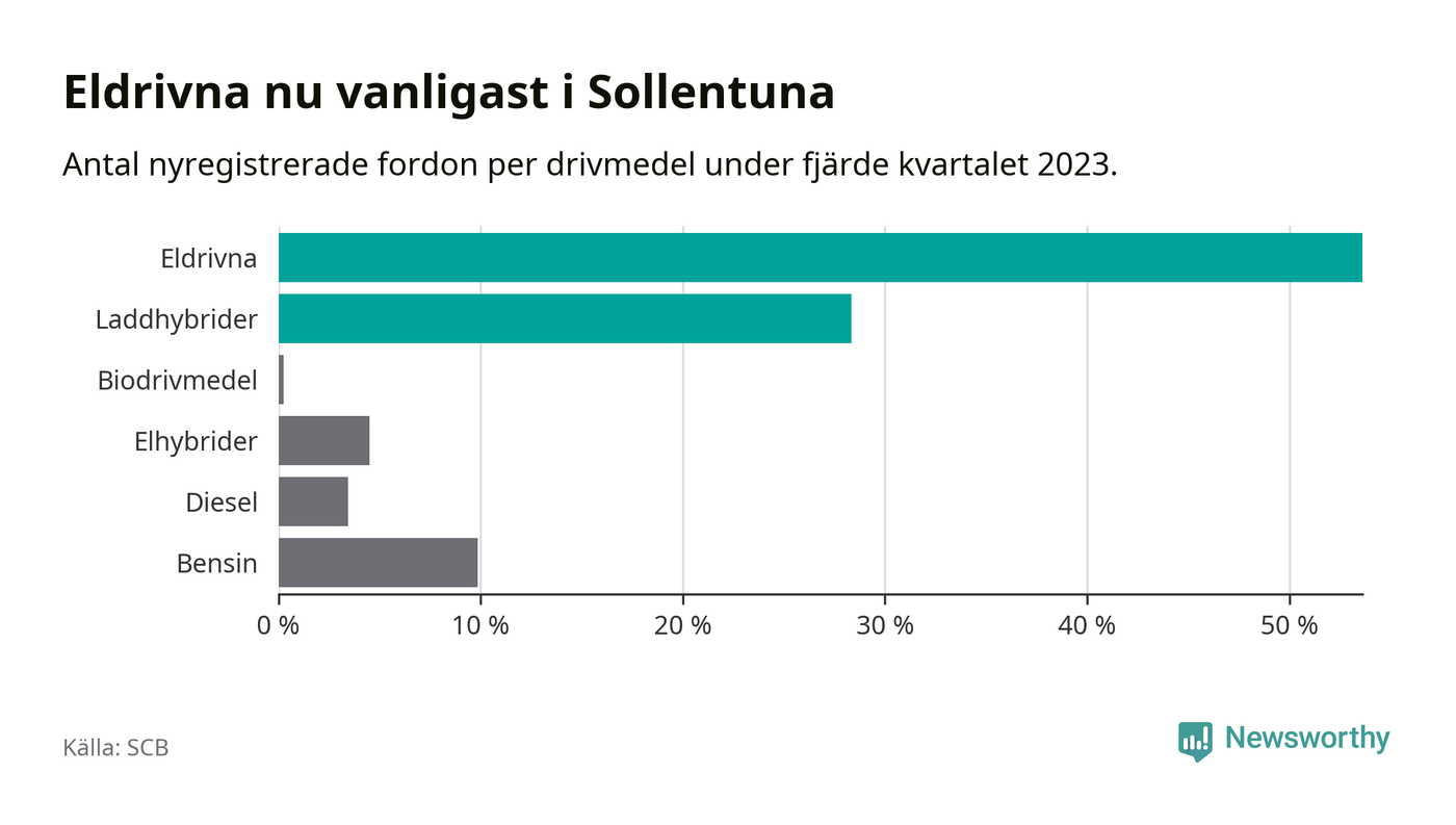 Under fjärde kvartalet 2023 var 82 procent av alla nyregistrerade personbilar i Sollentuna laddbara (sammanlagt registrerades 1 218 nya bilar). Merparten av de laddbara bilarna var rena elbilar (54 procent av alla).