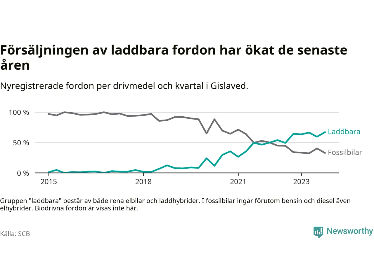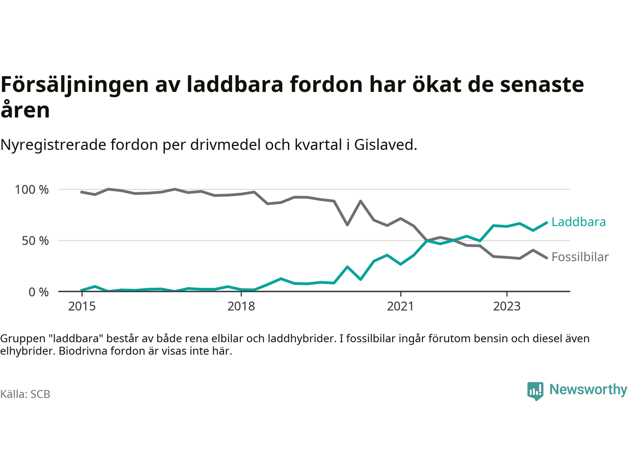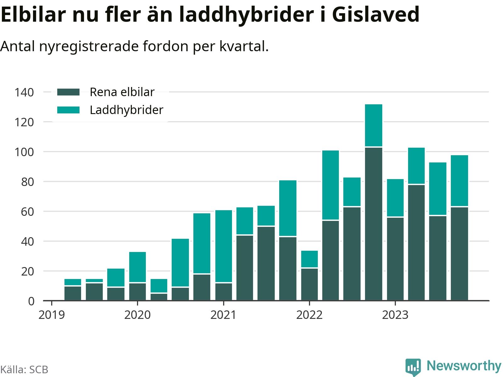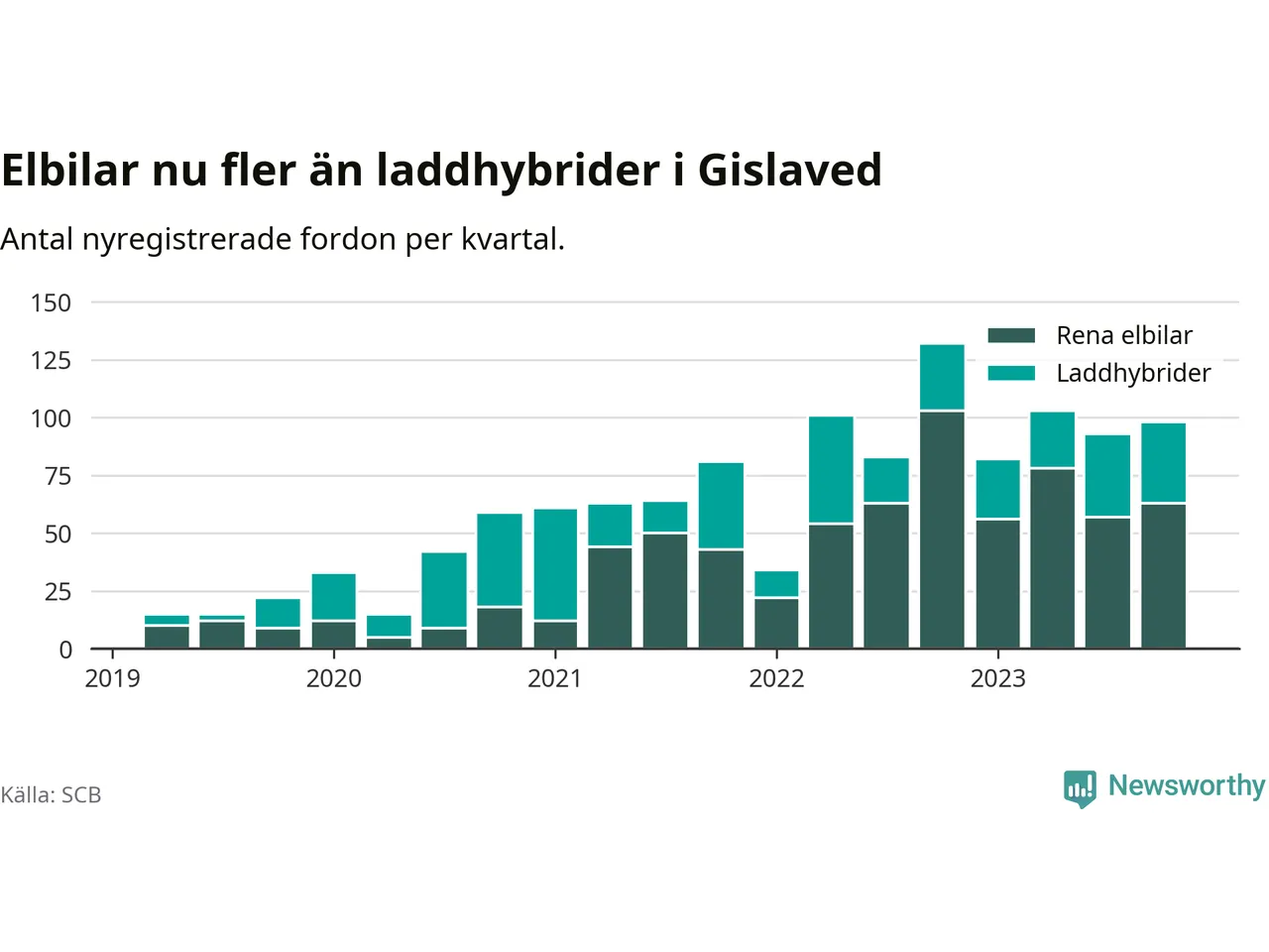 Under fjärde kvartalet 2023 var 67 procent av alla nyregistrerade personbilar i Gislaved laddbara (sammanlagt registrerades 146 nya bilar). Merparten av de laddbara bilarna var rena elbilar (43 procent av alla).