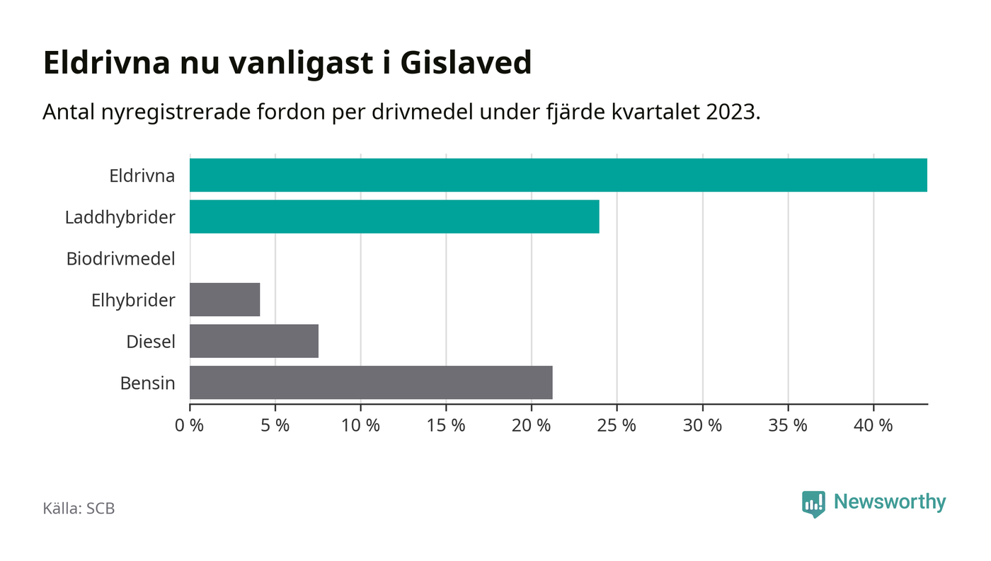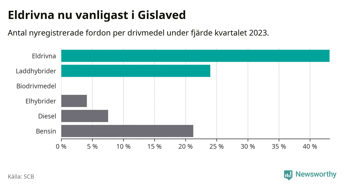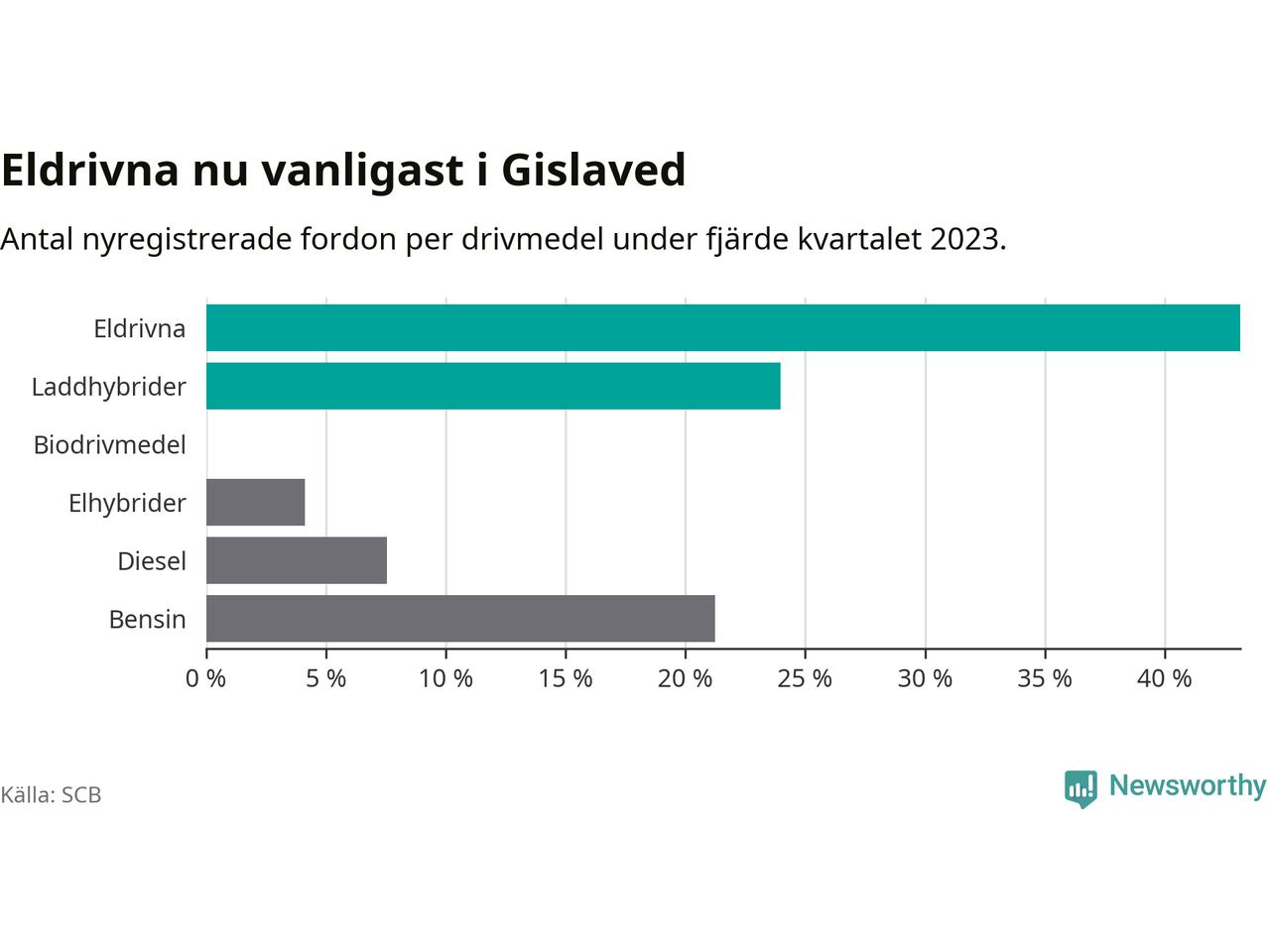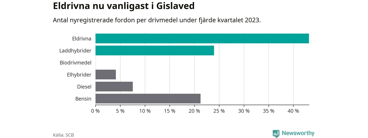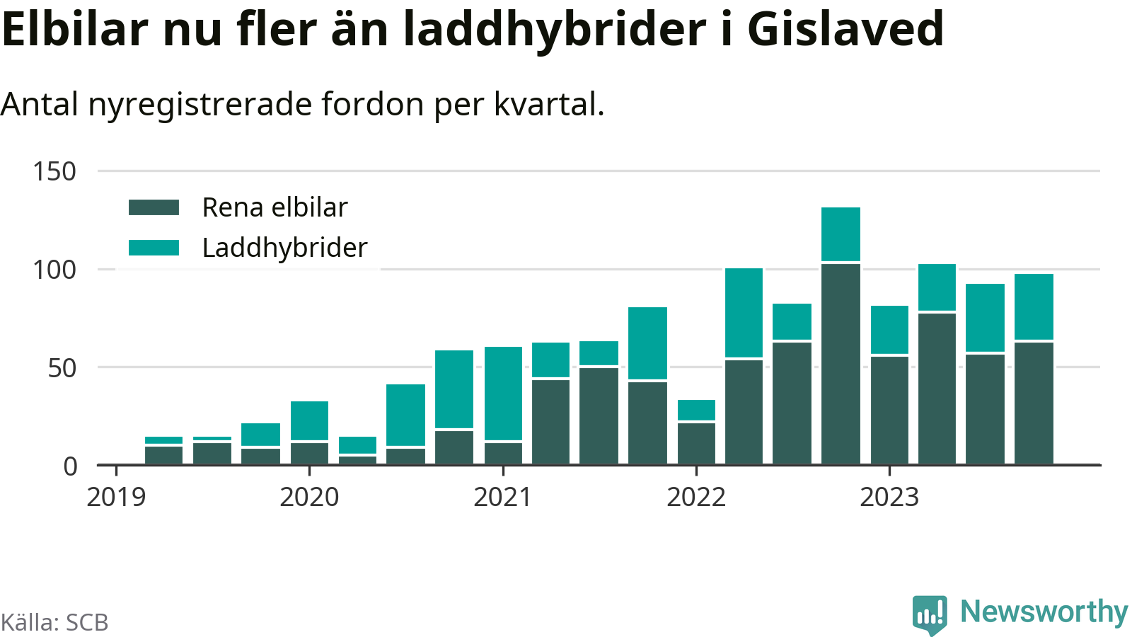Under fjärde kvartalet 2023 var 67 procent av alla nyregistrerade personbilar i Gislaved laddbara (sammanlagt registrerades 146 nya bilar). Merparten av de laddbara bilarna var rena elbilar (43 procent av alla).