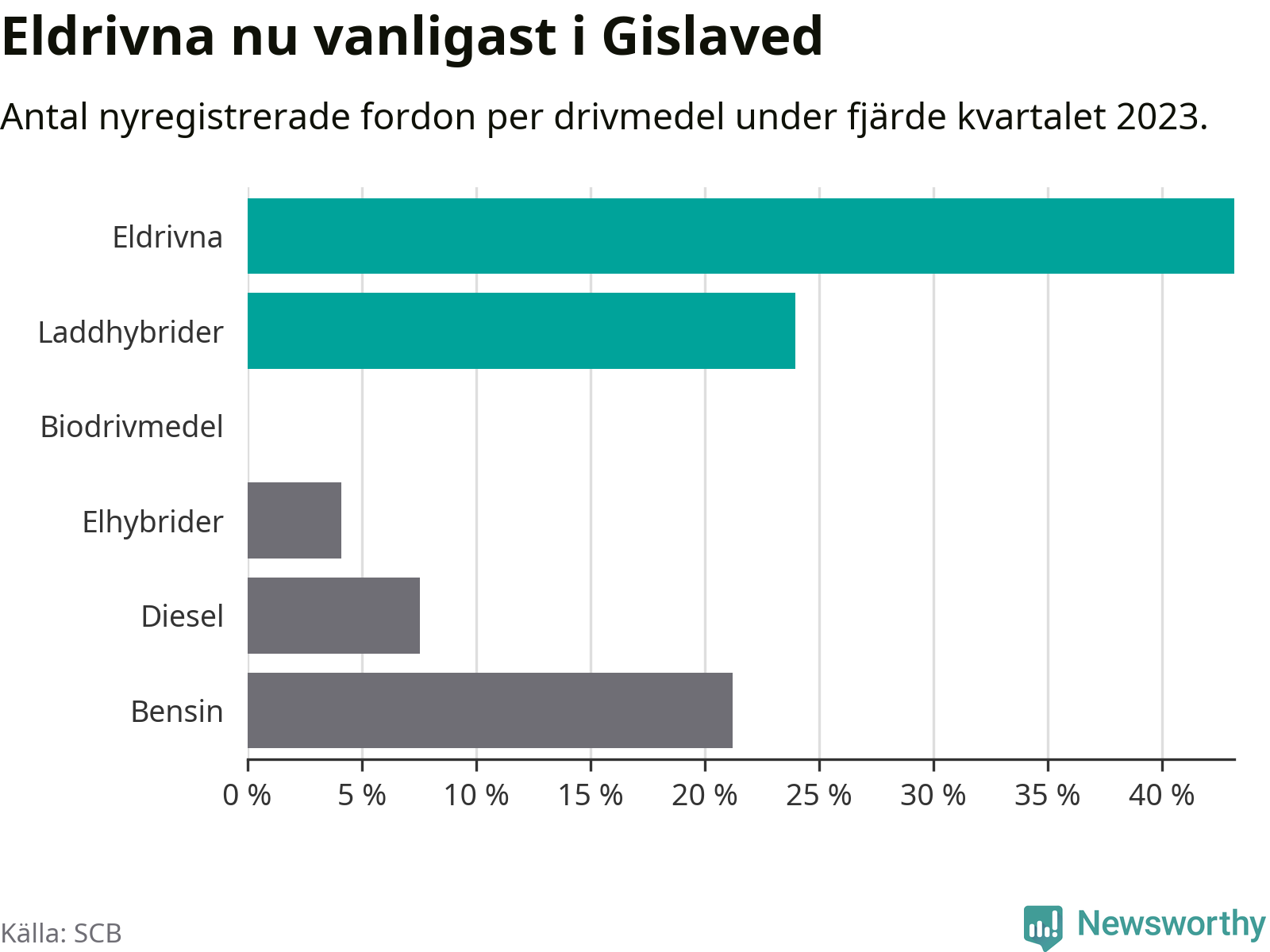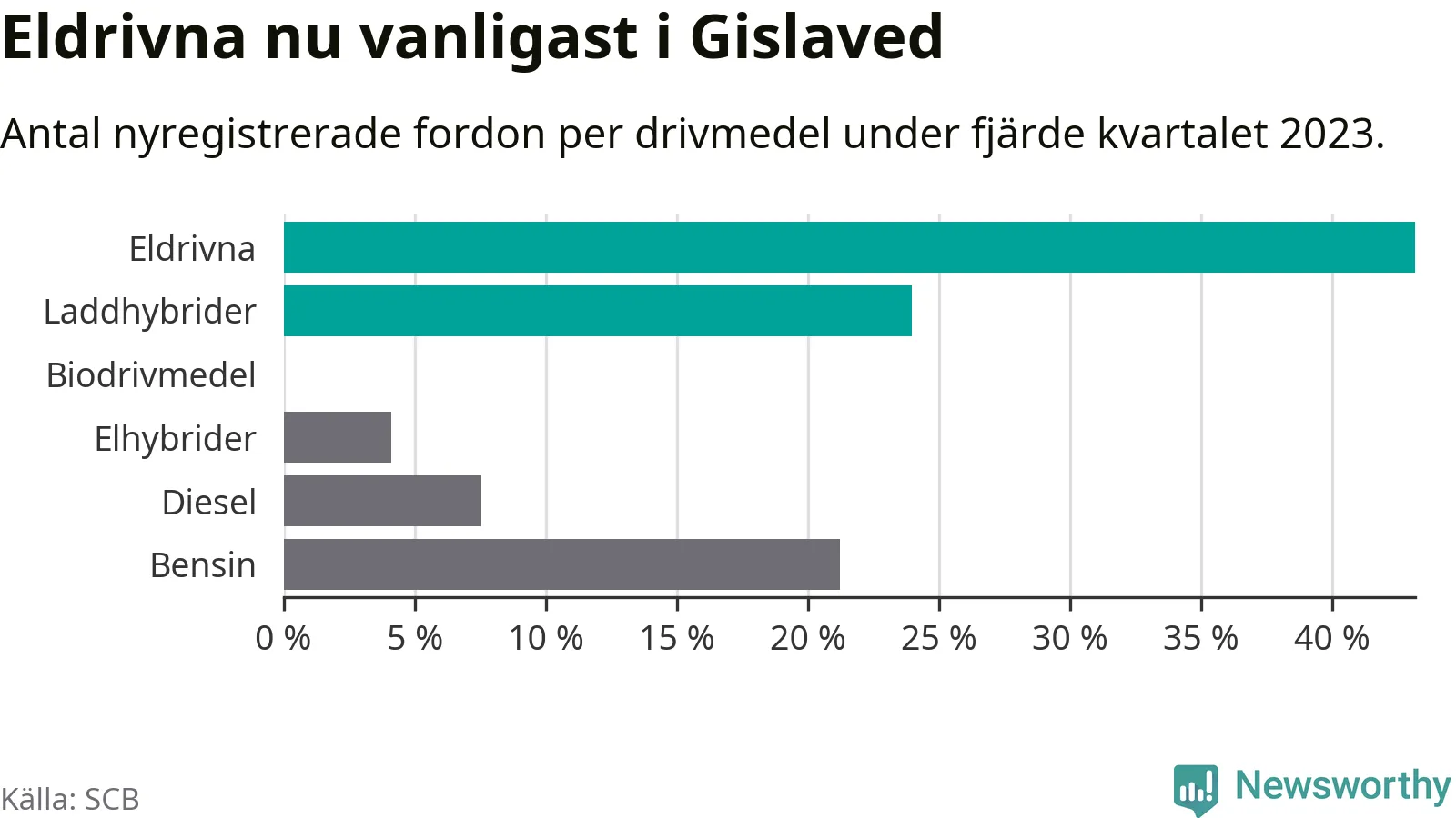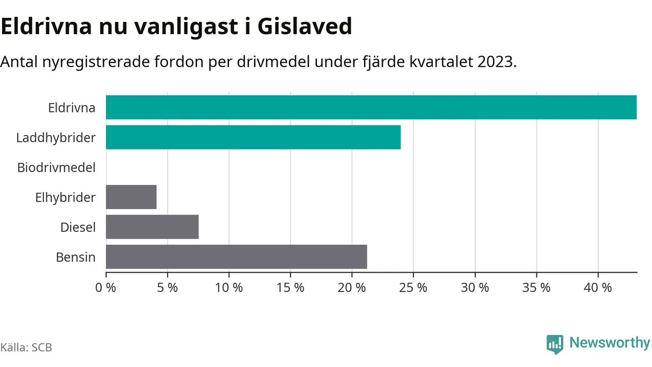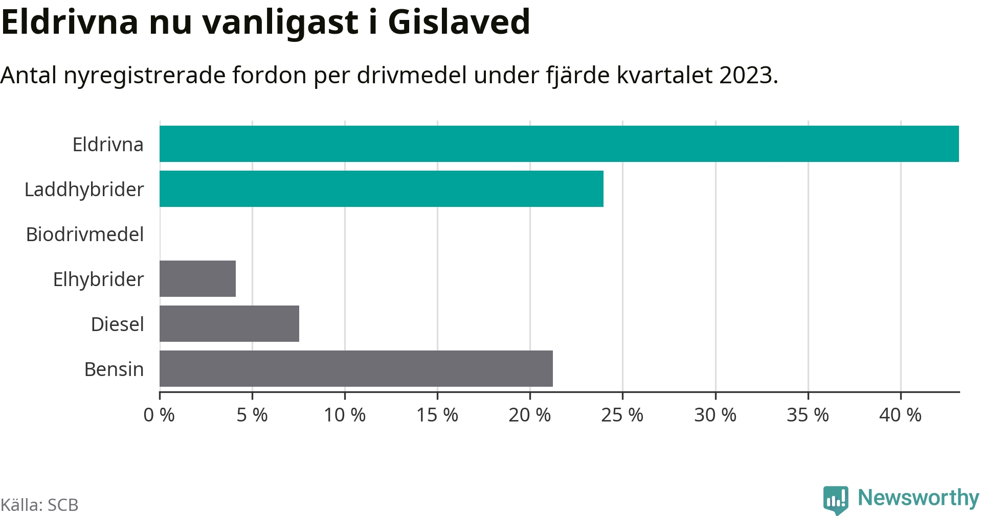 Under fjärde kvartalet 2023 var 67 procent av alla nyregistrerade personbilar i Gislaved laddbara (sammanlagt registrerades 146 nya bilar). Merparten av de laddbara bilarna var rena elbilar (43 procent av alla).