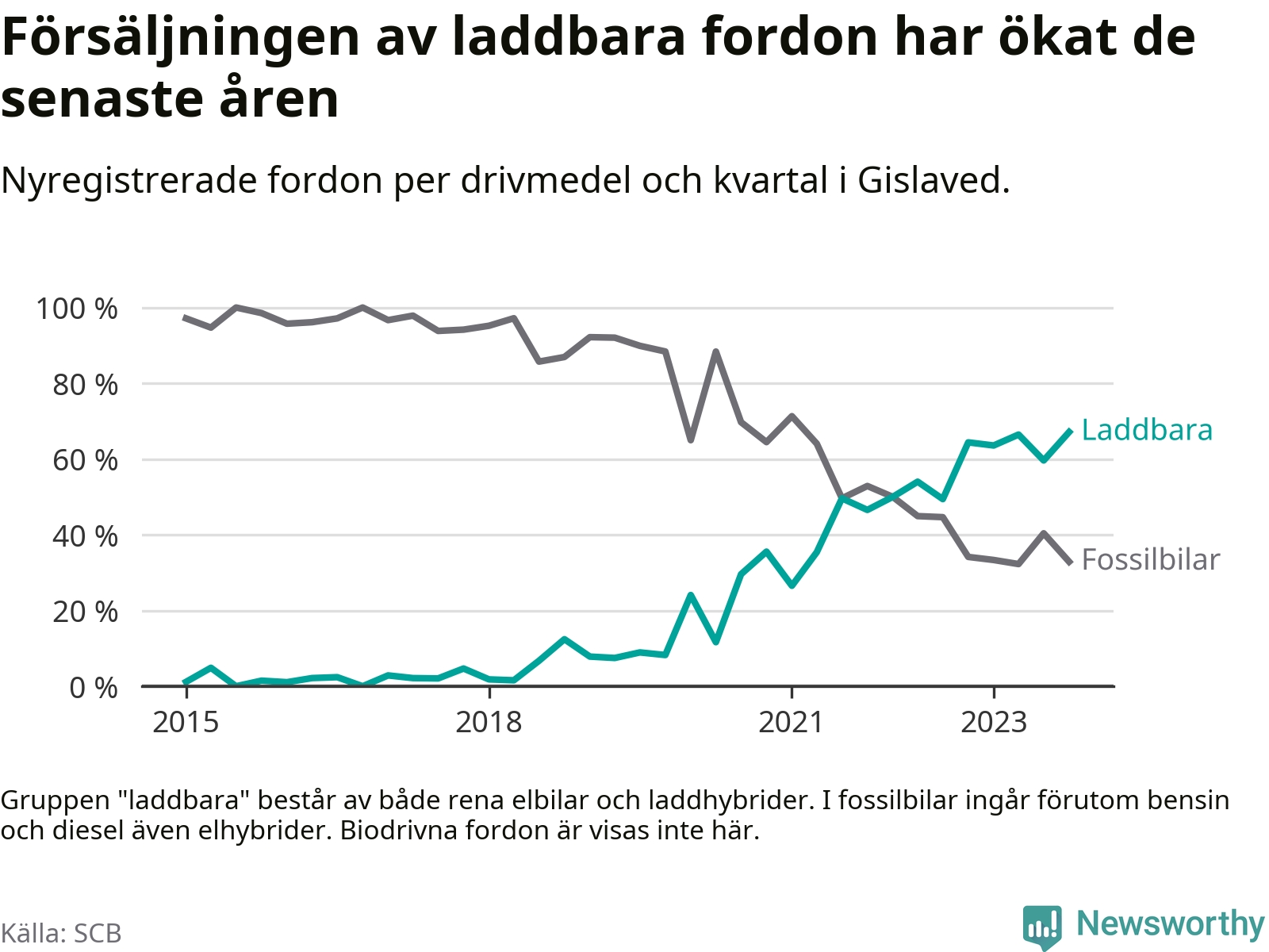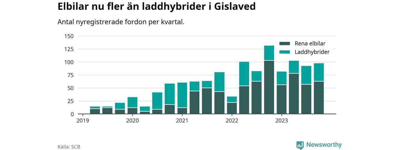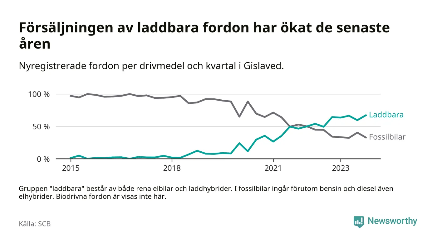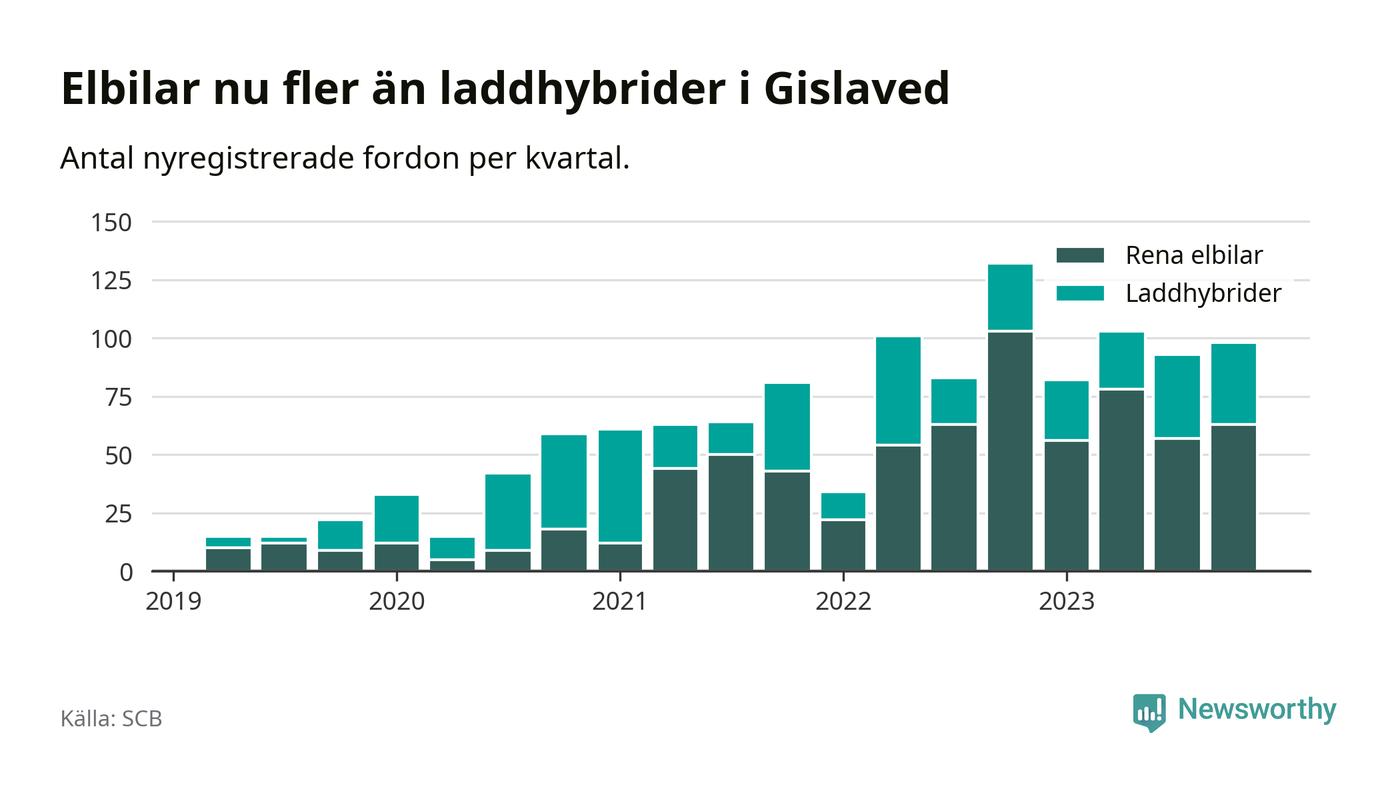 Men i Gislaved noterades ett nytt rekord under fjärde kvartalet. Aldrig tidigare har laddbara bilar utgjort en så stor del av alla nya bilar.