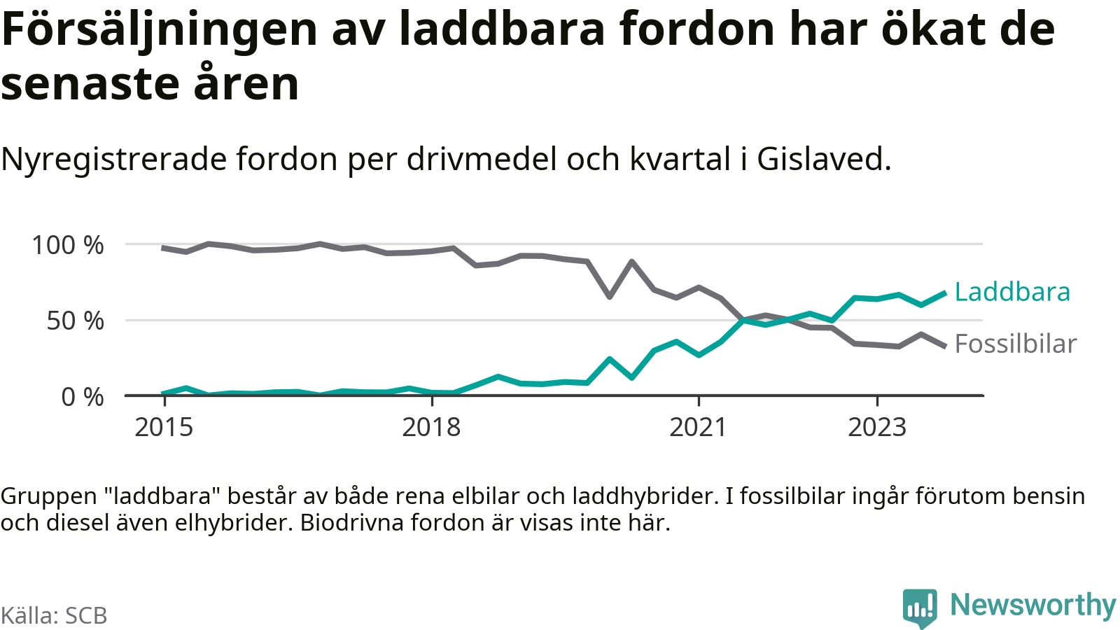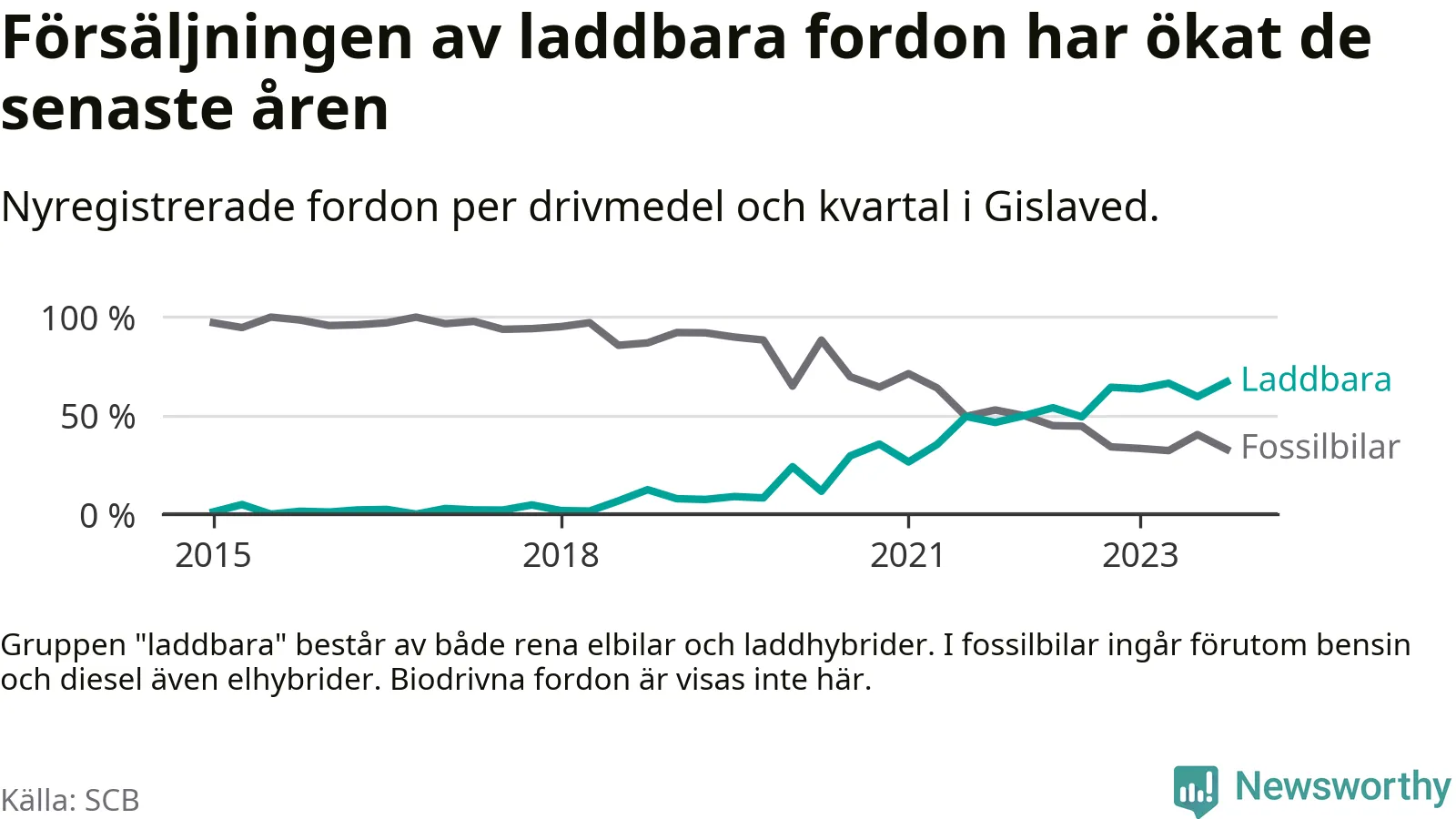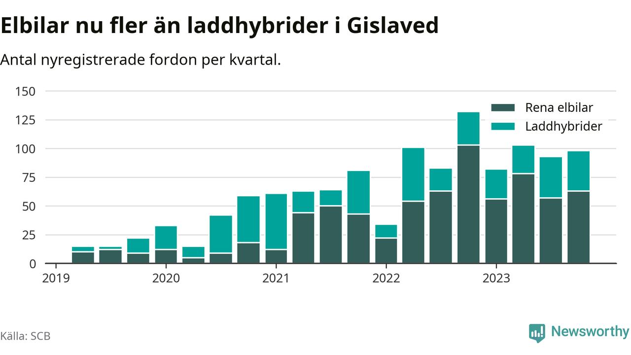Men i Gislaved noterades ett nytt rekord under fjärde kvartalet. Aldrig tidigare har laddbara bilar utgjort en så stor del av alla nya bilar.