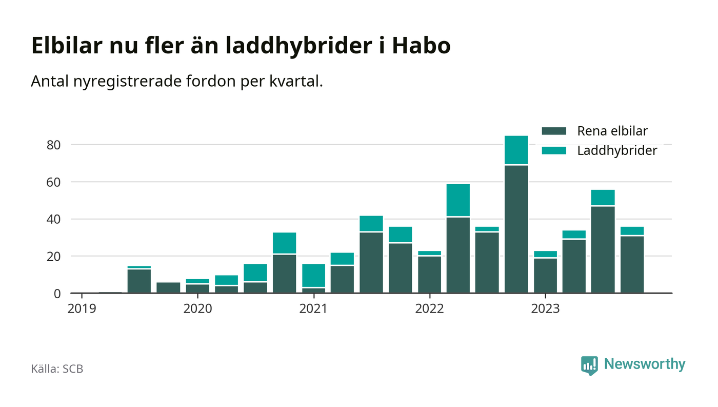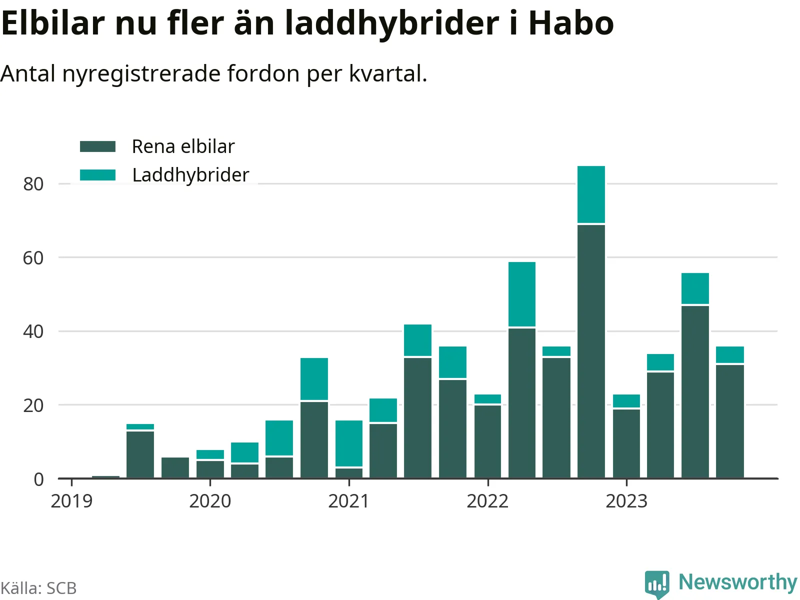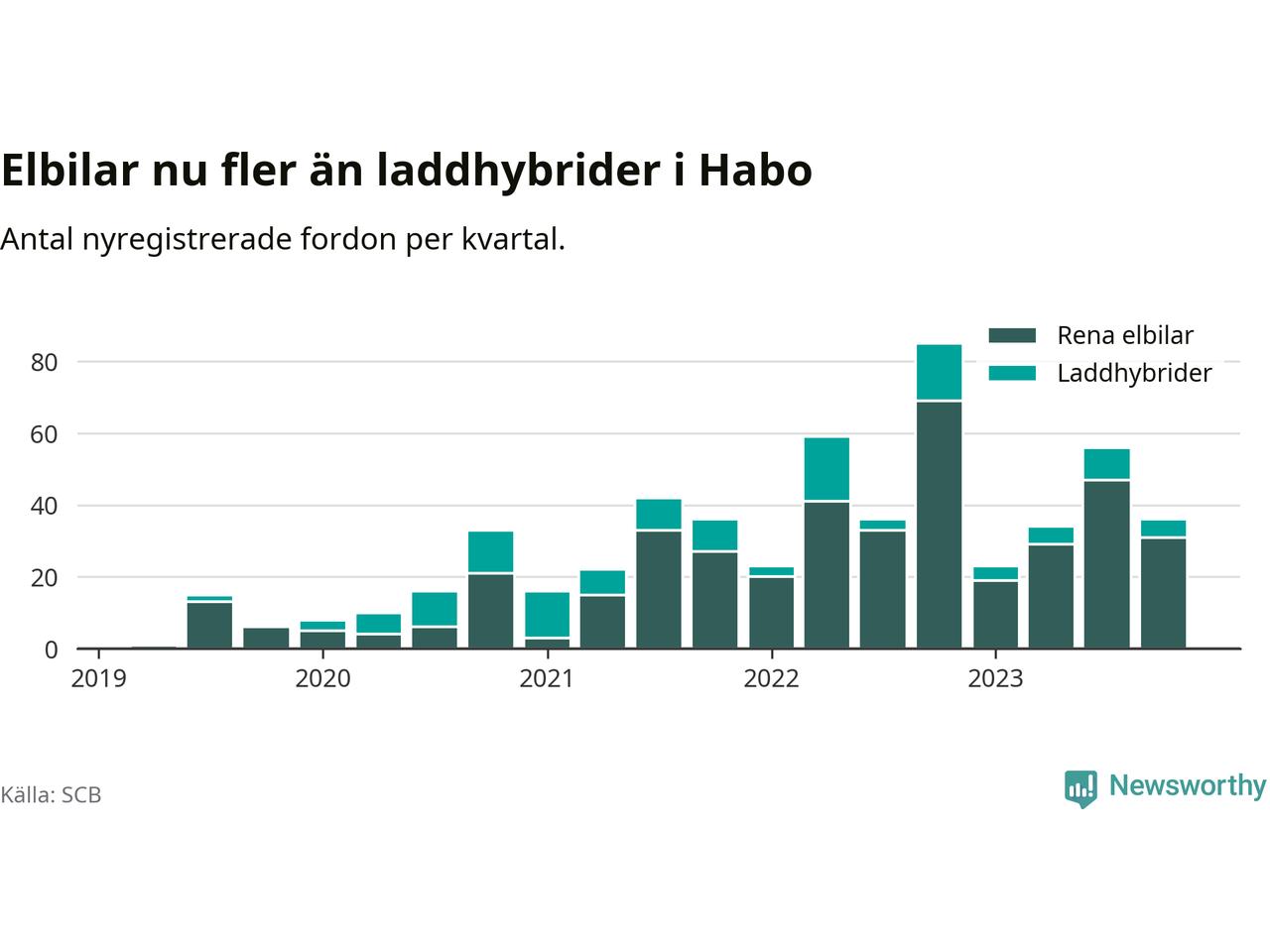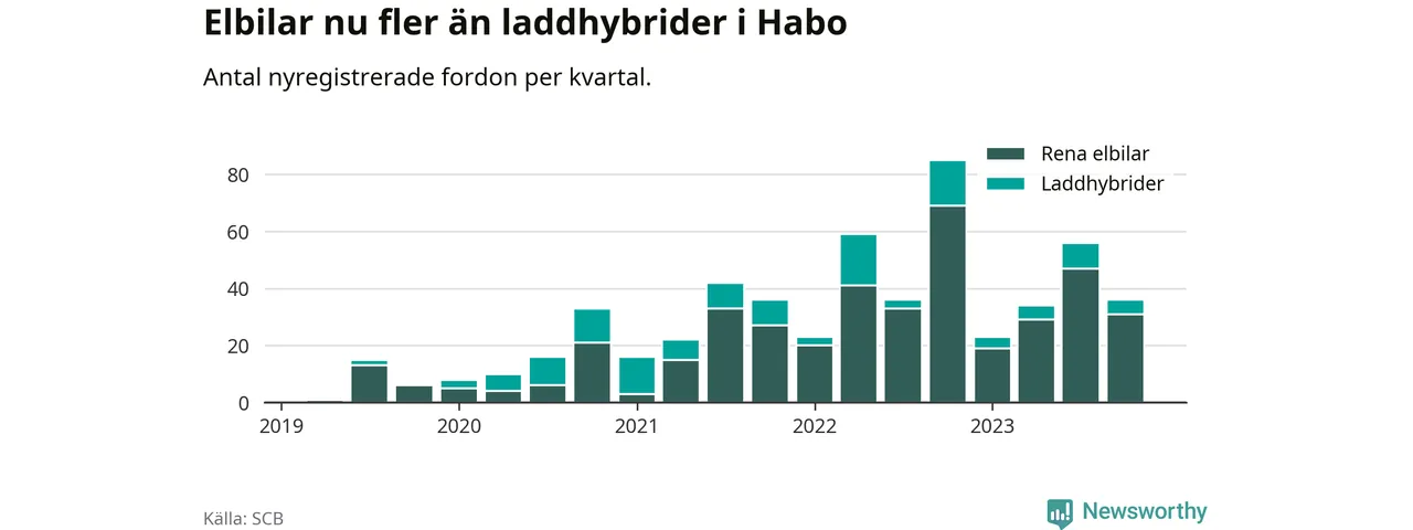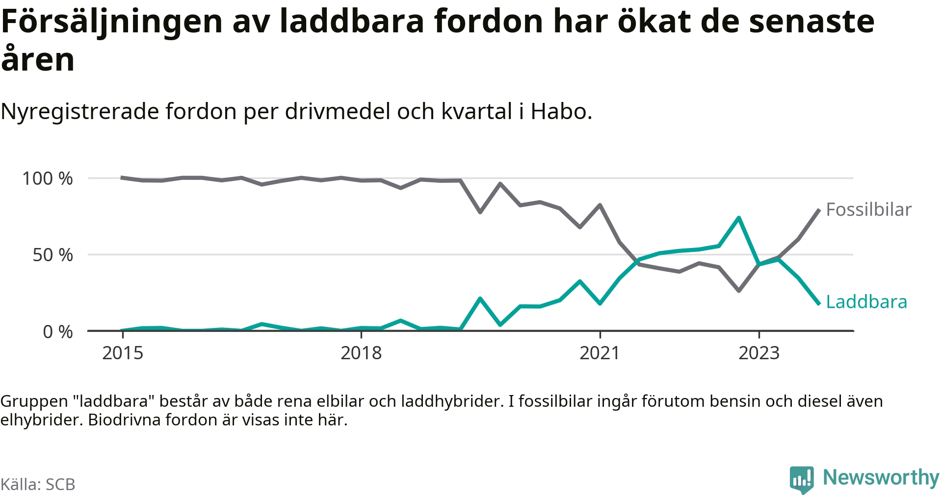 Under fjärde kvartalet 2023 var 18 procent av alla nyregistrerade personbilar i Habo laddbara (sammanlagt registrerades 199 nya bilar). Merparten av de laddbara bilarna var rena elbilar (16 procent av alla).