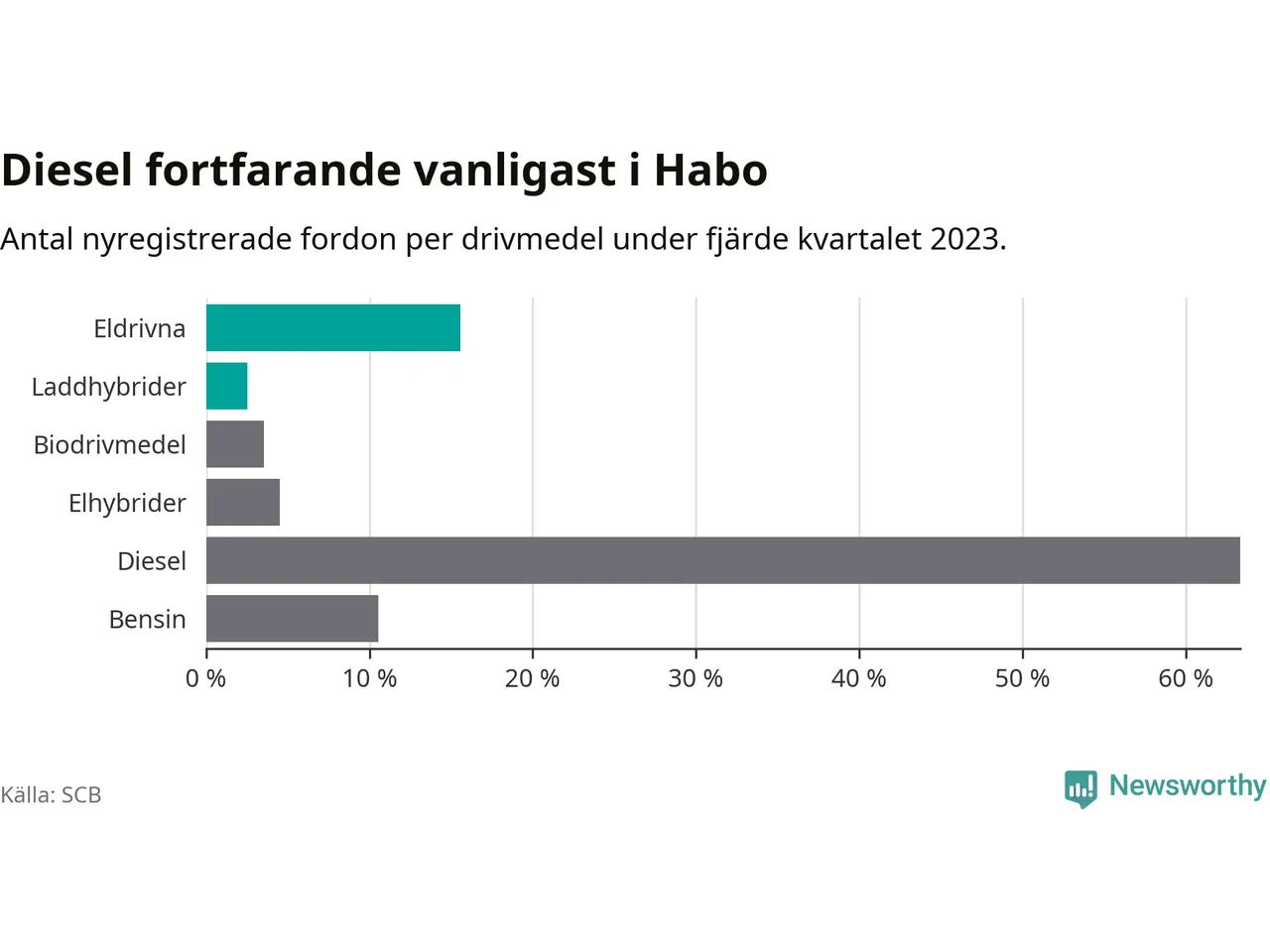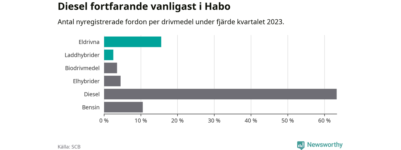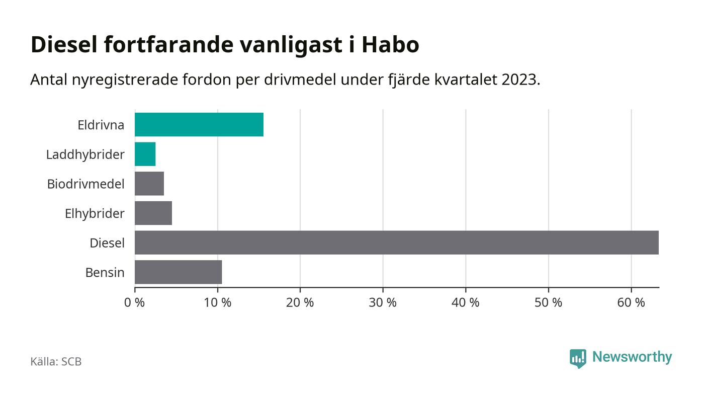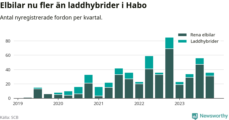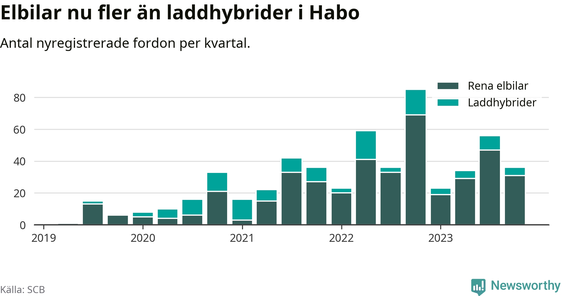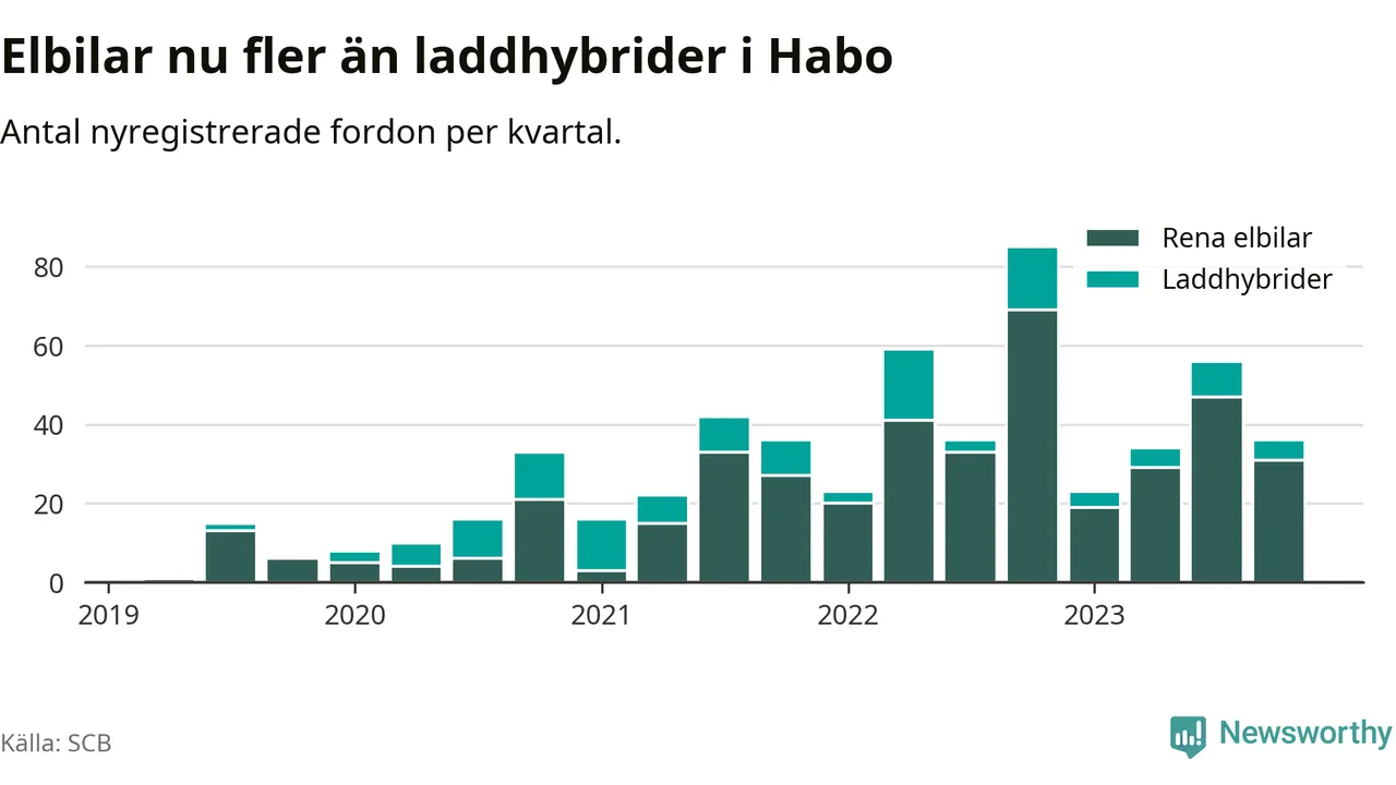 Under fjärde kvartalet 2023 var 18 procent av alla nyregistrerade personbilar i Habo laddbara (sammanlagt registrerades 199 nya bilar). Merparten av de laddbara bilarna var rena elbilar (16 procent av alla).
