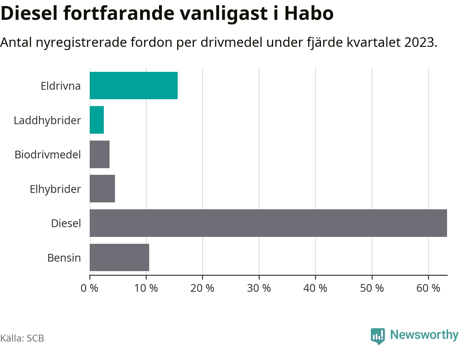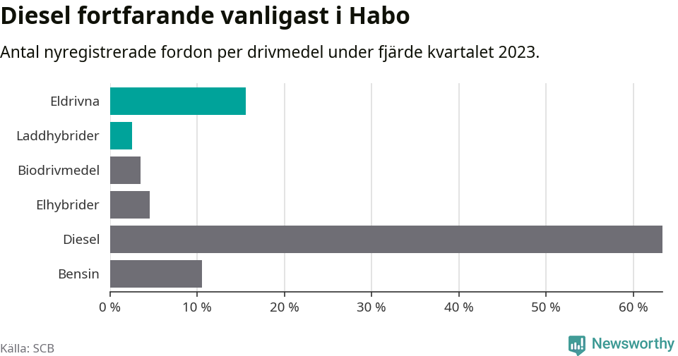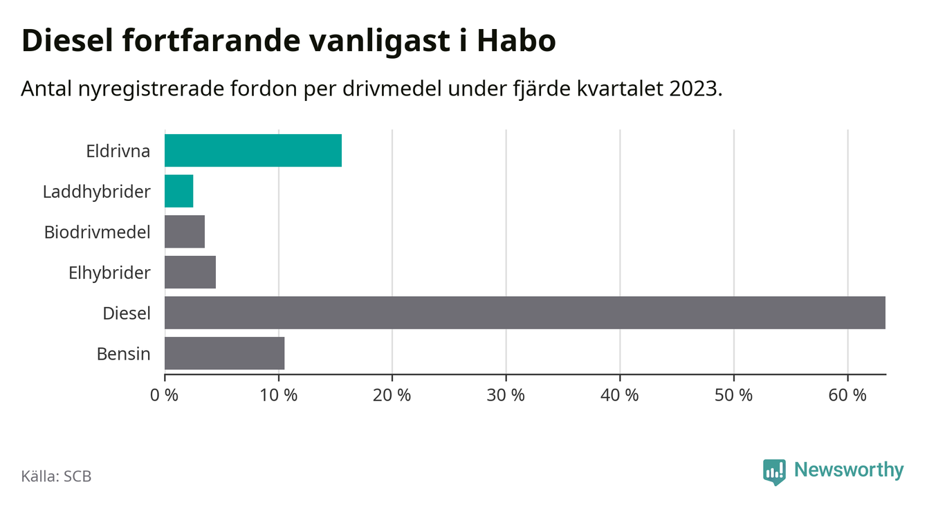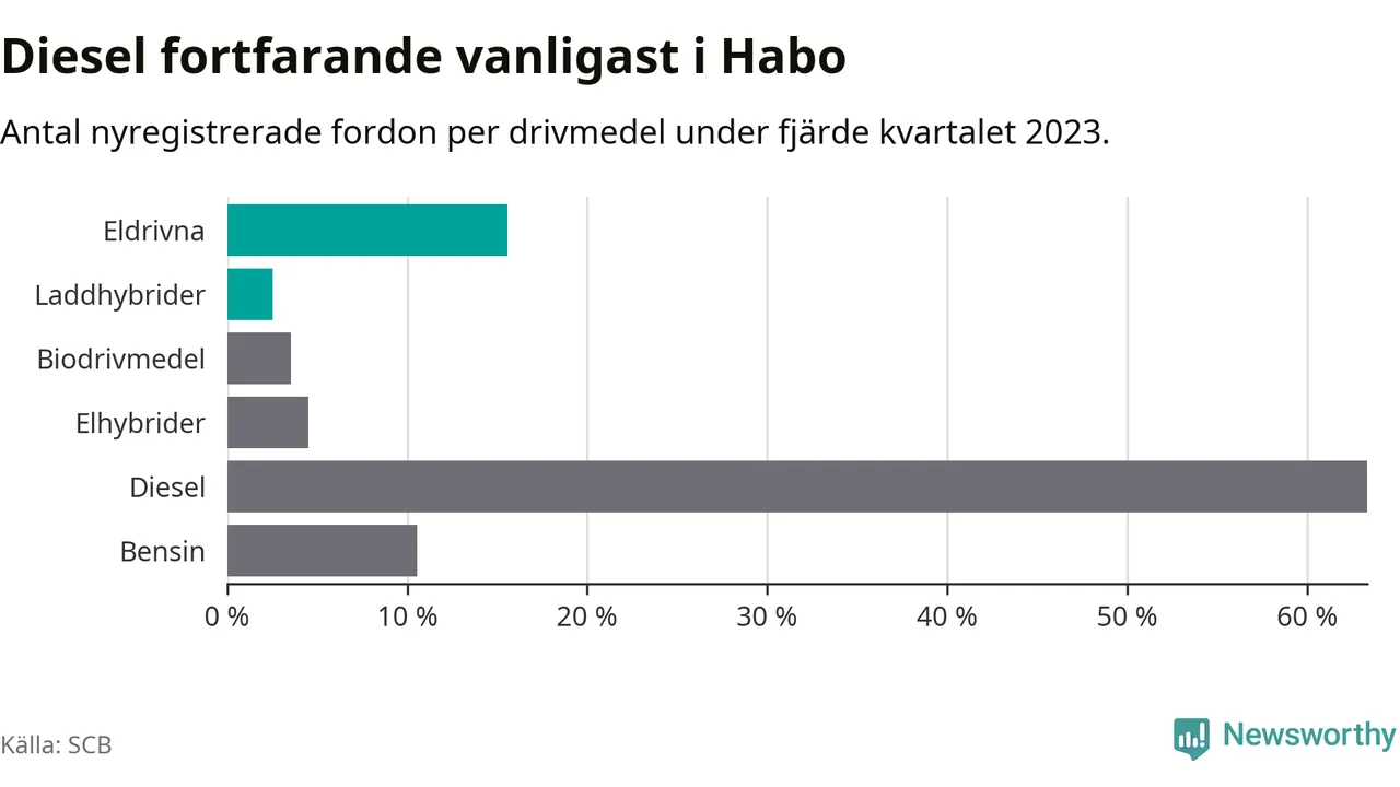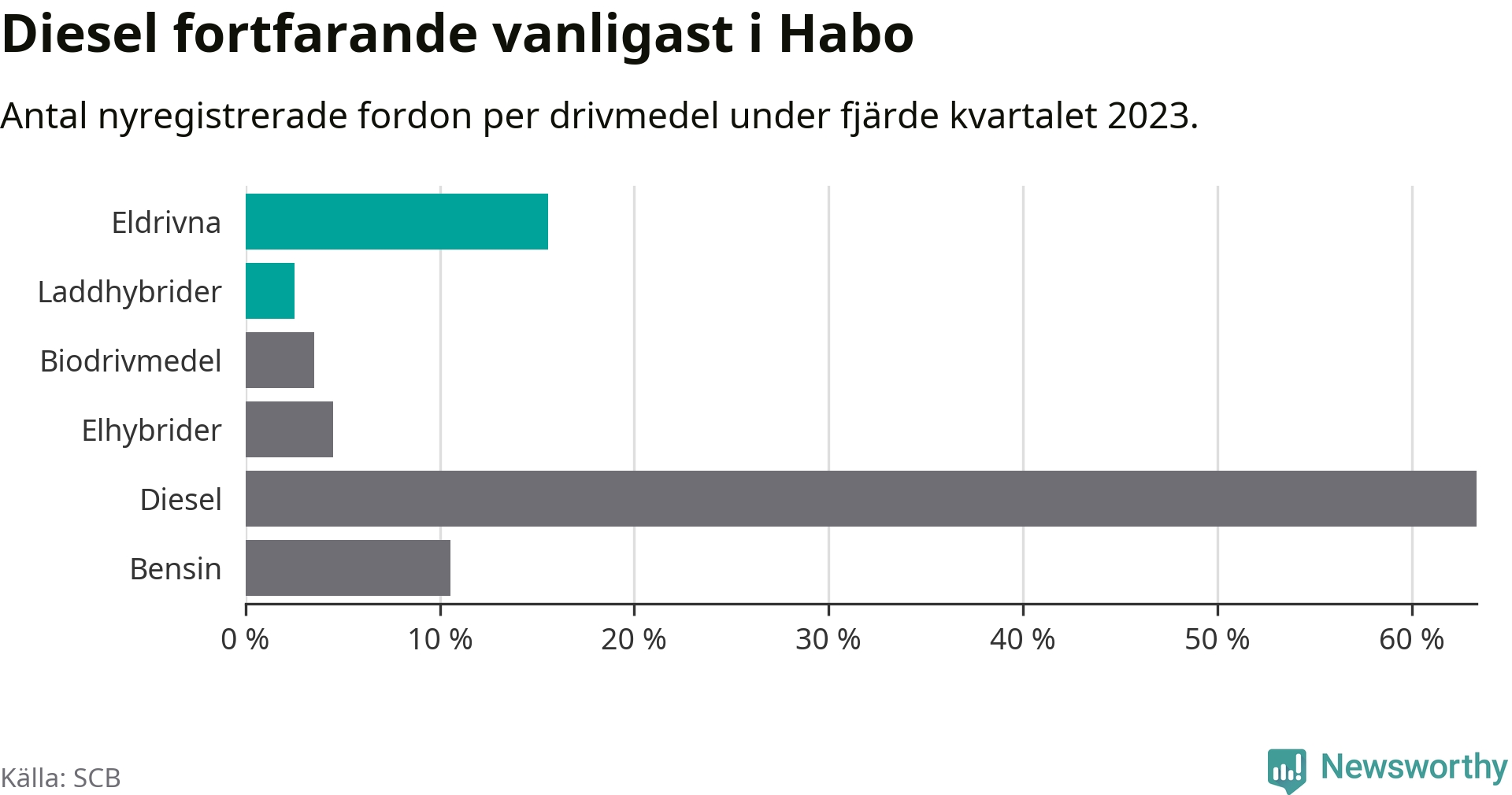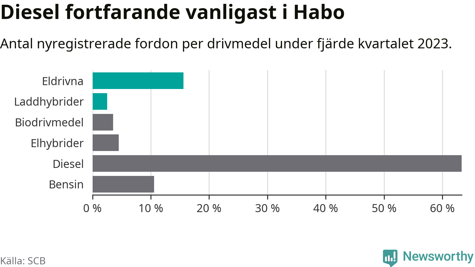 Under fjärde kvartalet 2023 var 18 procent av alla nyregistrerade personbilar i Habo laddbara (sammanlagt registrerades 199 nya bilar). Merparten av de laddbara bilarna var rena elbilar (16 procent av alla).