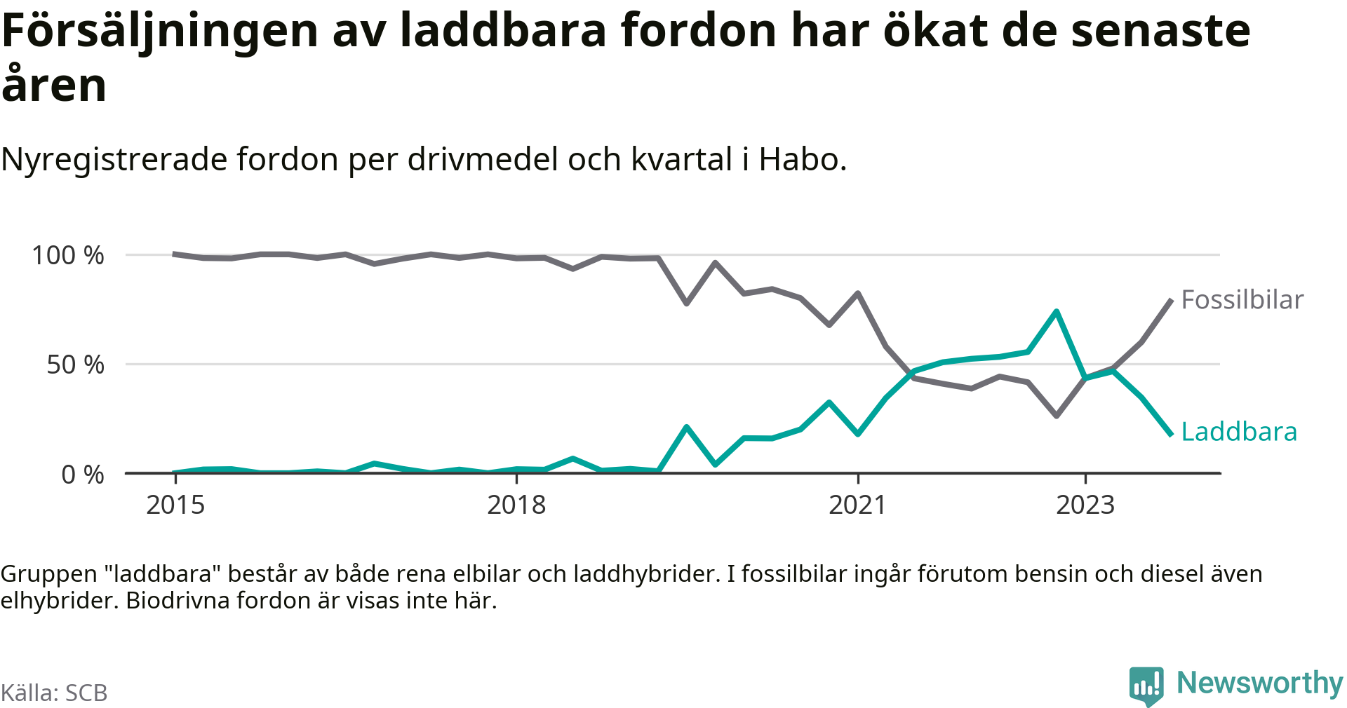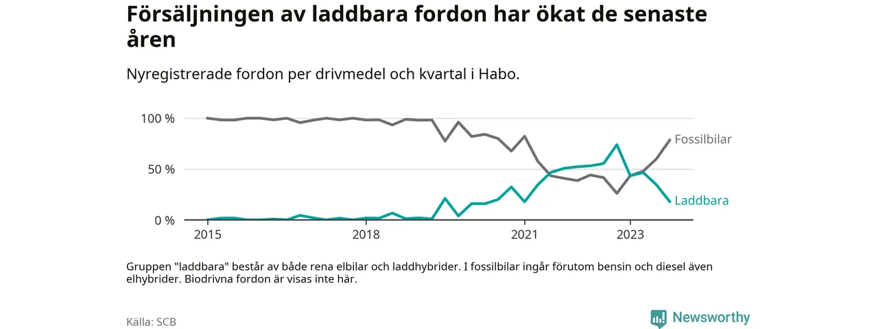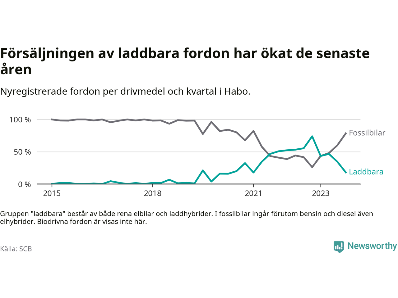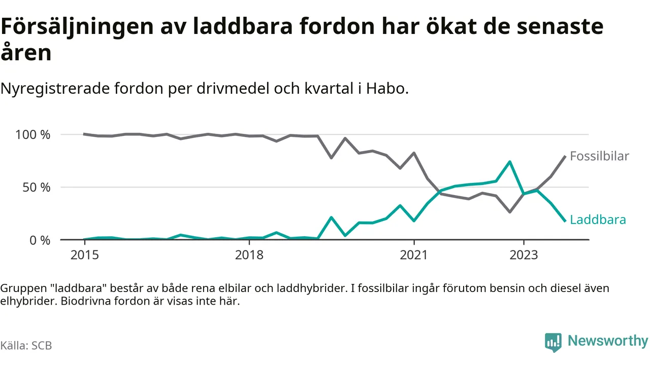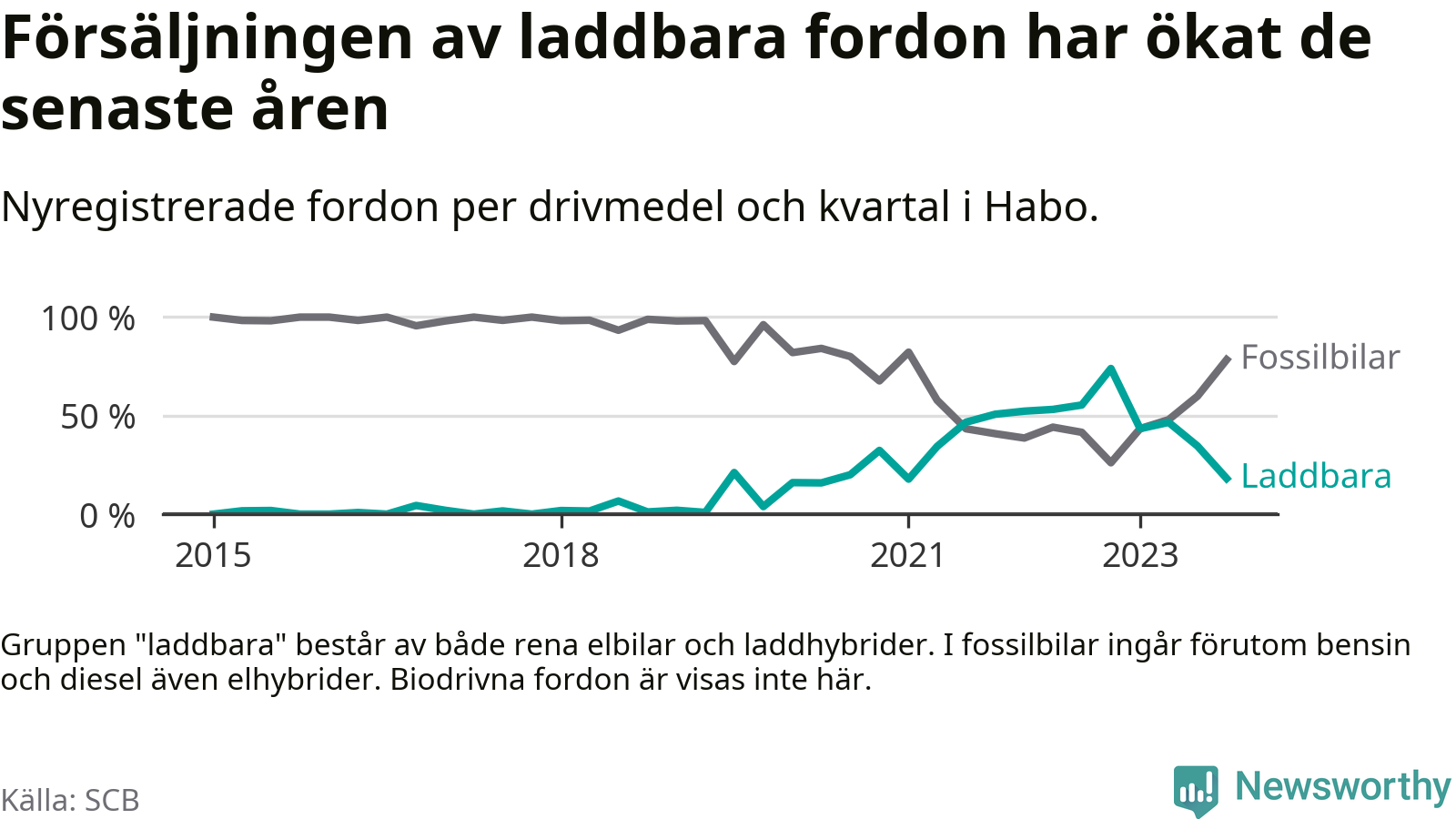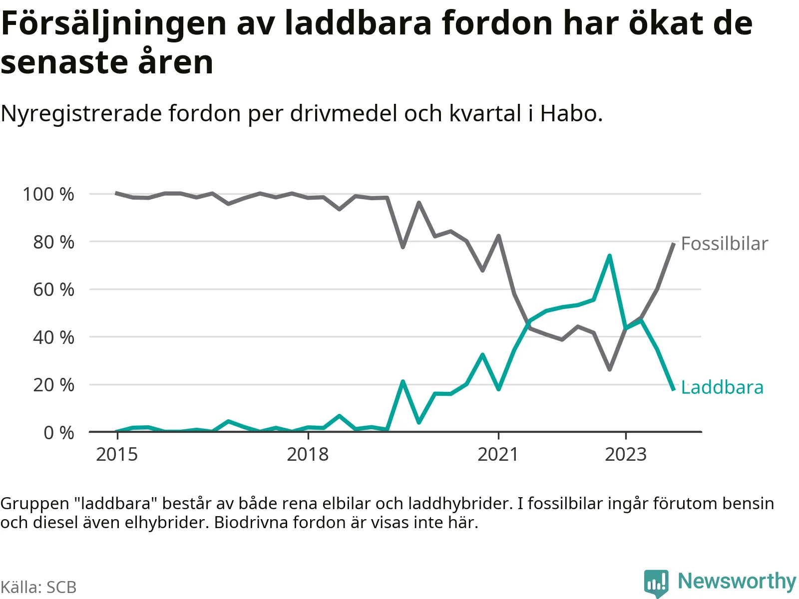 I Habo var andelen laddbara bilar under fjärde kvartalet också lägre än under fjärde kvartalet 2022 då rekordet hittills noterades (74 procent).