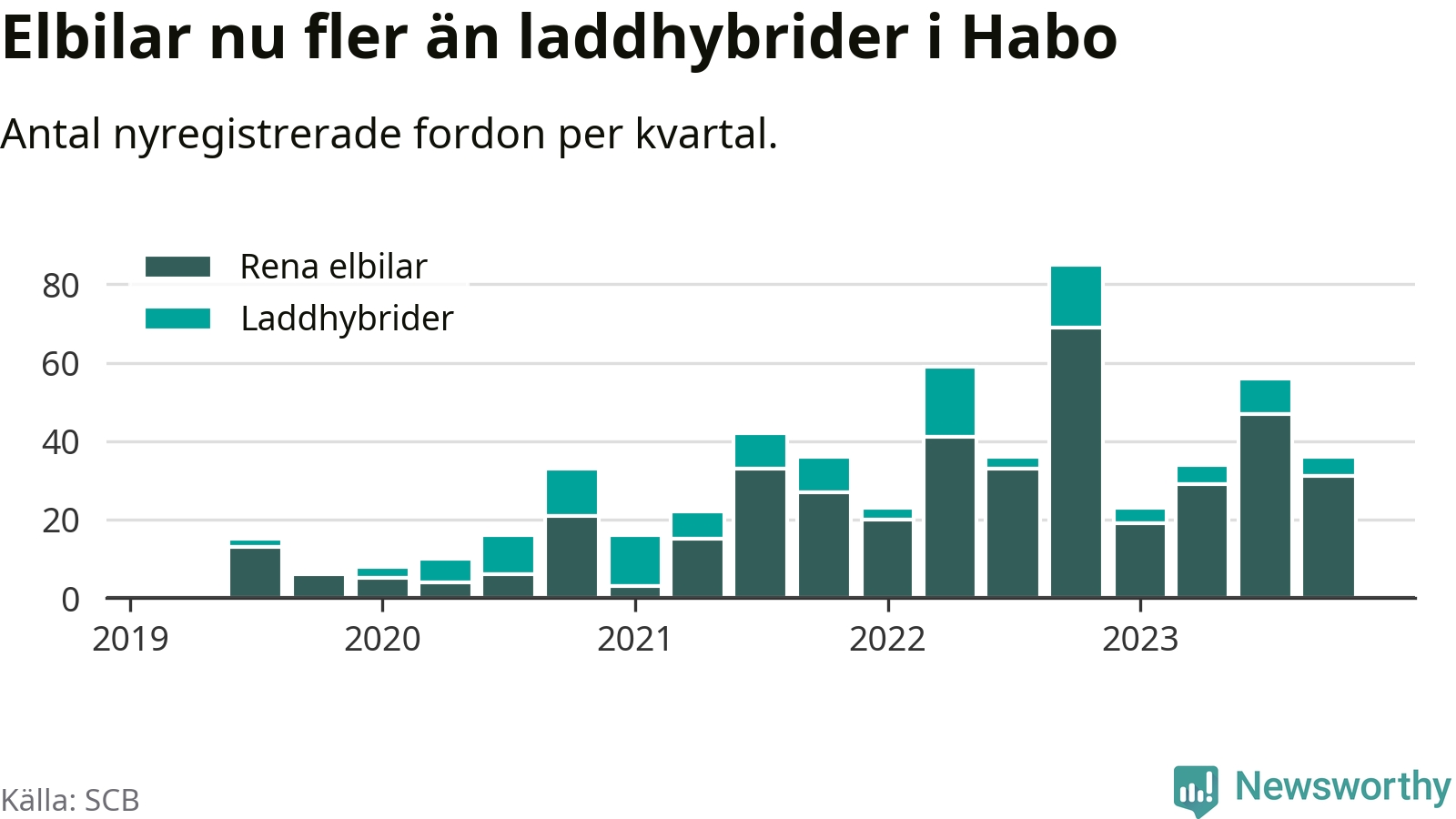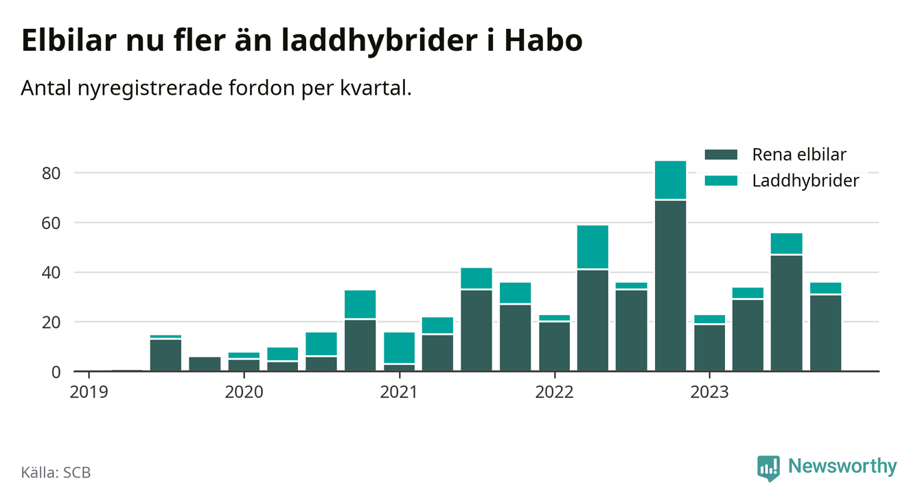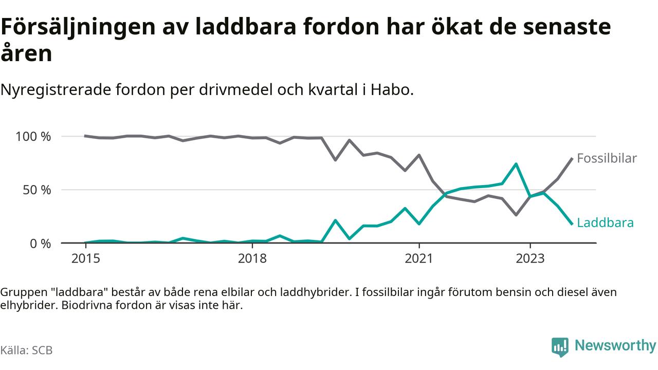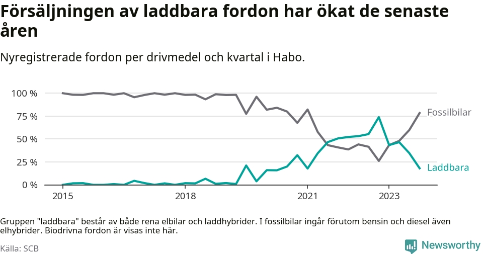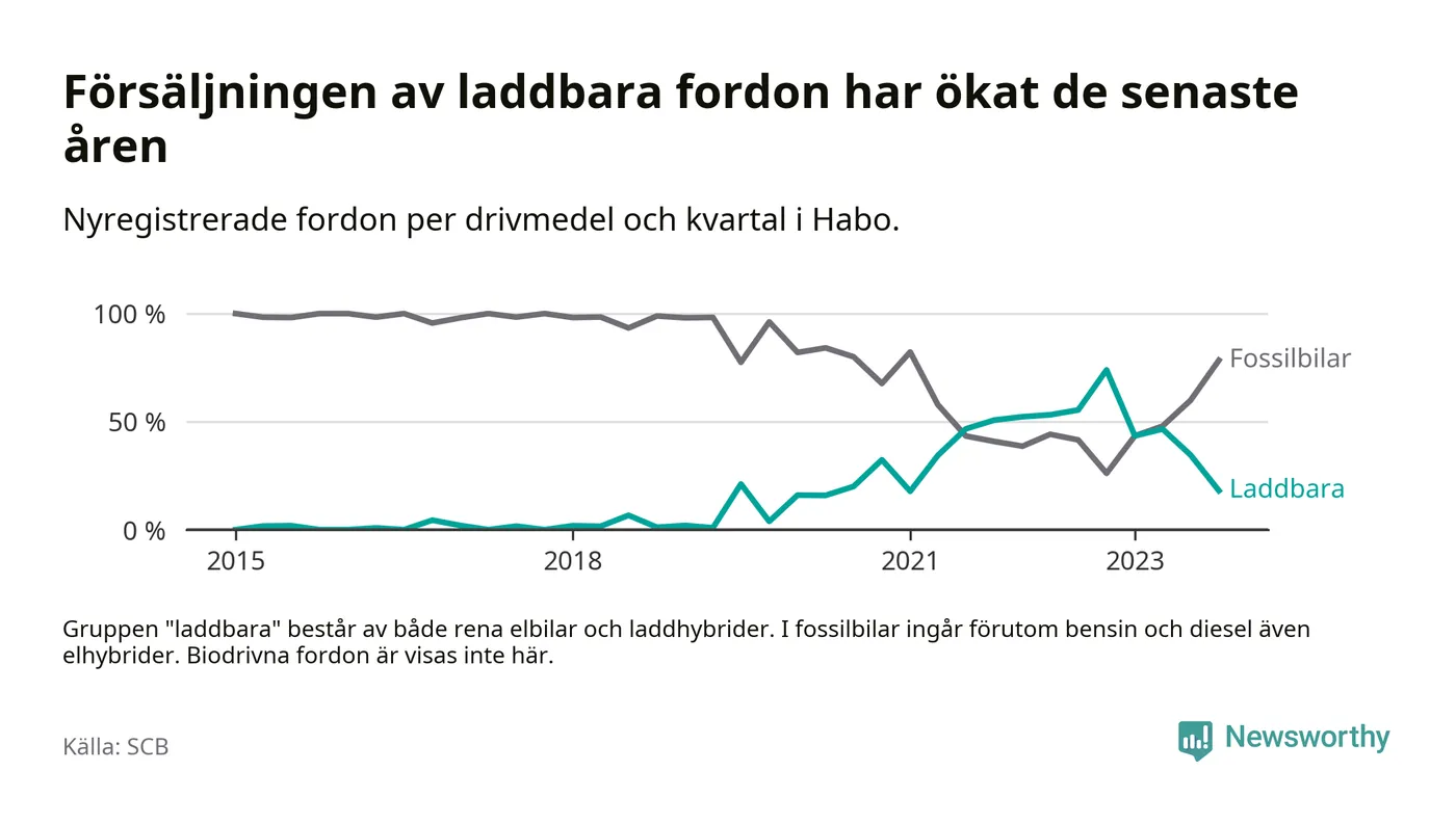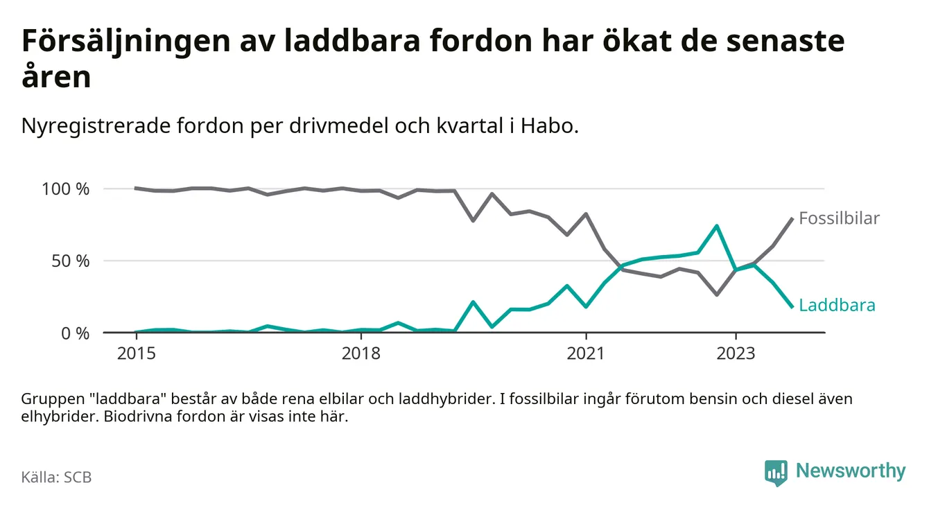 I Habo var andelen laddbara bilar under fjärde kvartalet också lägre än under fjärde kvartalet 2022 då rekordet hittills noterades (74 procent).