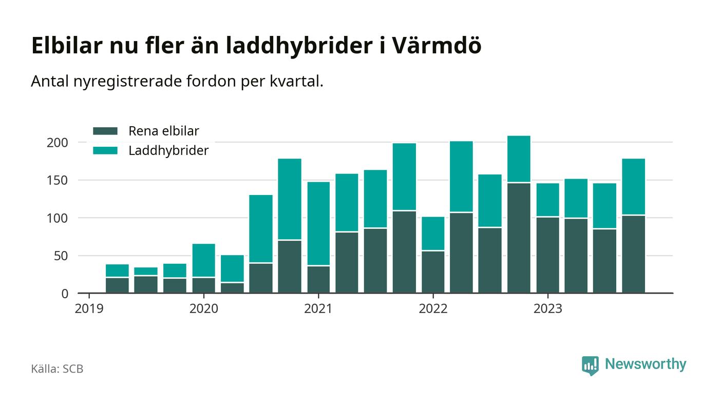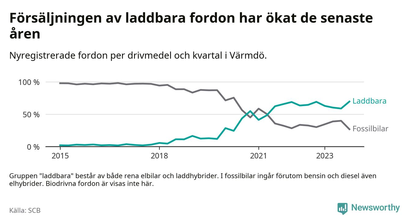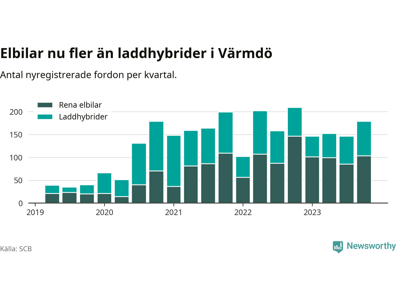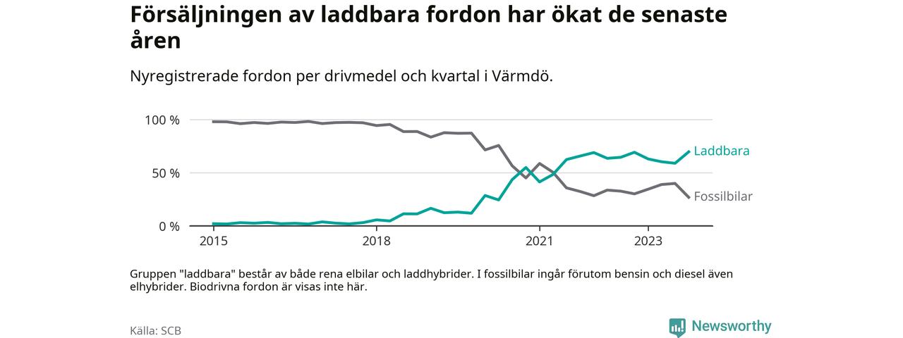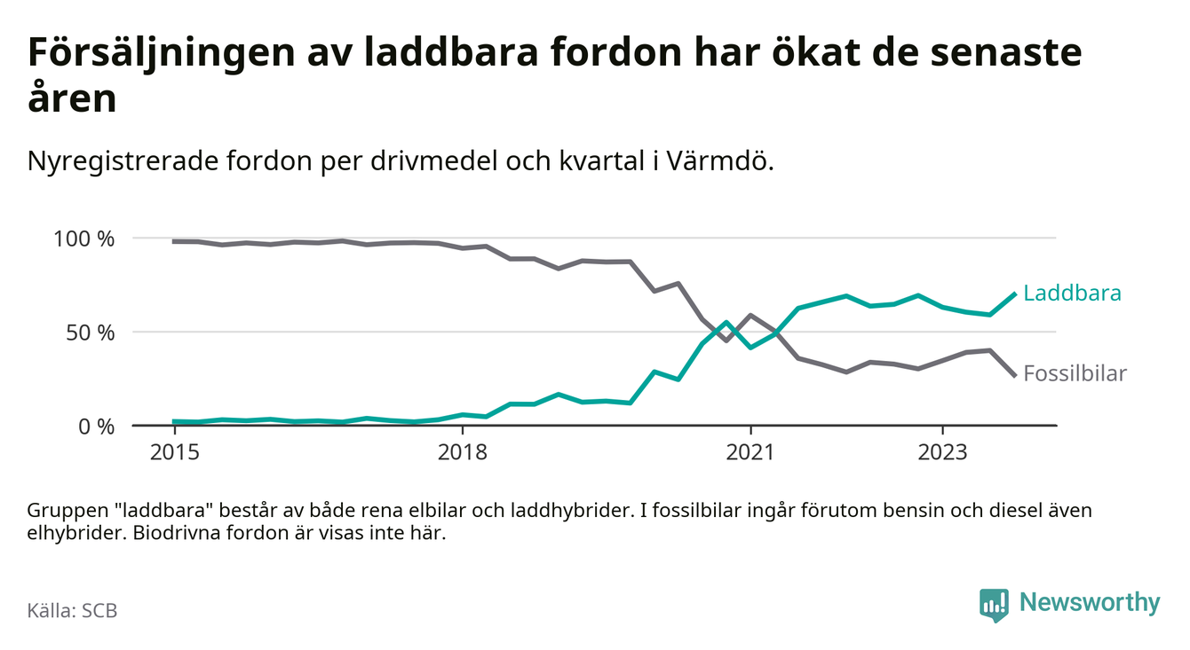 Under fjärde kvartalet 2023 var 70 procent av alla nyregistrerade personbilar i Värmdö laddbara (sammanlagt registrerades 257 nya bilar). Merparten av de laddbara bilarna var rena elbilar (40 procent av alla).