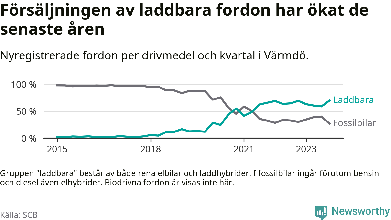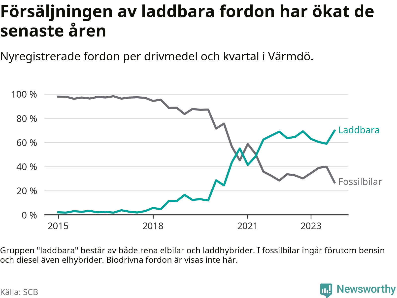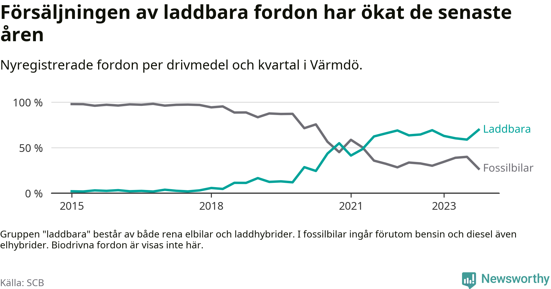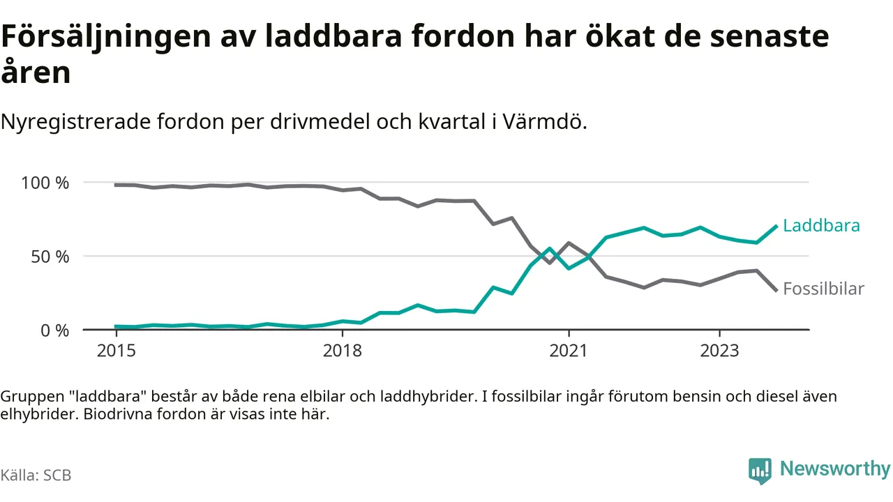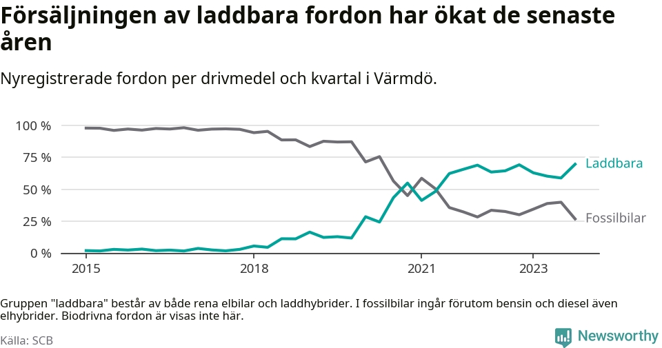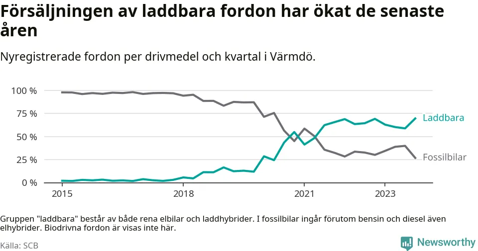 Under fjärde kvartalet 2023 var 70 procent av alla nyregistrerade personbilar i Värmdö laddbara (sammanlagt registrerades 257 nya bilar). Merparten av de laddbara bilarna var rena elbilar (40 procent av alla).