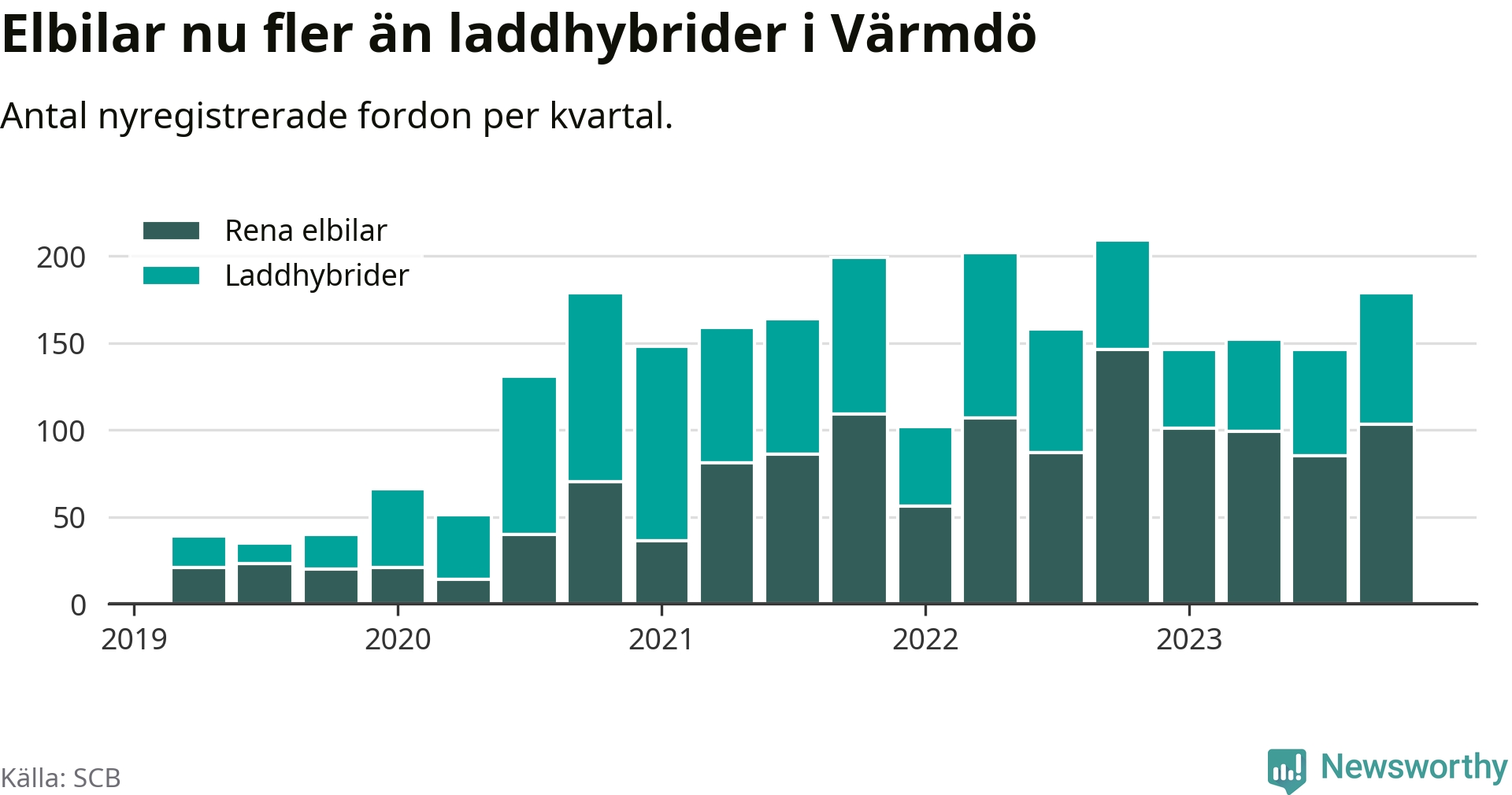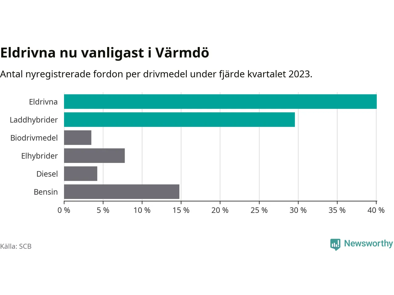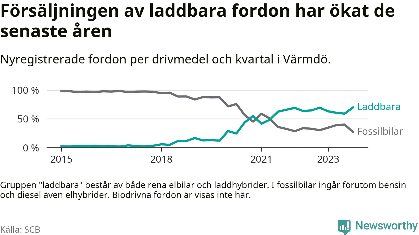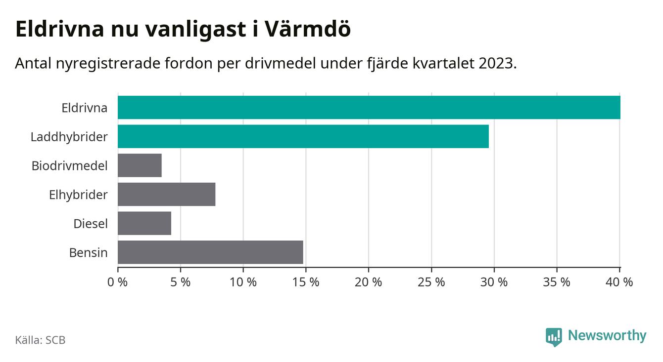 Under fjärde kvartalet 2023 var 70 procent av alla nyregistrerade personbilar i Värmdö laddbara (sammanlagt registrerades 257 nya bilar). Merparten av de laddbara bilarna var rena elbilar (40 procent av alla).