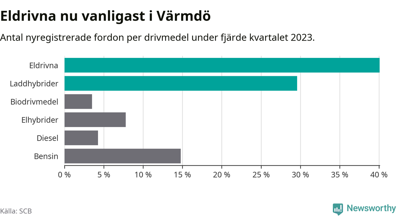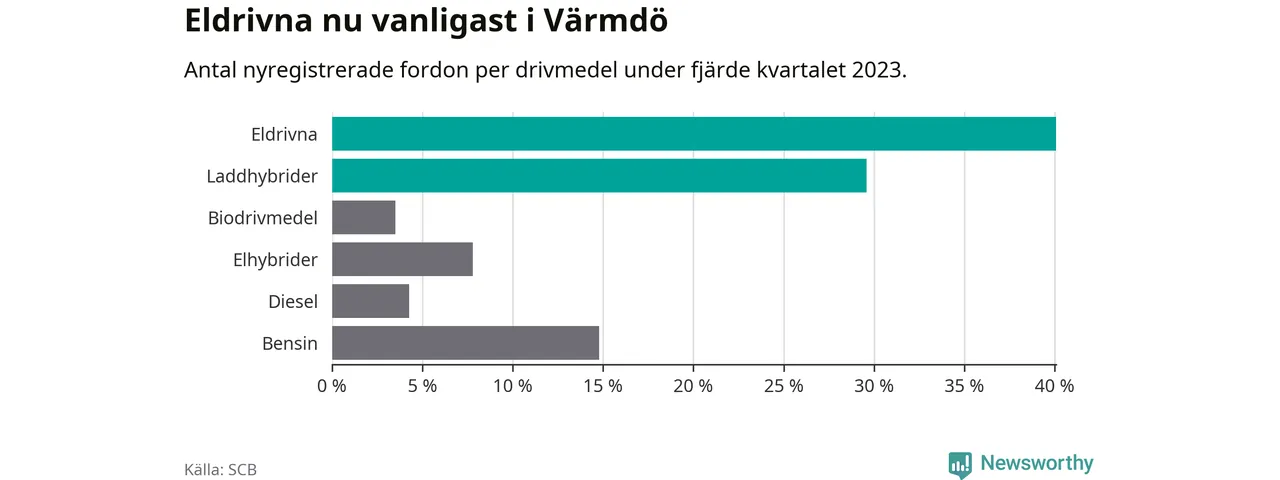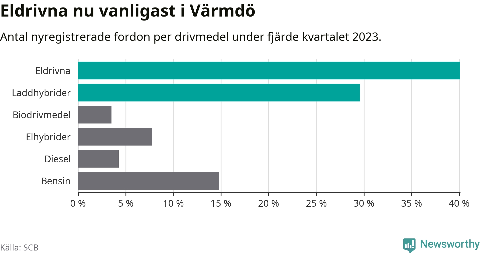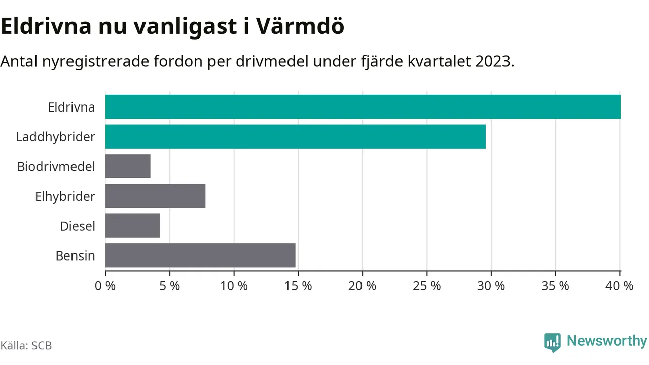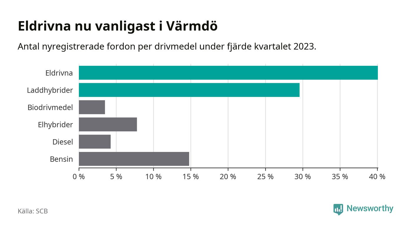 Under fjärde kvartalet 2023 var 70 procent av alla nyregistrerade personbilar i Värmdö laddbara (sammanlagt registrerades 257 nya bilar). Merparten av de laddbara bilarna var rena elbilar (40 procent av alla).