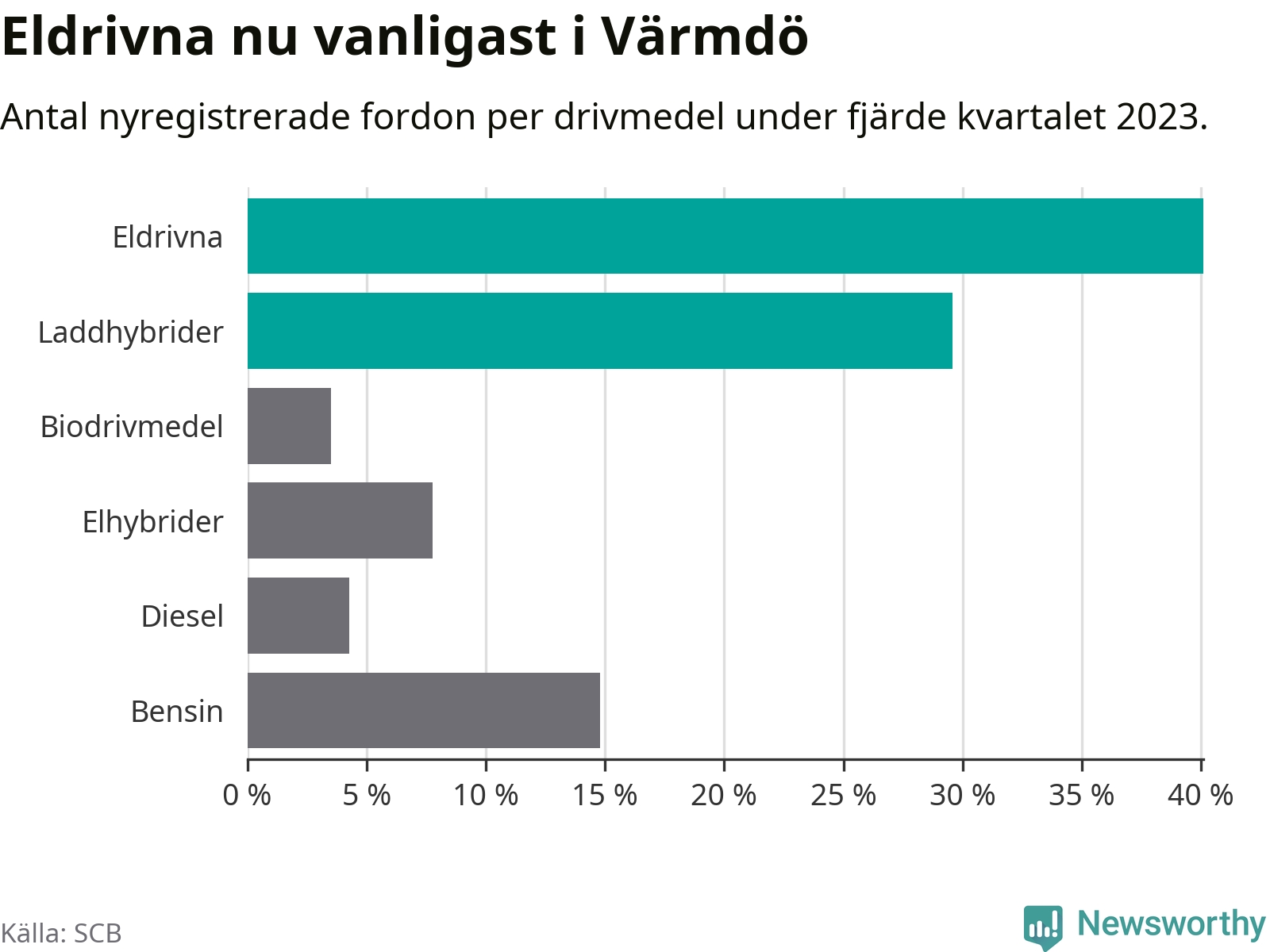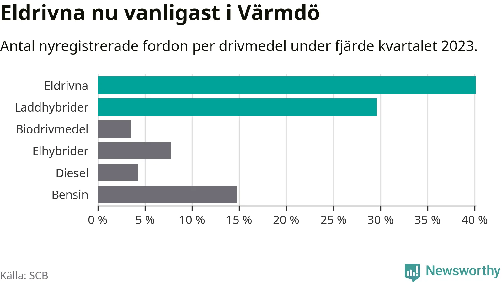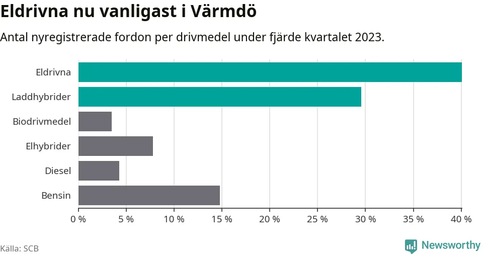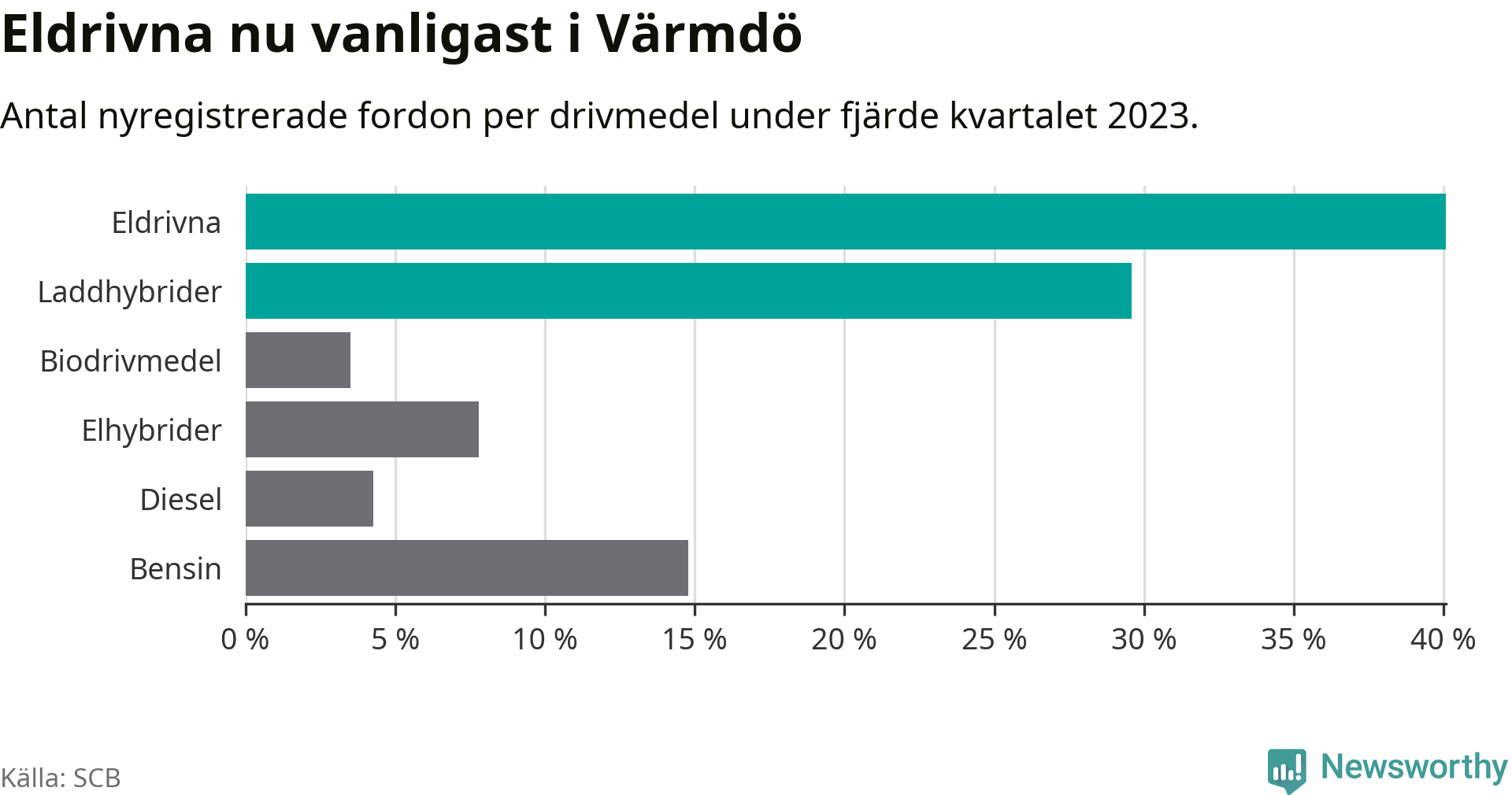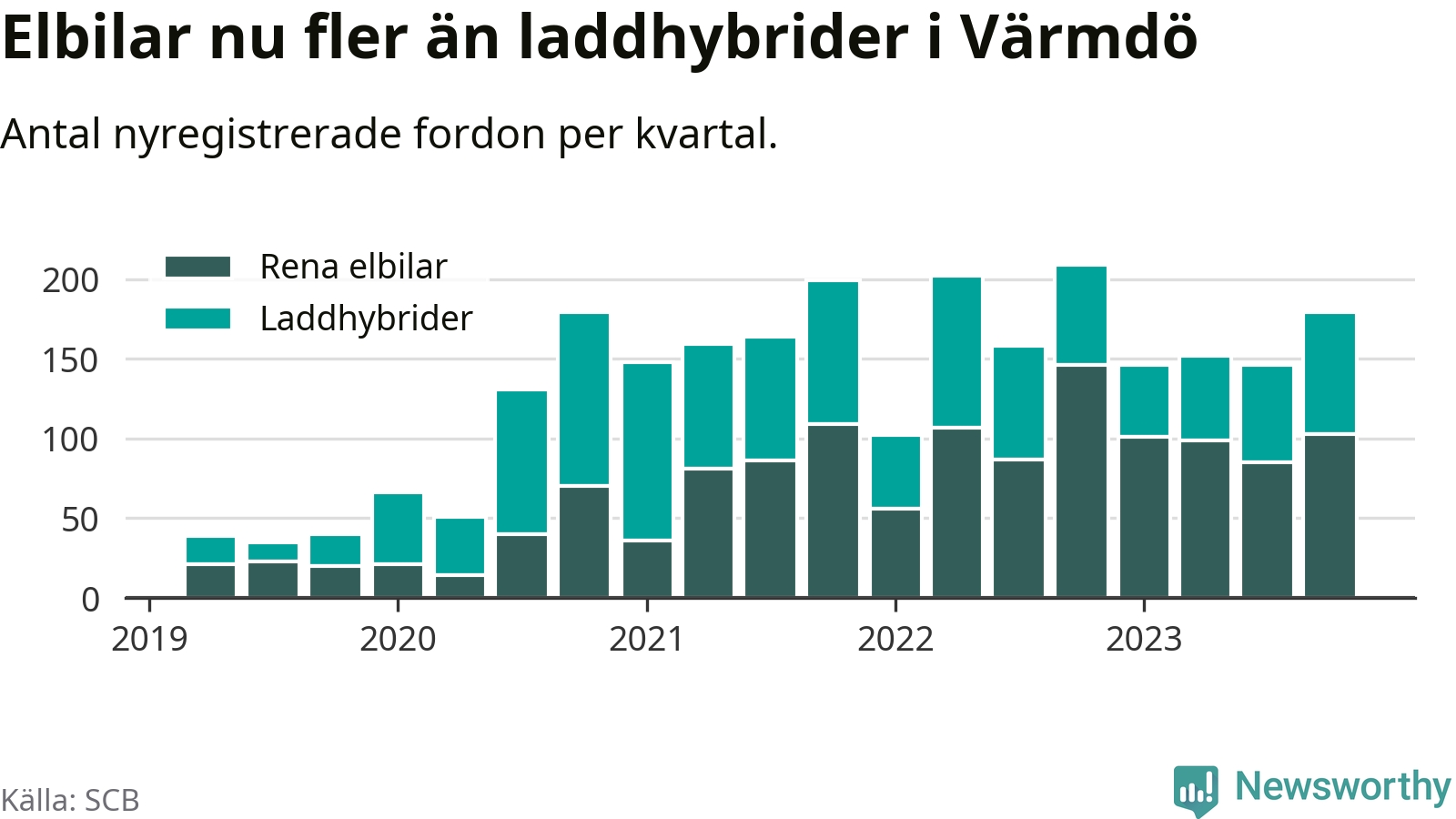 Under fjärde kvartalet 2023 var 70 procent av alla nyregistrerade personbilar i Värmdö laddbara (sammanlagt registrerades 257 nya bilar). Merparten av de laddbara bilarna var rena elbilar (40 procent av alla).