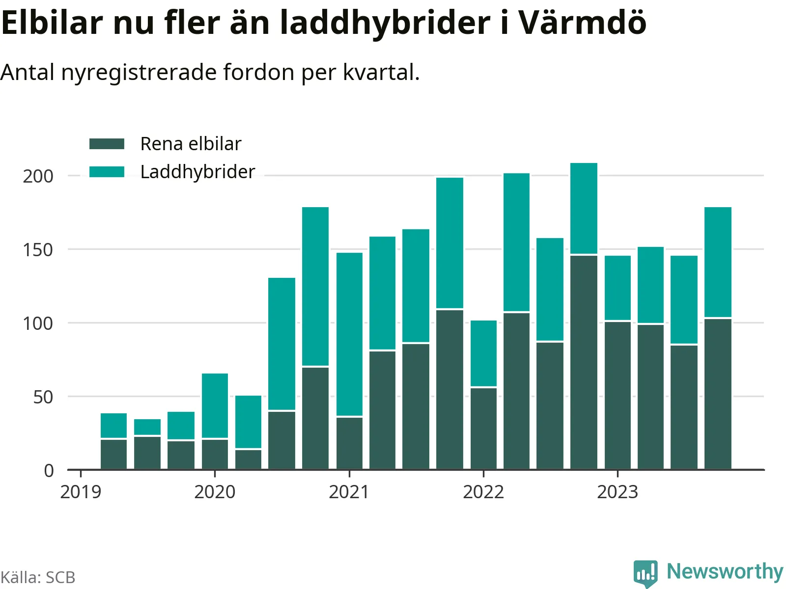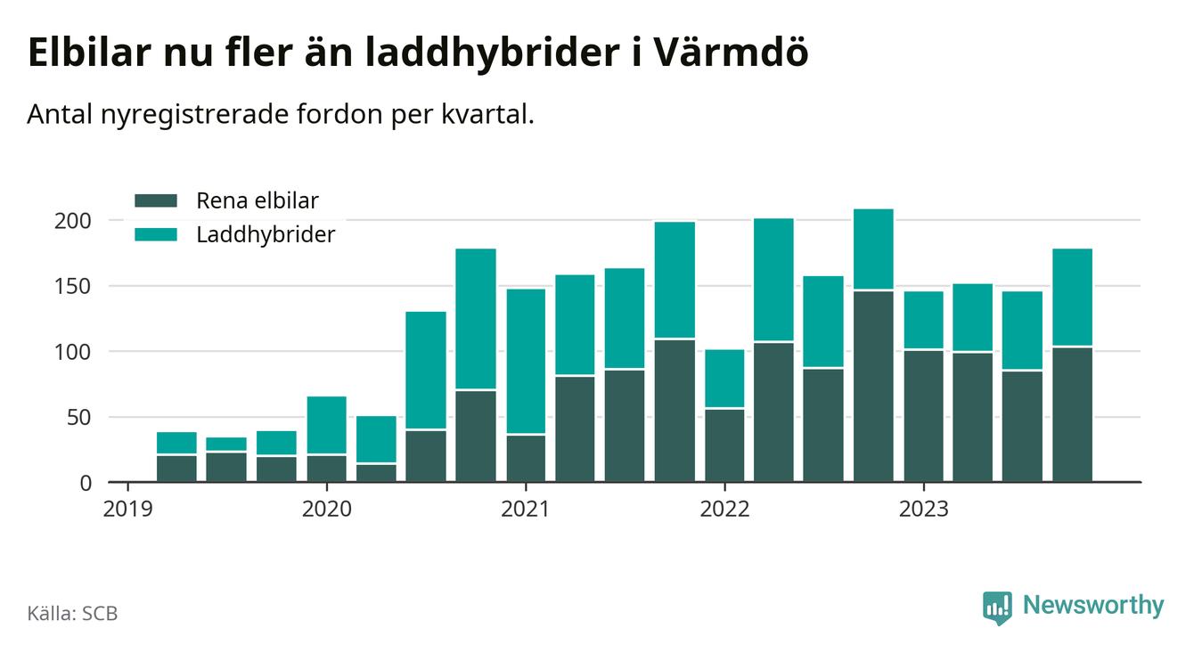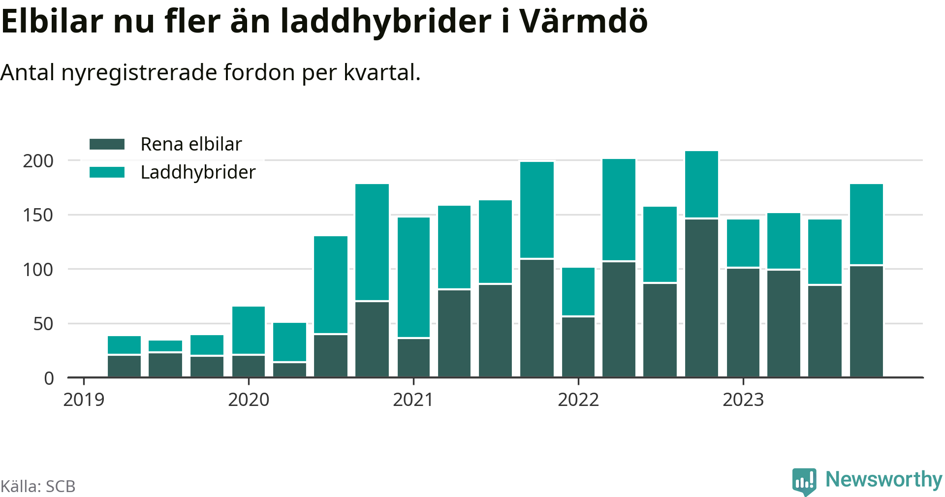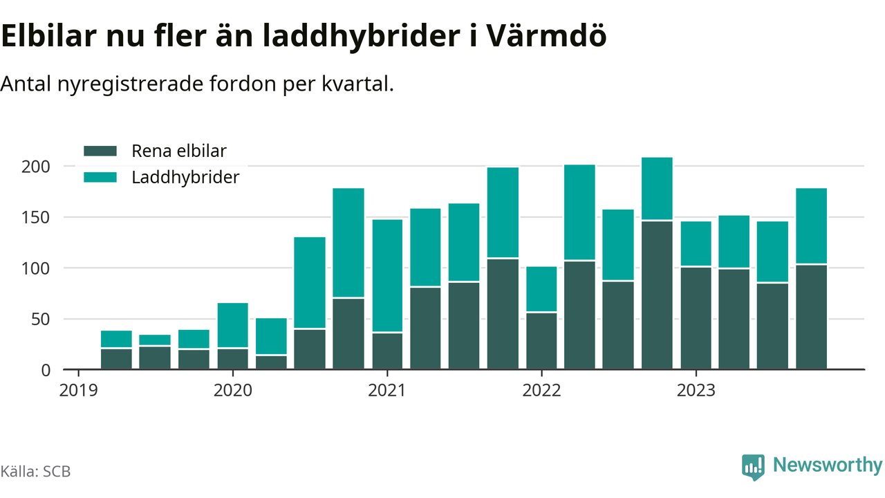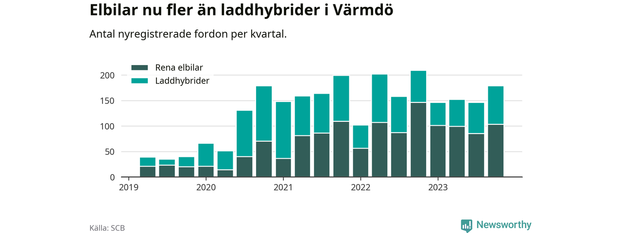 Men i Värmdö noterades ett nytt rekord under fjärde kvartalet. Aldrig tidigare har laddbara bilar utgjort en så stor del av alla nya bilar.