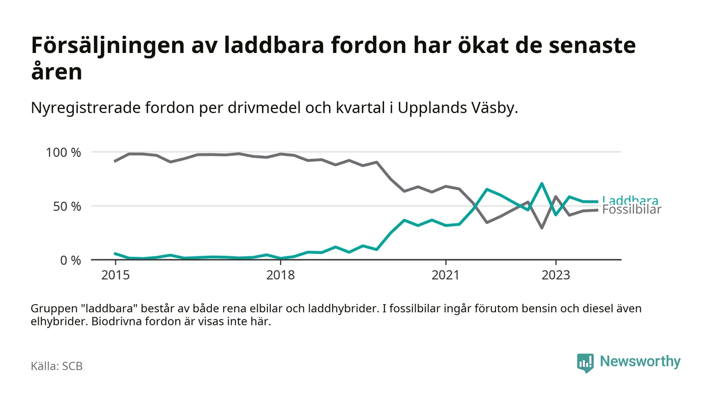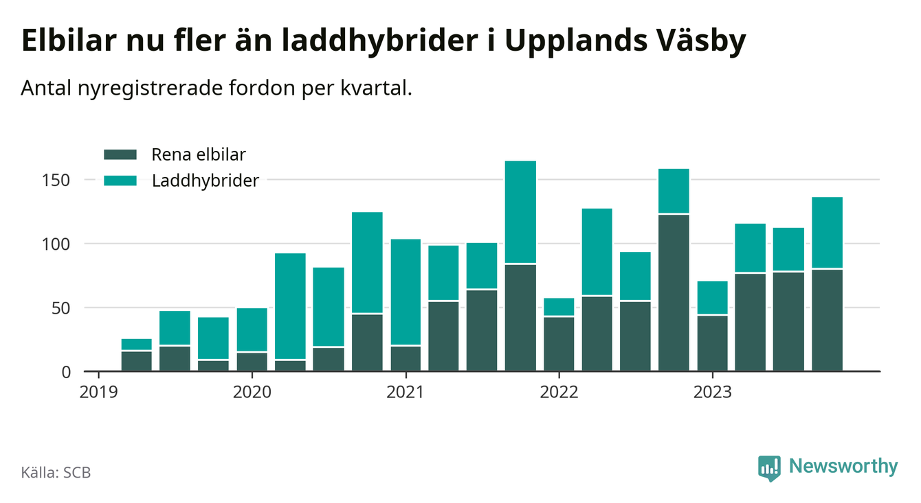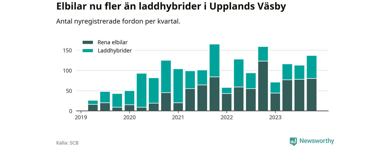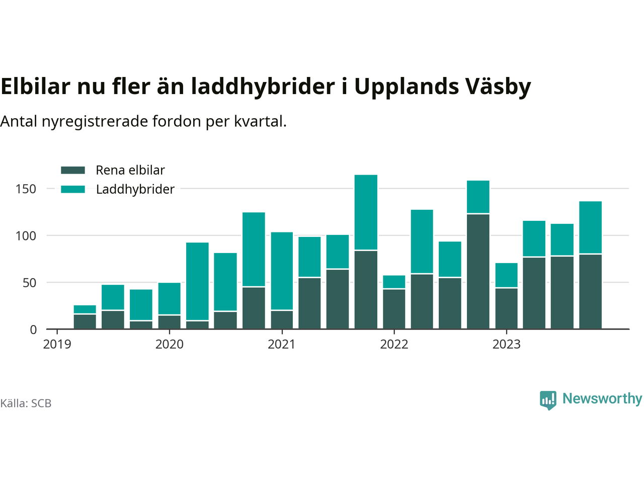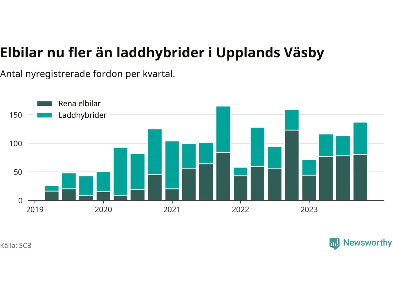 Under fjärde kvartalet 2023 var 54 procent av alla nyregistrerade personbilar i Upplands Väsby laddbara (sammanlagt registrerades 255 nya bilar). Merparten av de laddbara bilarna var rena elbilar (31 procent av alla).