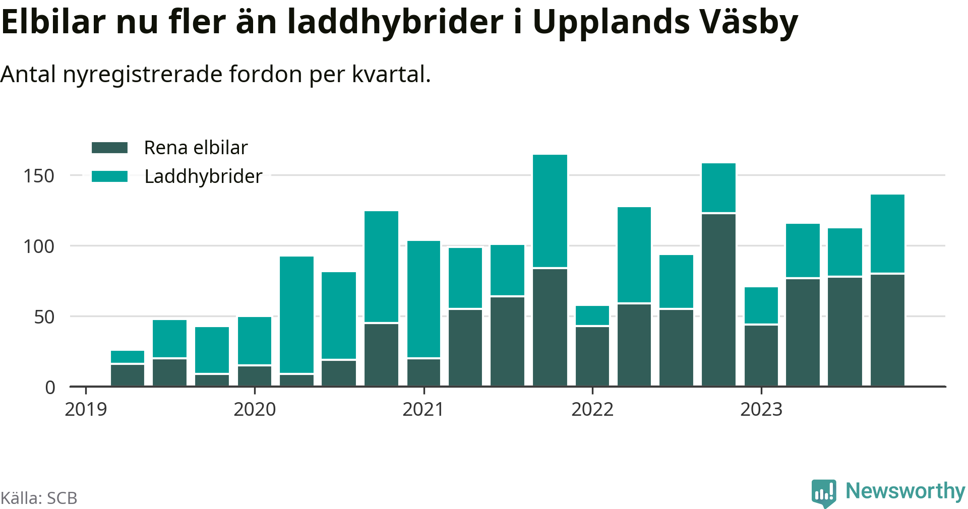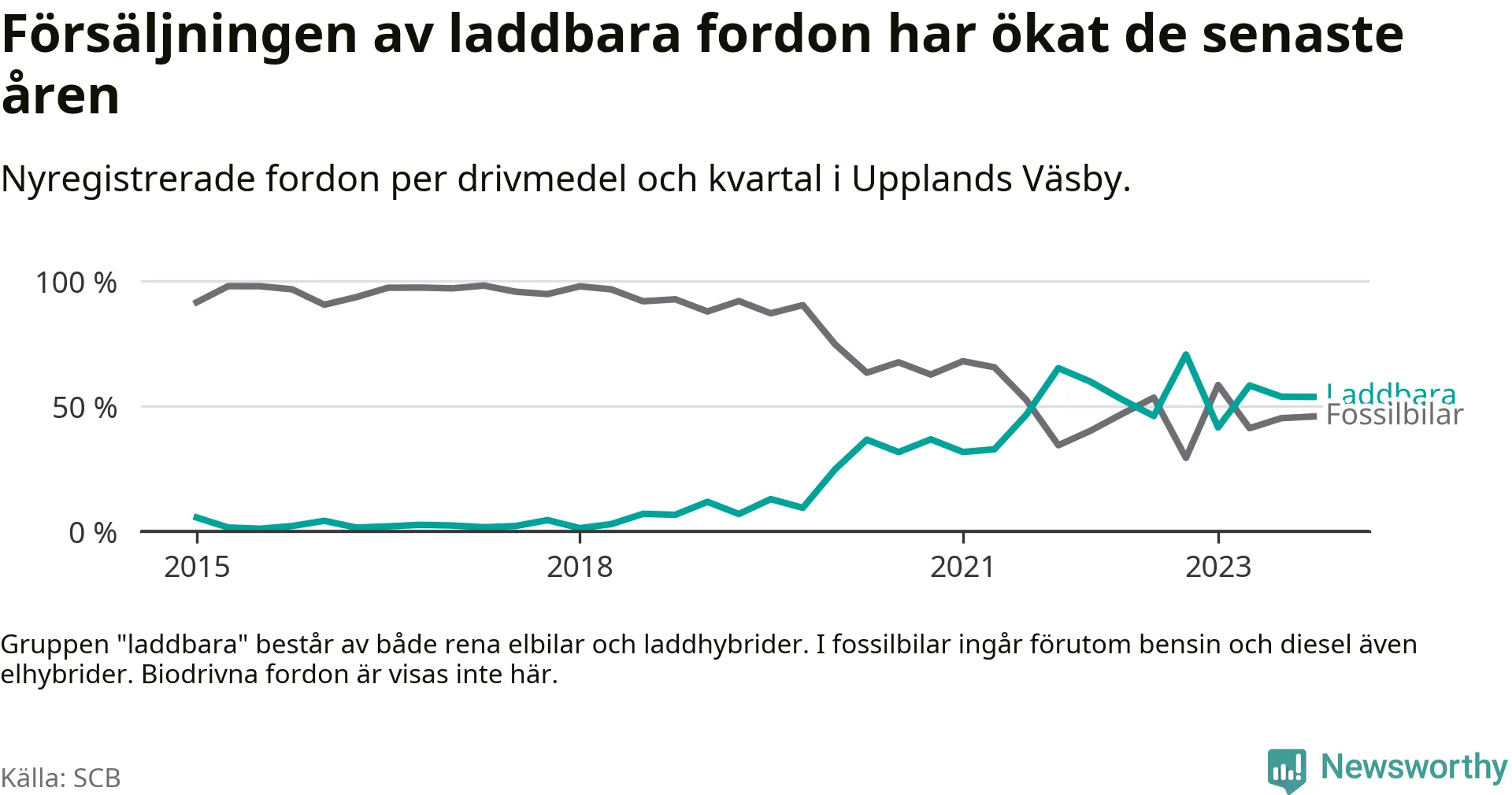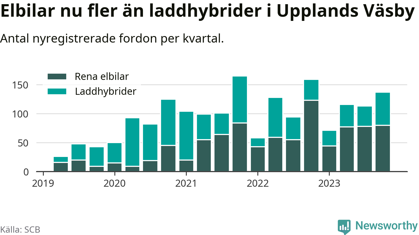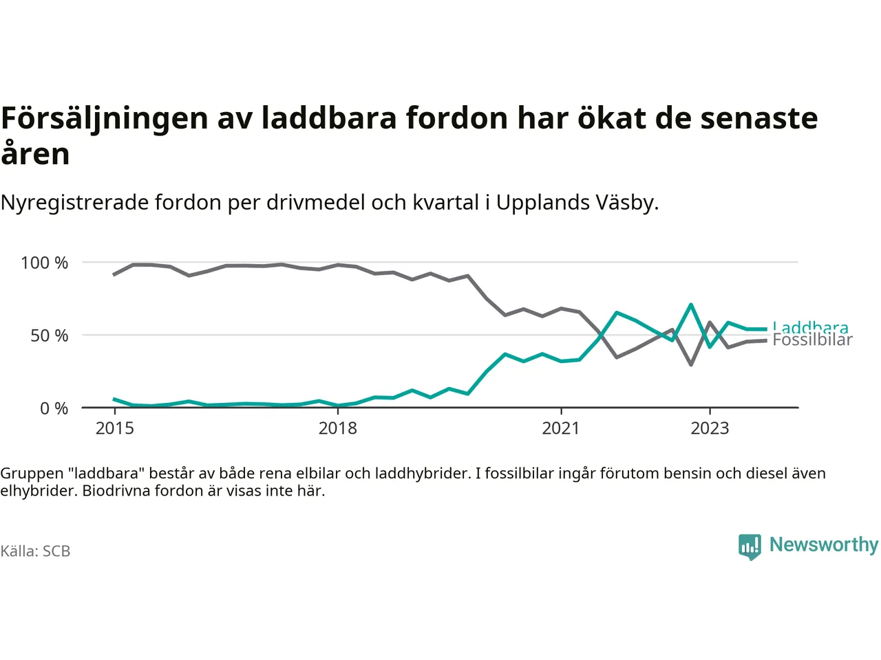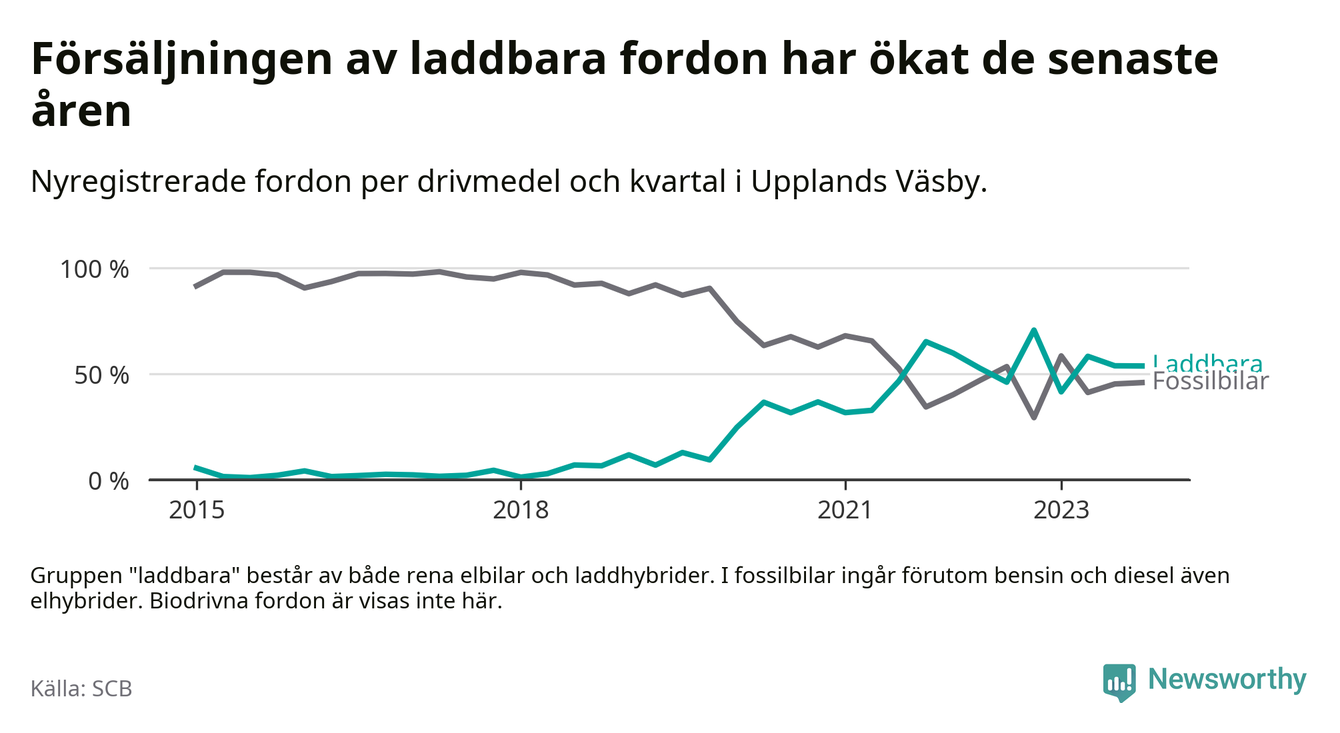 Under fjärde kvartalet 2023 var 54 procent av alla nyregistrerade personbilar i Upplands Väsby laddbara (sammanlagt registrerades 255 nya bilar). Merparten av de laddbara bilarna var rena elbilar (31 procent av alla).