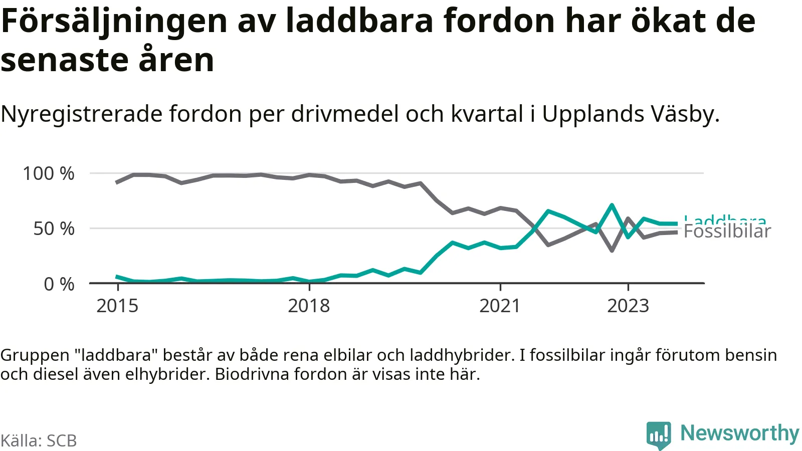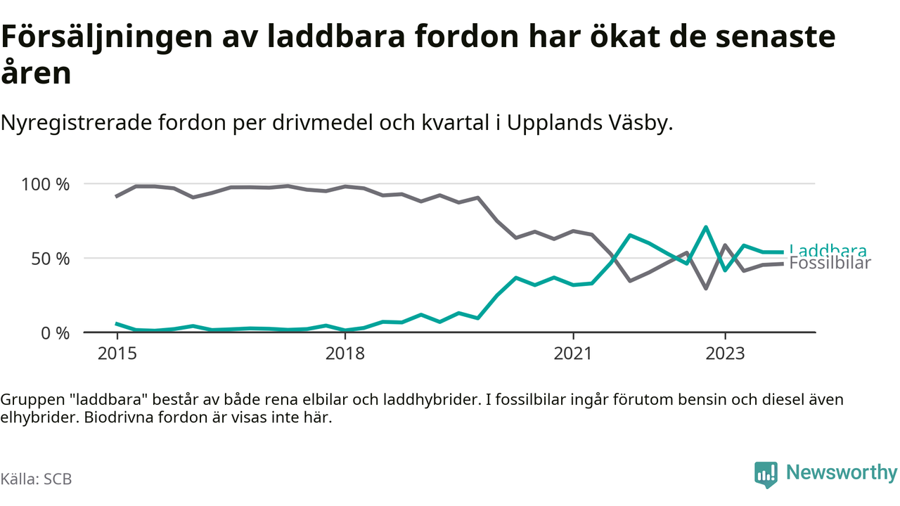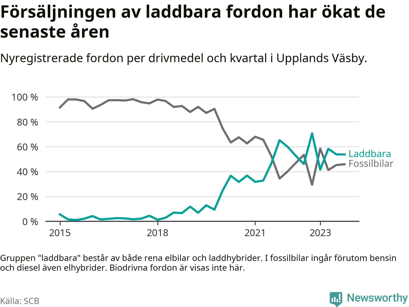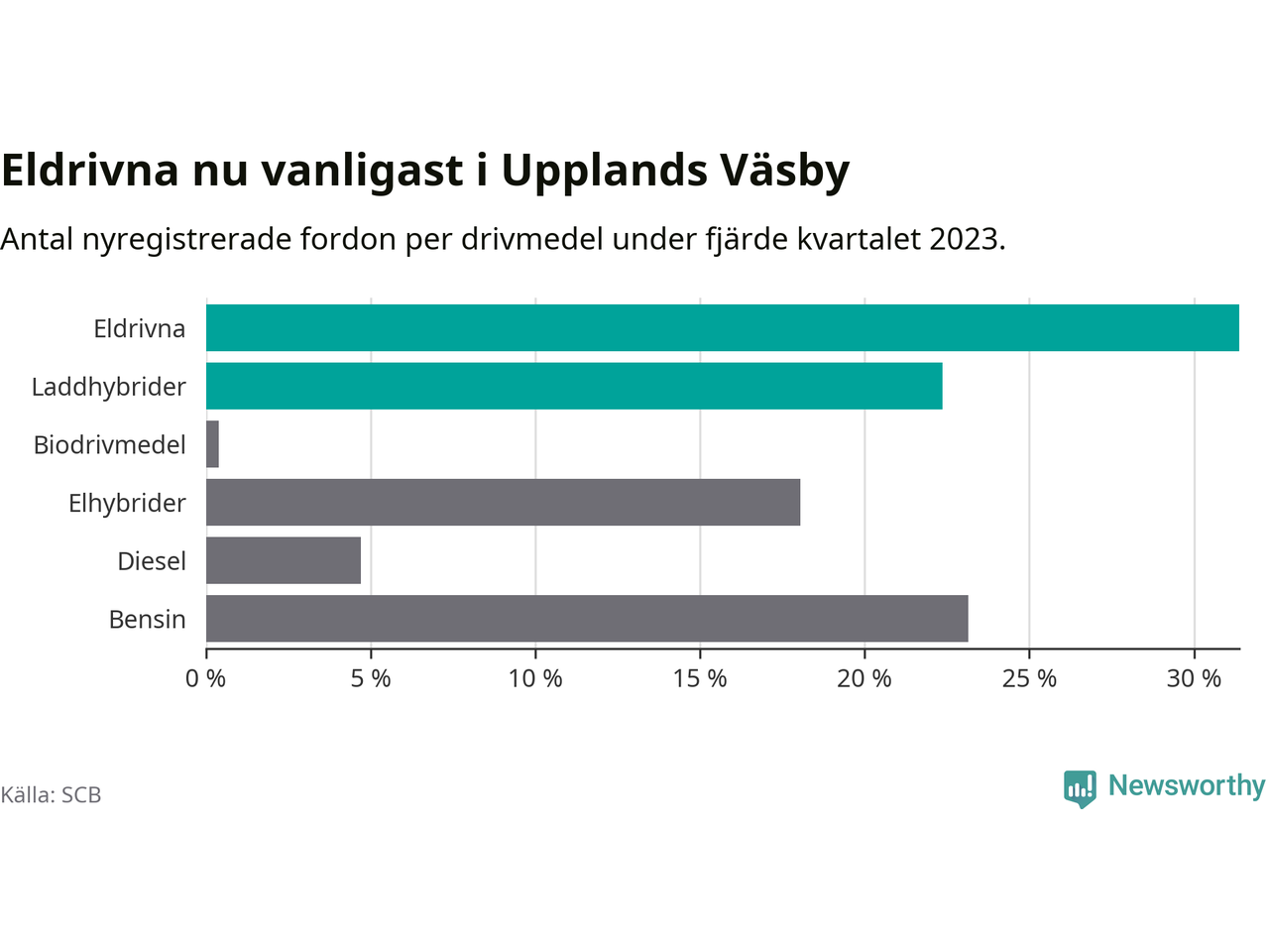 Under fjärde kvartalet 2023 var 54 procent av alla nyregistrerade personbilar i Upplands Väsby laddbara (sammanlagt registrerades 255 nya bilar). Merparten av de laddbara bilarna var rena elbilar (31 procent av alla).