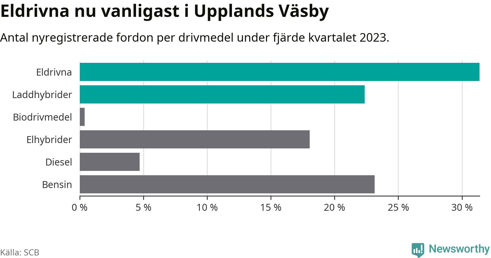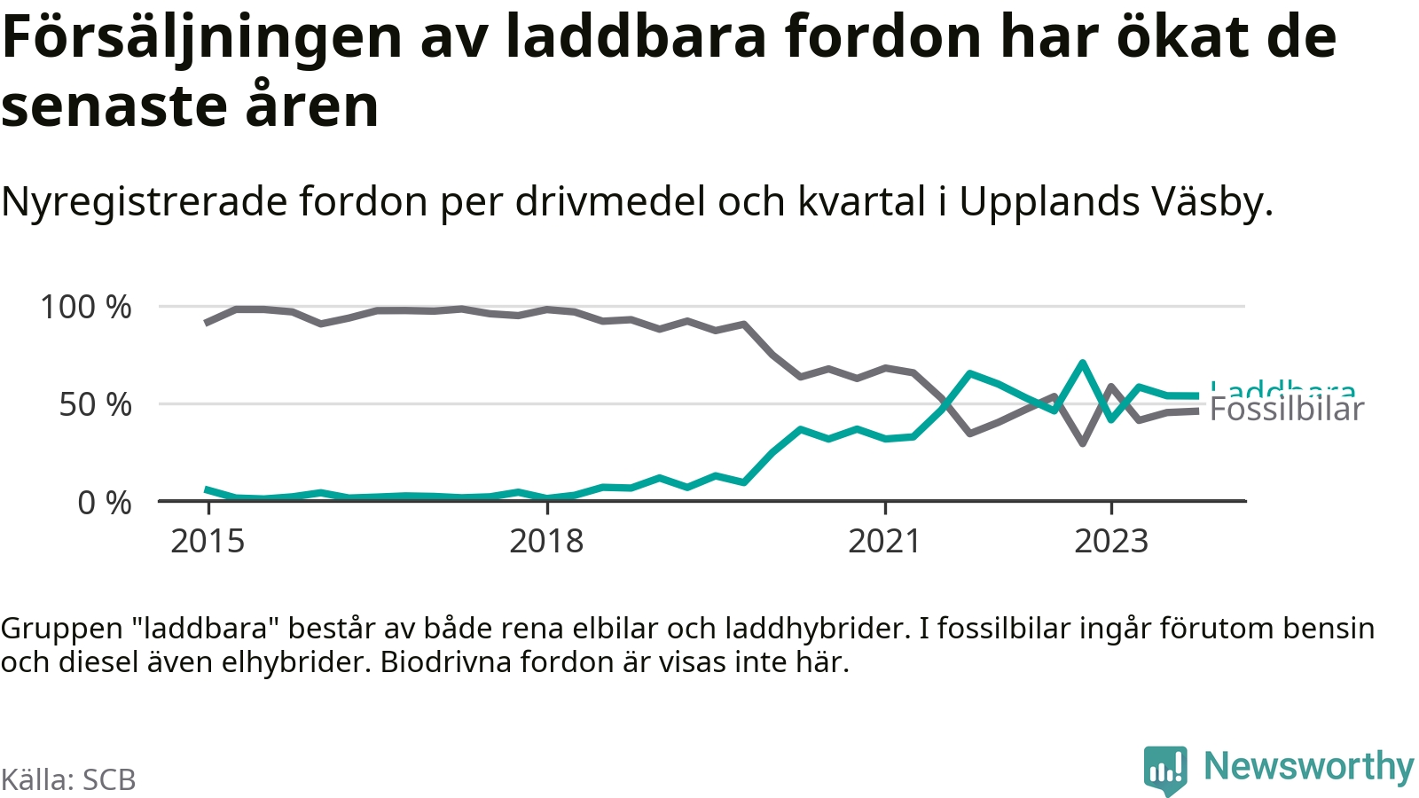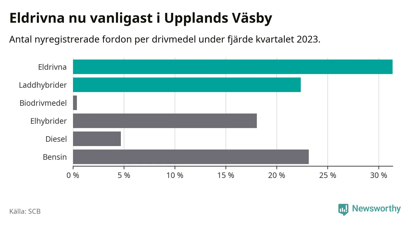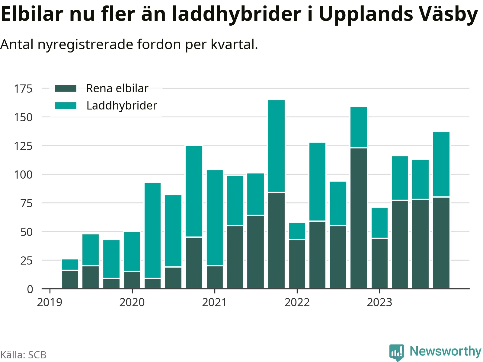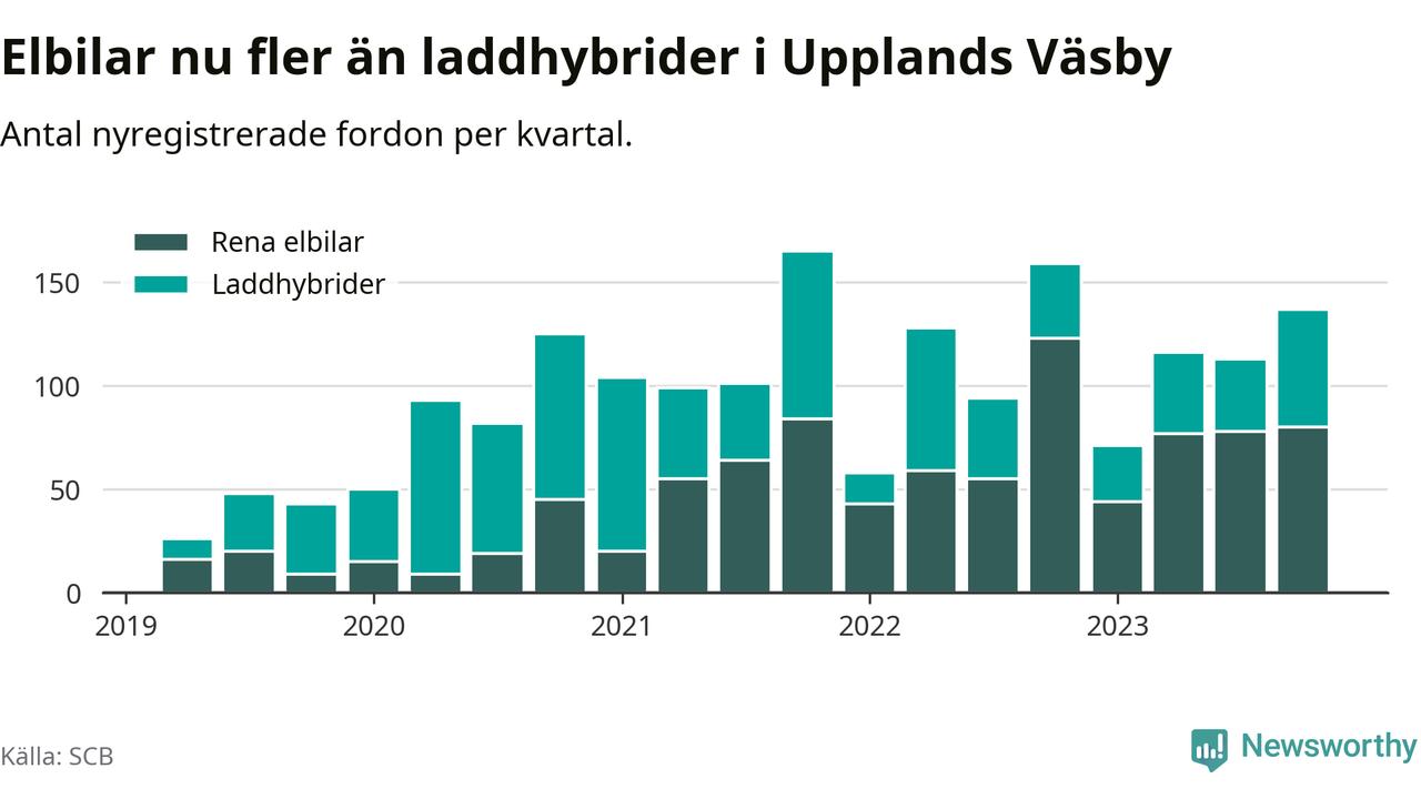 Under fjärde kvartalet 2023 var 54 procent av alla nyregistrerade personbilar i Upplands Väsby laddbara (sammanlagt registrerades 255 nya bilar). Merparten av de laddbara bilarna var rena elbilar (31 procent av alla).