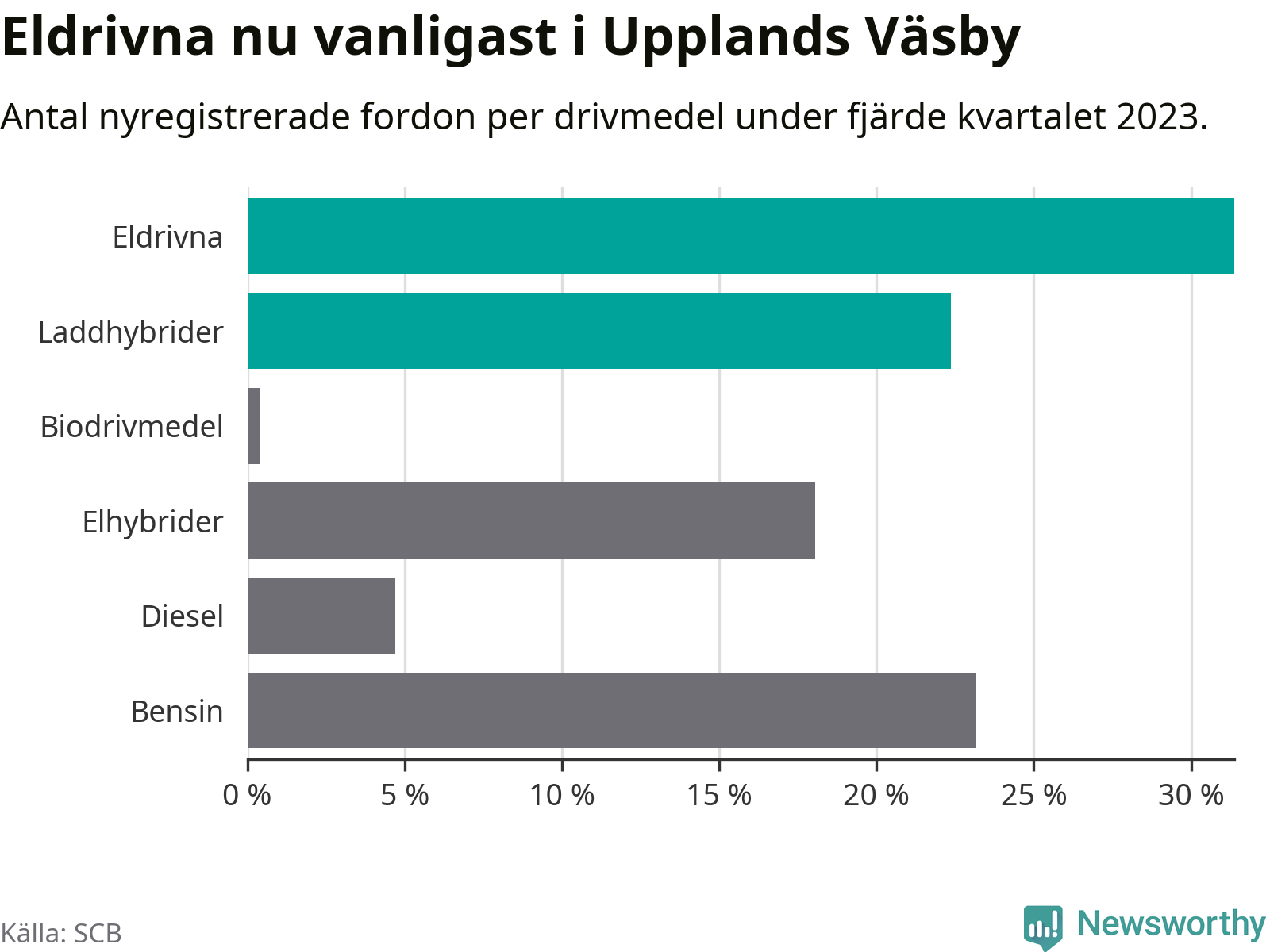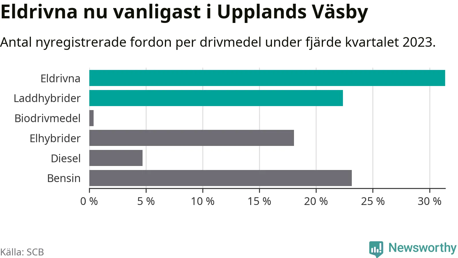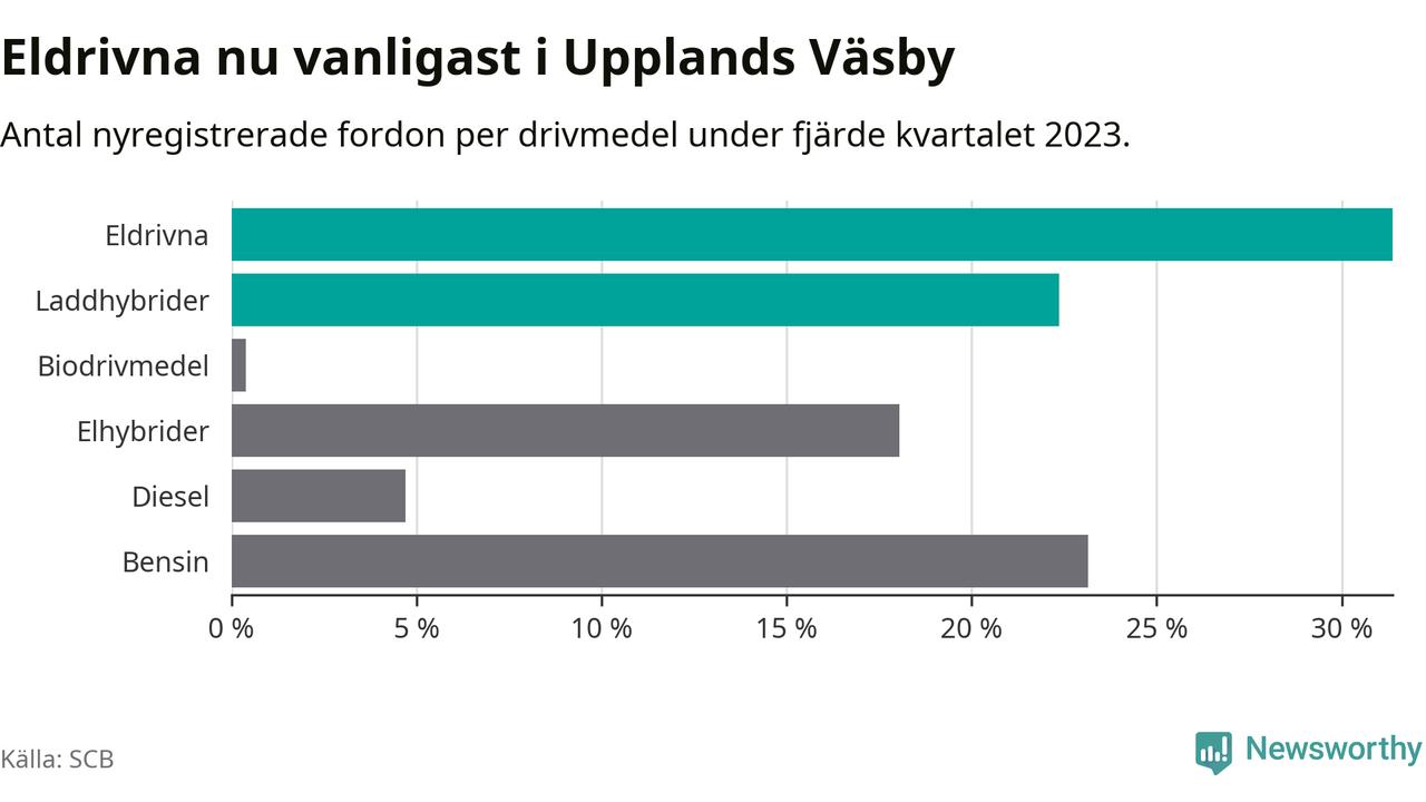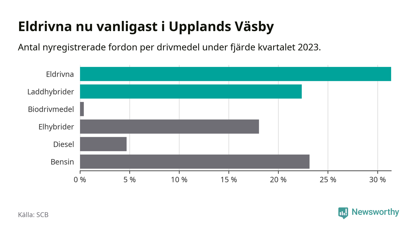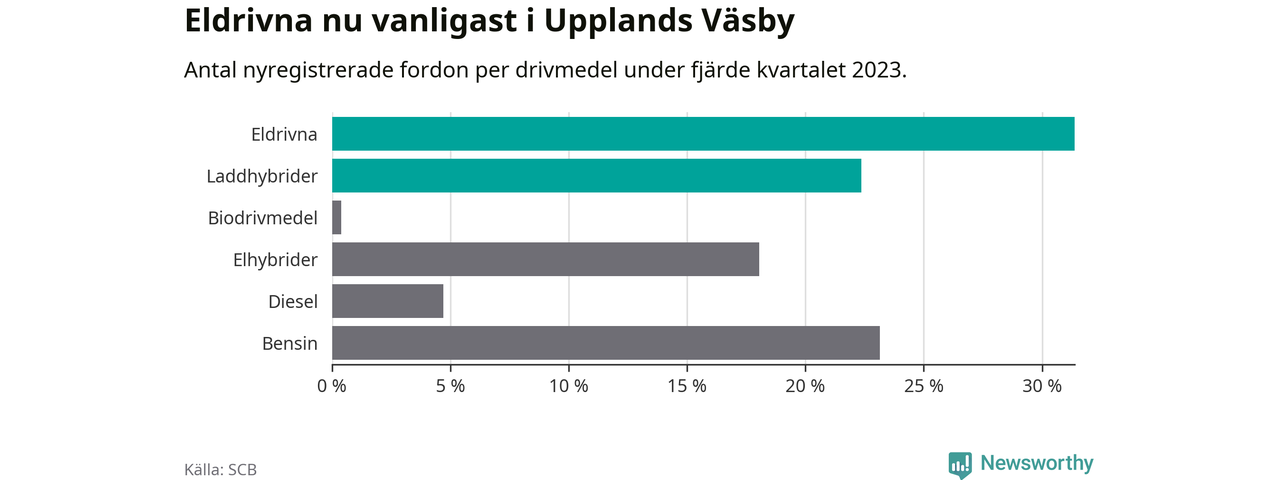 Under fjärde kvartalet 2023 var 54 procent av alla nyregistrerade personbilar i Upplands Väsby laddbara (sammanlagt registrerades 255 nya bilar). Merparten av de laddbara bilarna var rena elbilar (31 procent av alla).