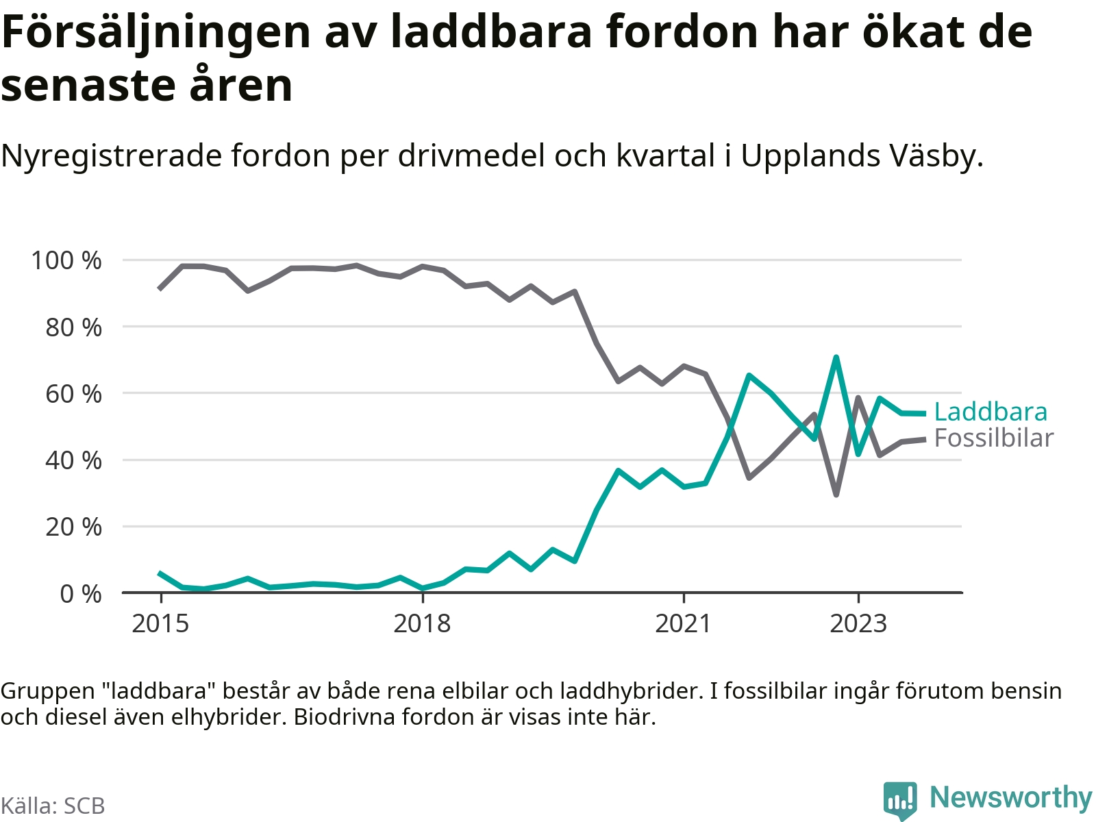 I Upplands Väsby var andelen laddbara bilar under fjärde kvartalet också lägre än under fjärde kvartalet 2022 då rekordet hittills noterades (71 procent).