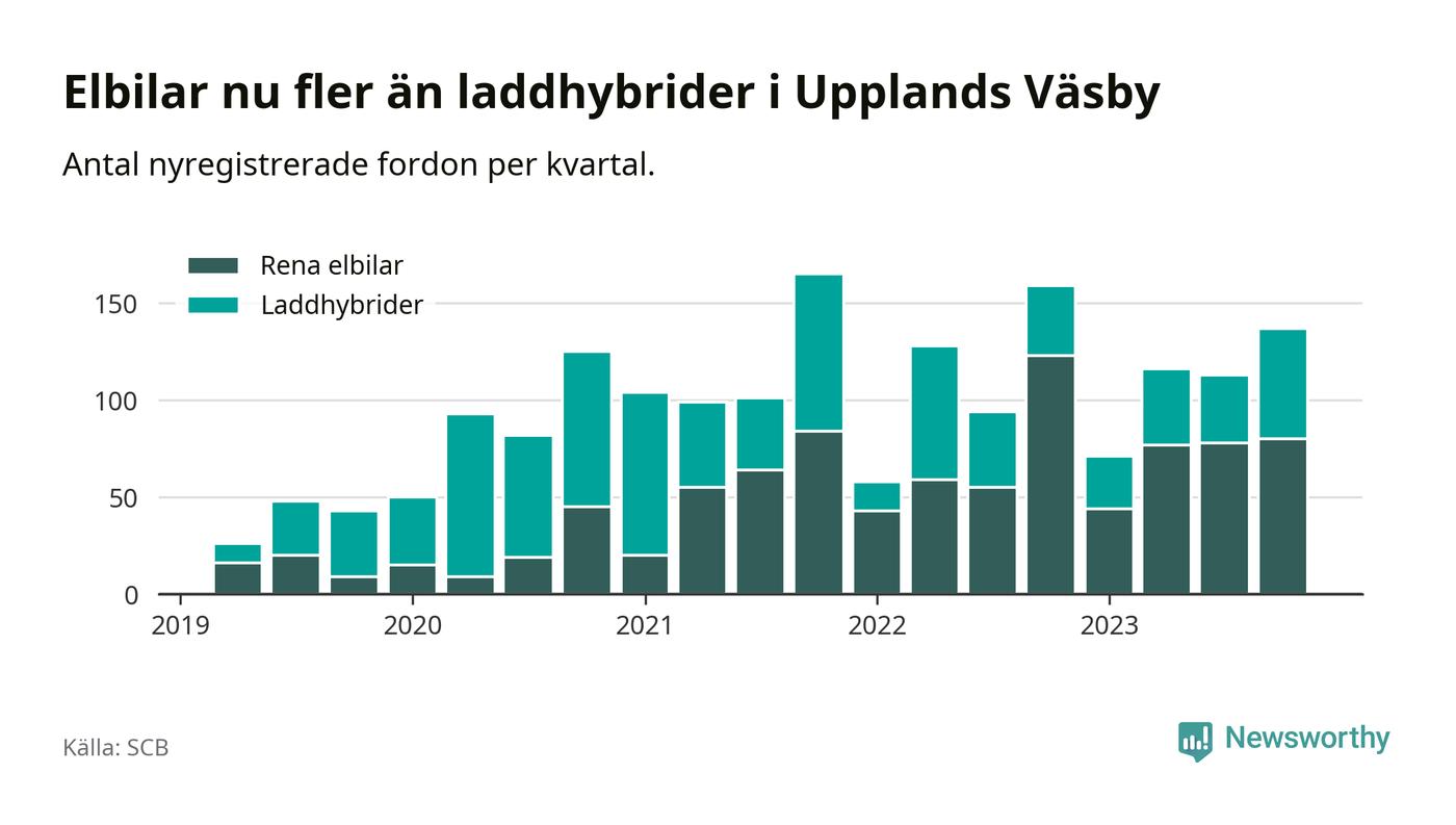Jämfört med andra kommuner sticker försäljningen av elbilar och laddhybrider inte ut nämnvärt i Upplands Väsby. Under fjärde kvartalet var nyregistreringen 143:e högst i hela landet (bland 290 kommuner).