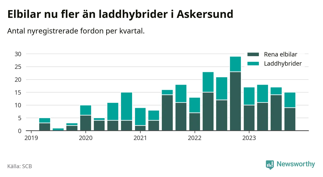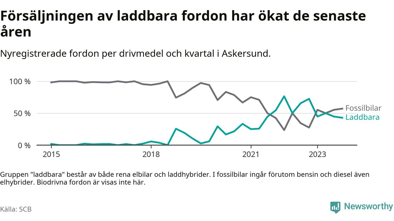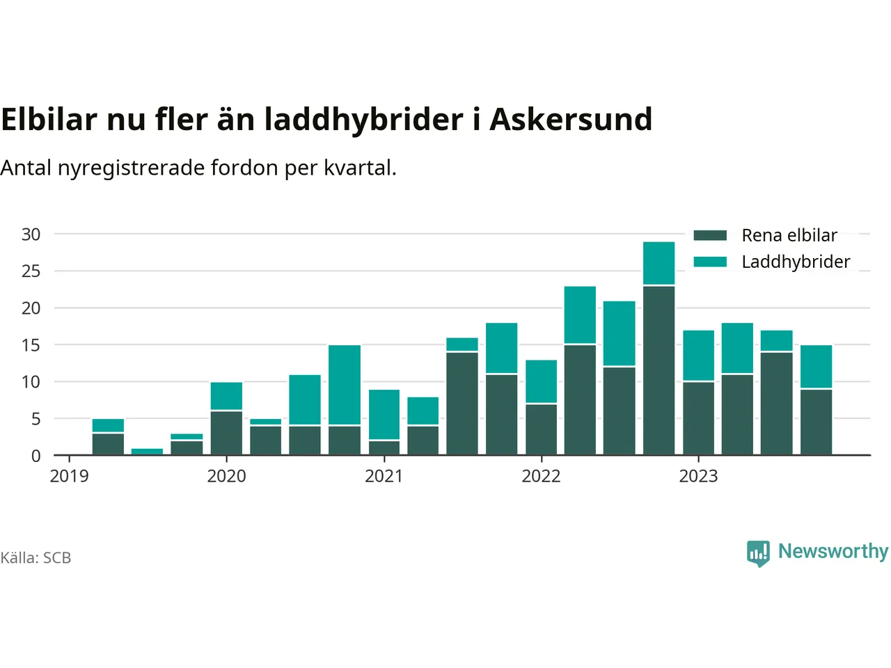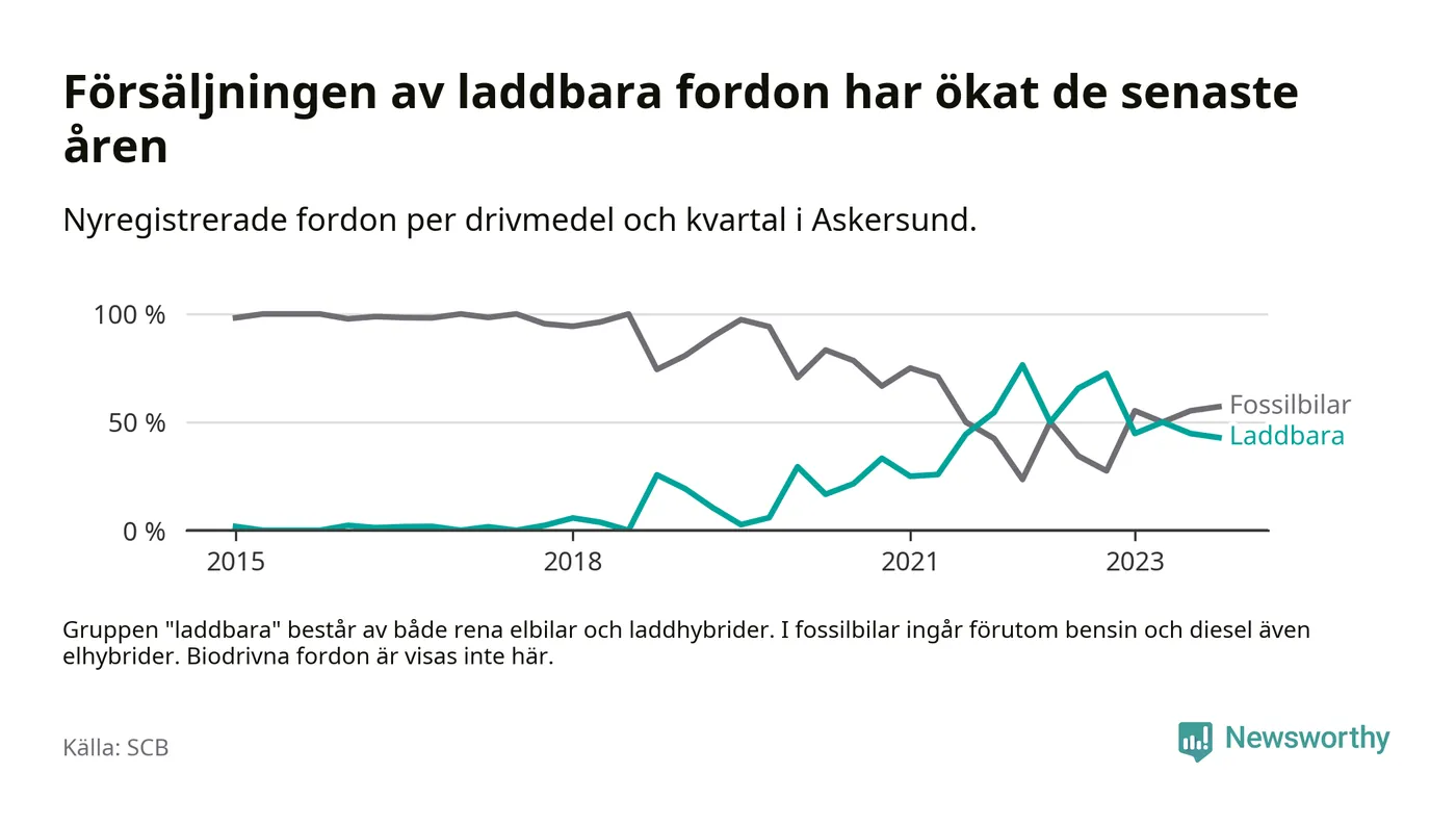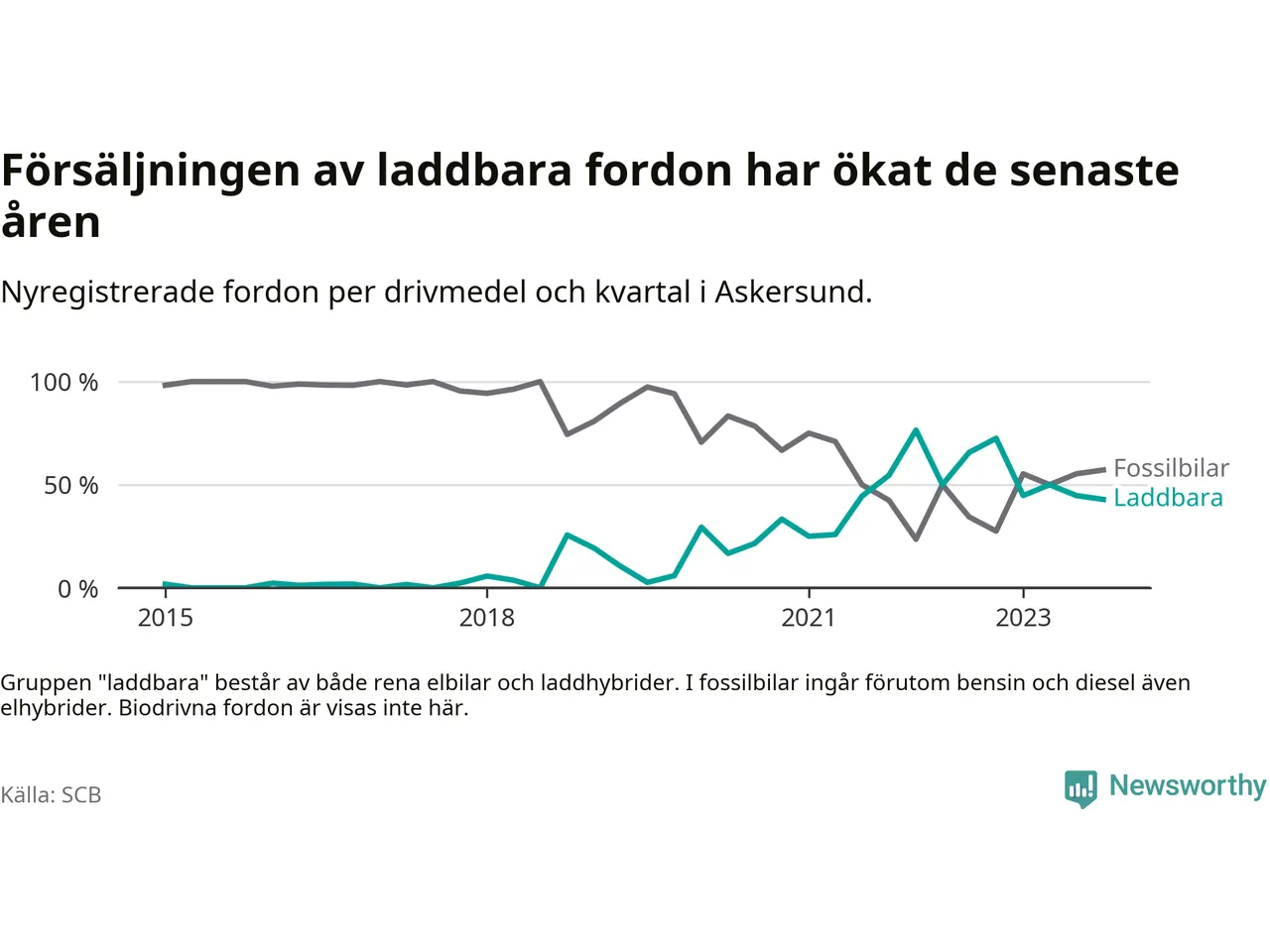 Under fjärde kvartalet 2023 var 43 procent av alla nyregistrerade personbilar i Askersund laddbara (sammanlagt registrerades 35 nya bilar). Merparten av de laddbara bilarna var rena elbilar (26 procent av alla).