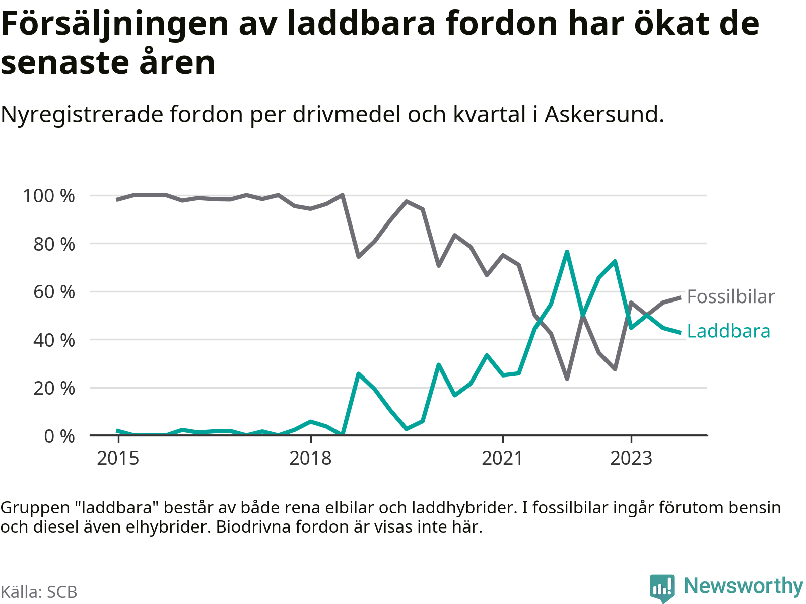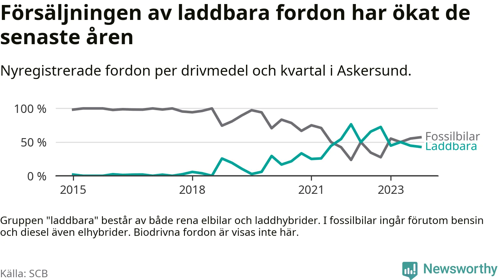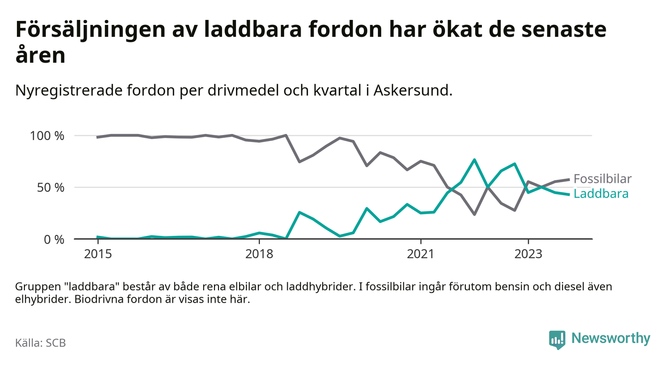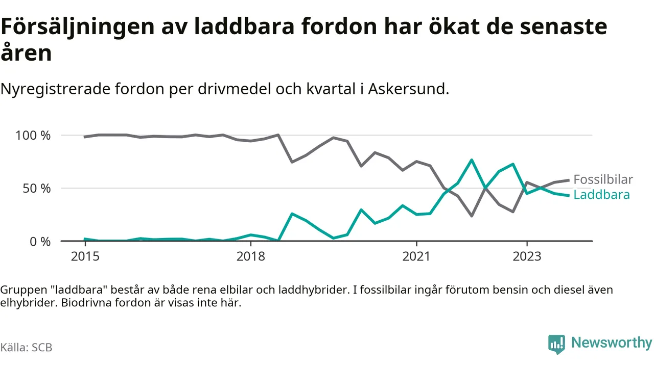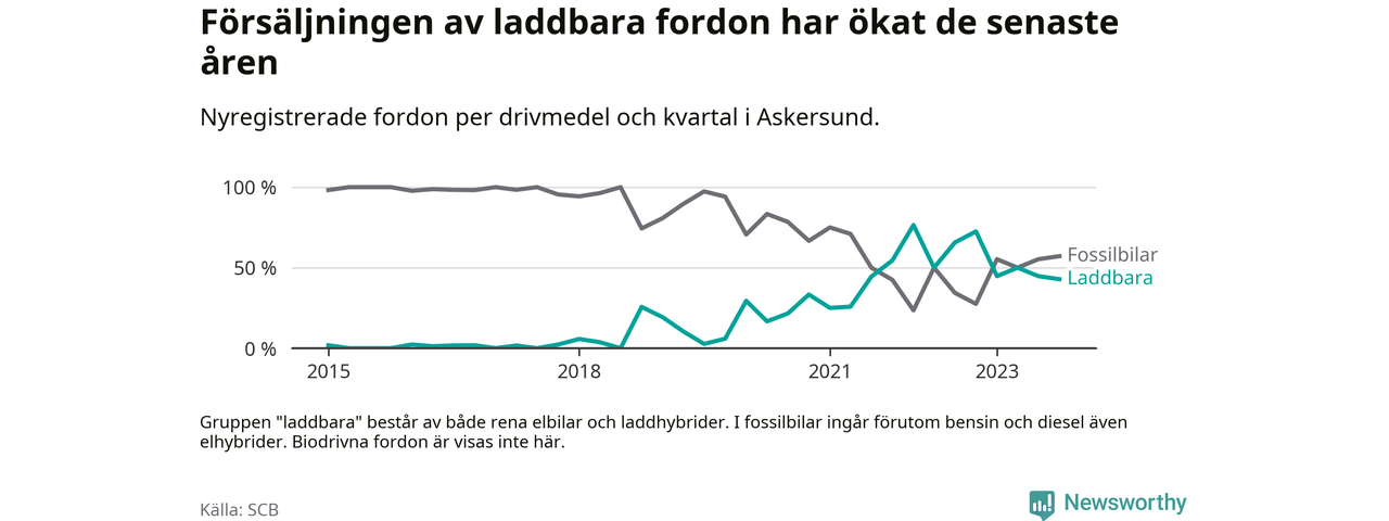 Under fjärde kvartalet 2023 var 43 procent av alla nyregistrerade personbilar i Askersund laddbara (sammanlagt registrerades 35 nya bilar). Merparten av de laddbara bilarna var rena elbilar (26 procent av alla).