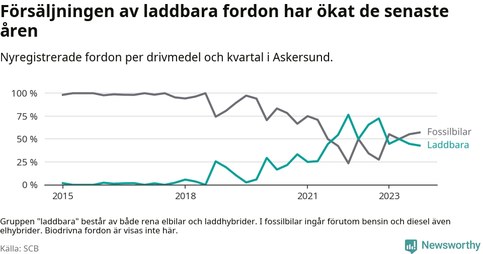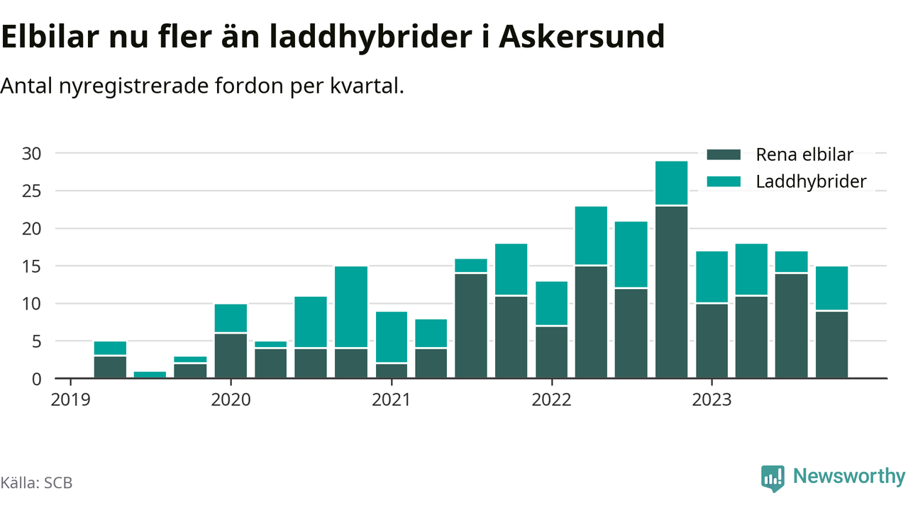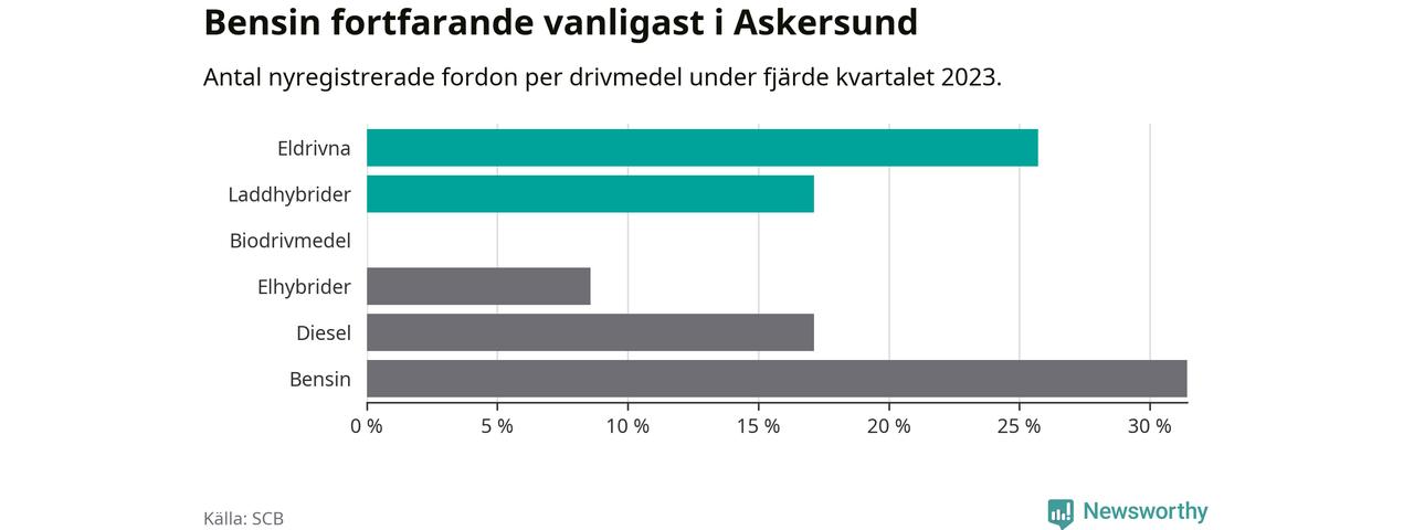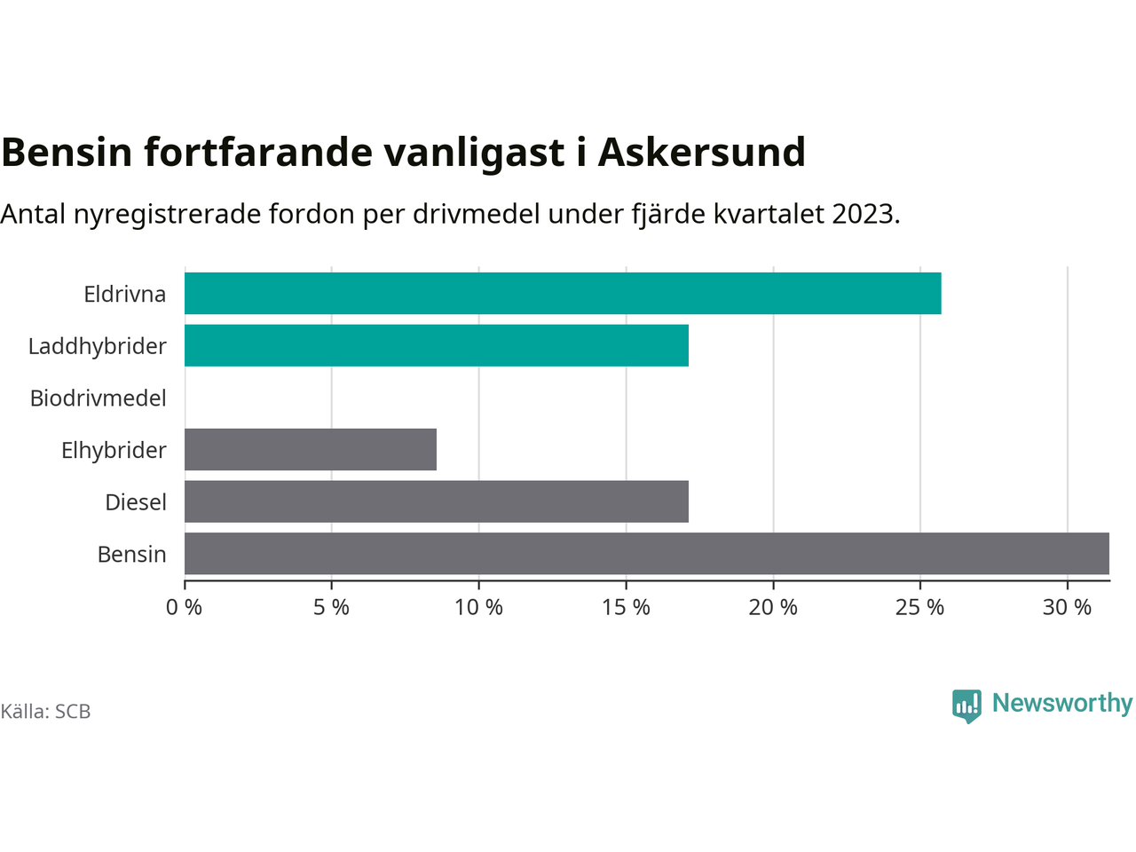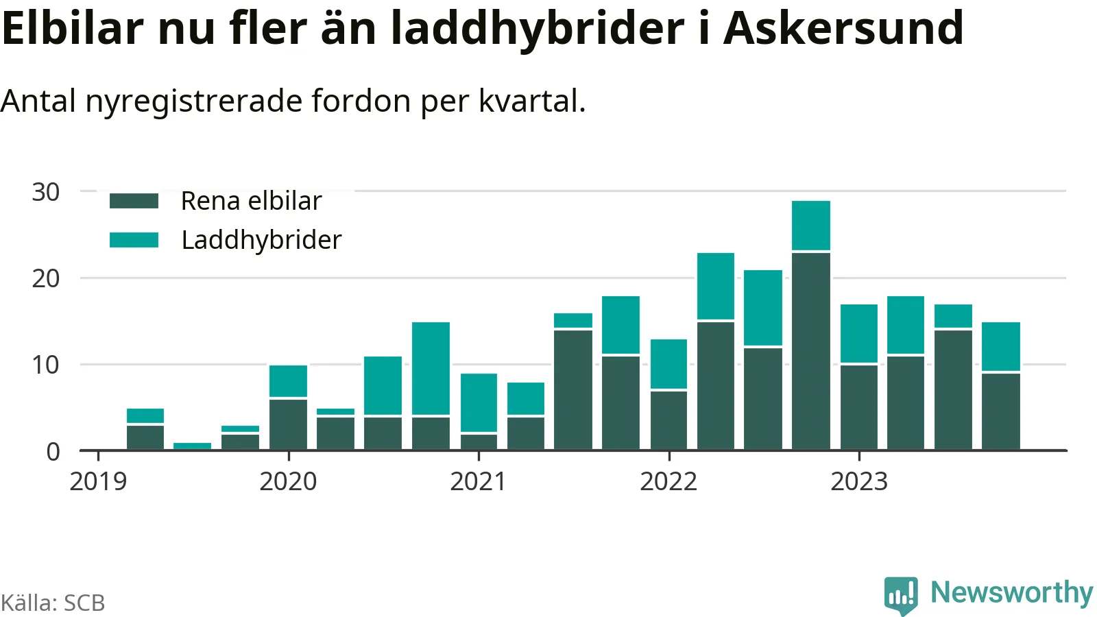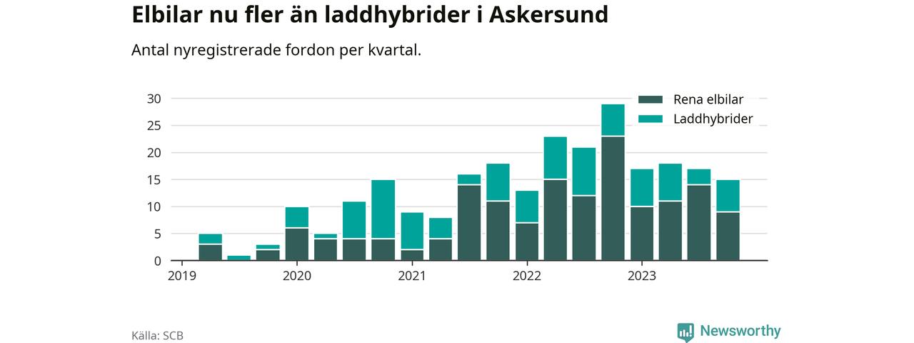 Under fjärde kvartalet 2023 var 43 procent av alla nyregistrerade personbilar i Askersund laddbara (sammanlagt registrerades 35 nya bilar). Merparten av de laddbara bilarna var rena elbilar (26 procent av alla).