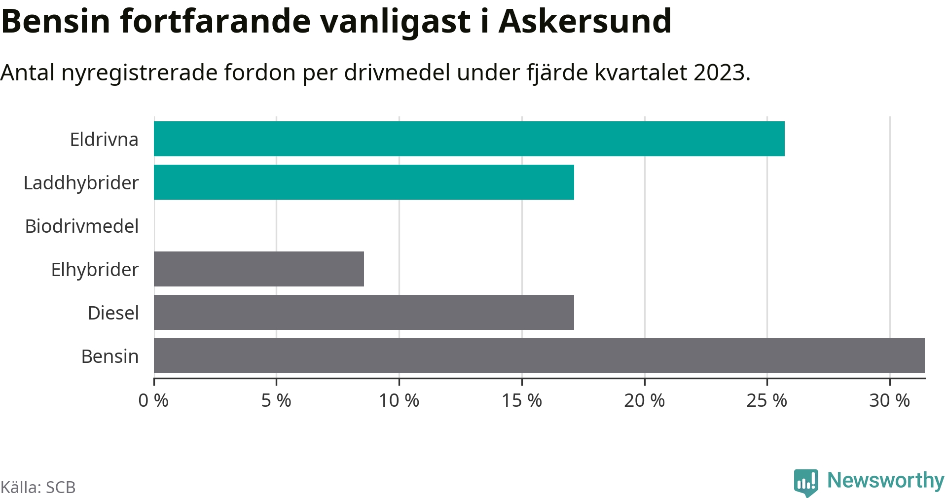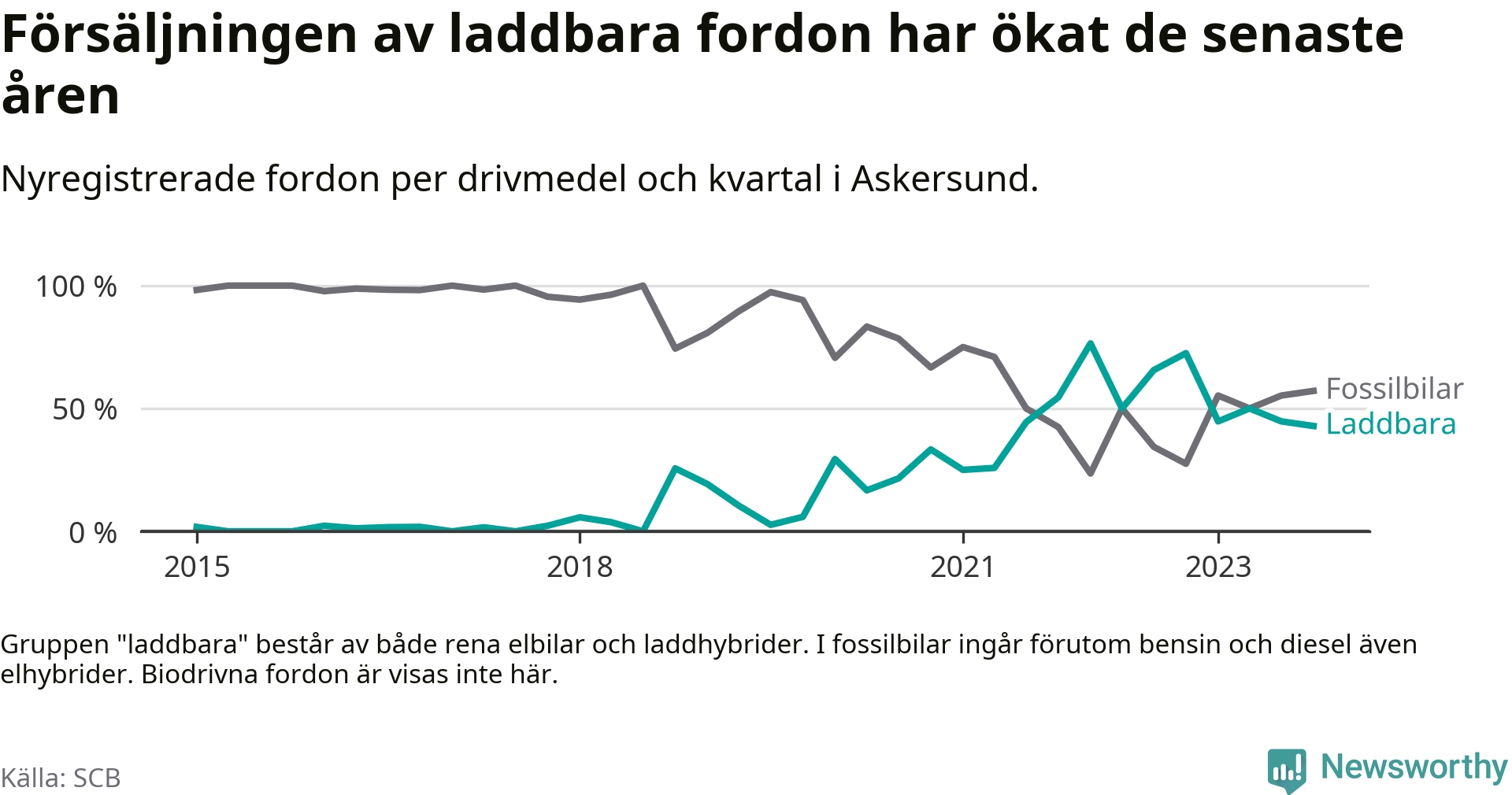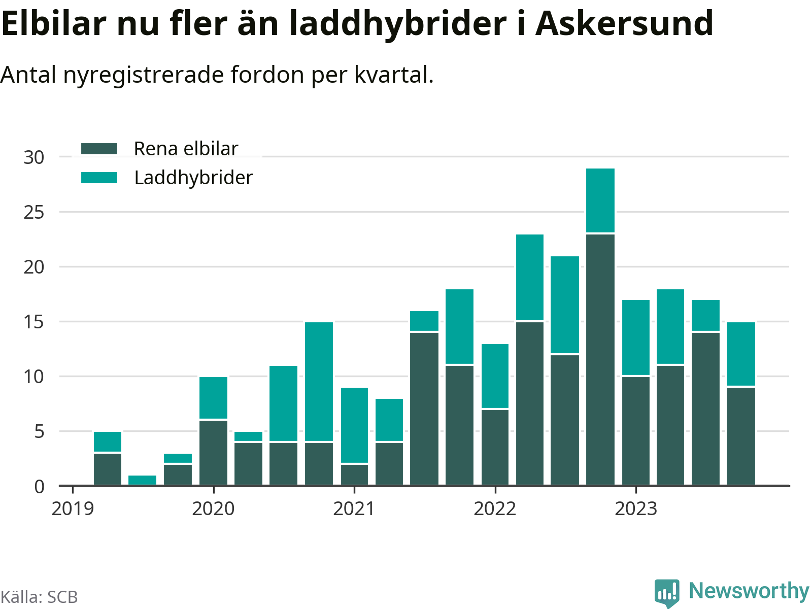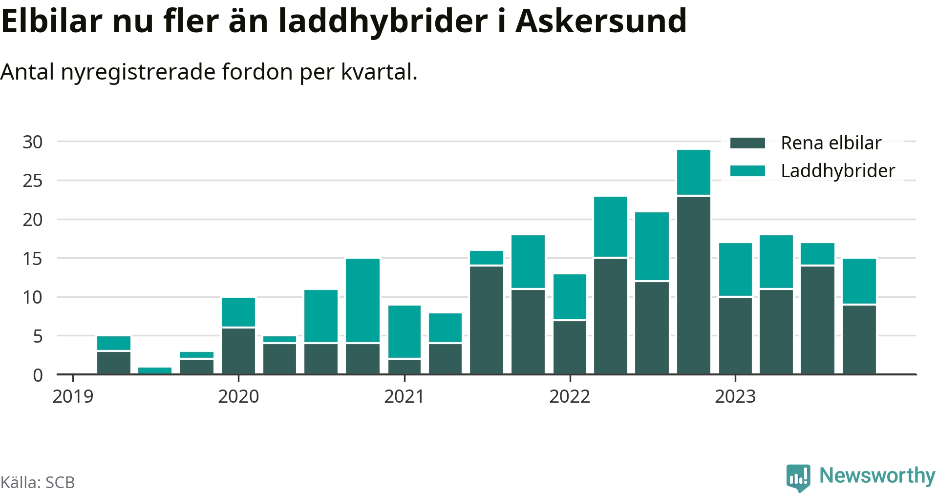 Under fjärde kvartalet 2023 var 43 procent av alla nyregistrerade personbilar i Askersund laddbara (sammanlagt registrerades 35 nya bilar). Merparten av de laddbara bilarna var rena elbilar (26 procent av alla).