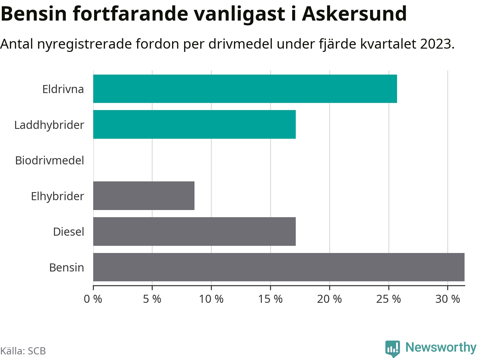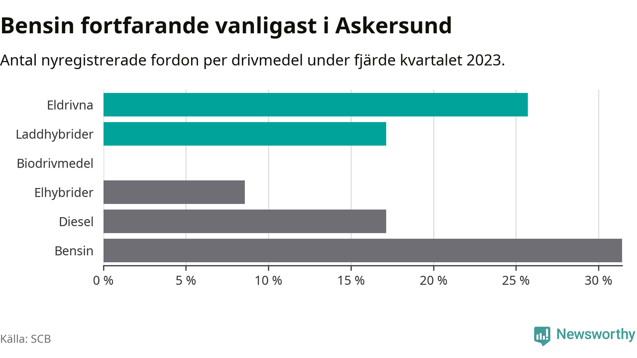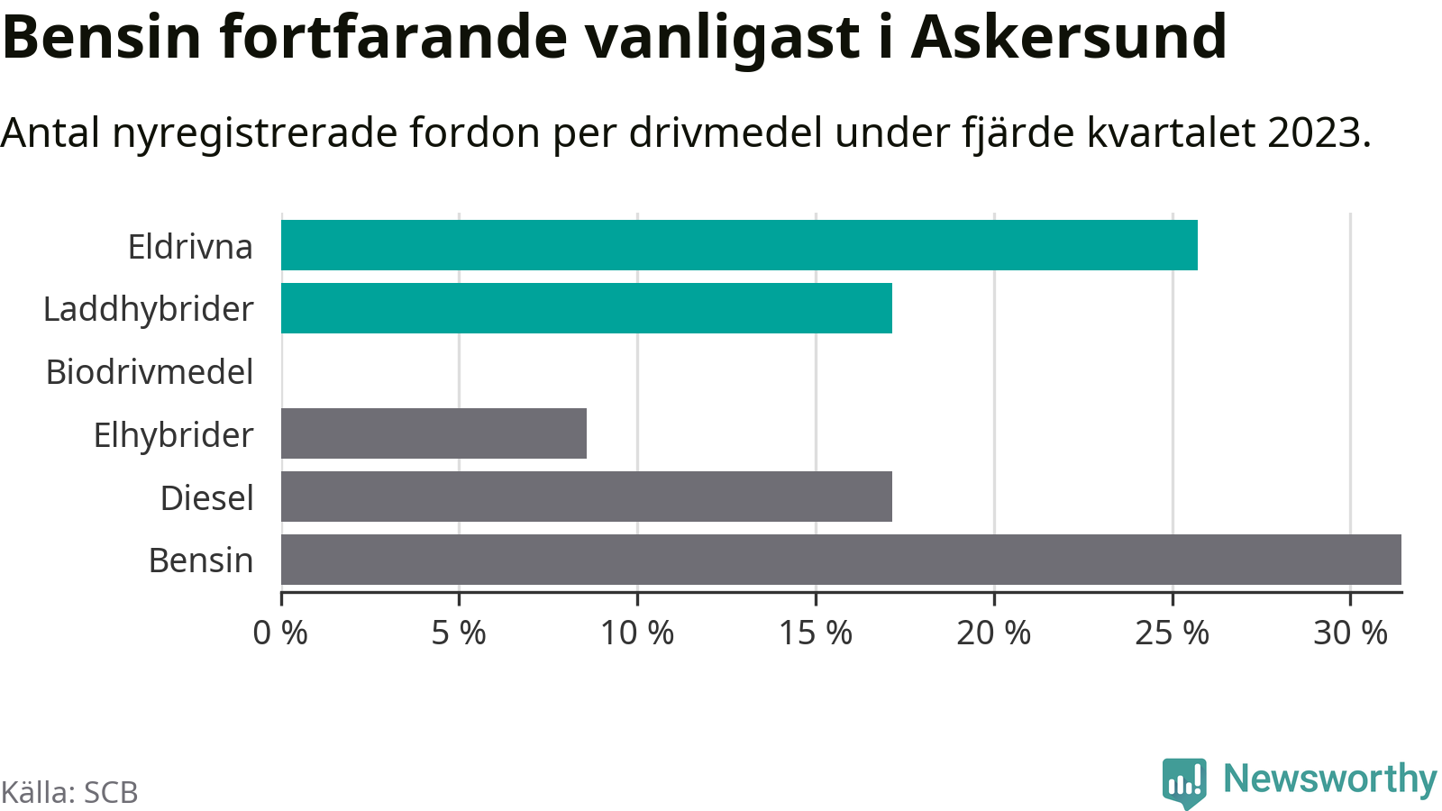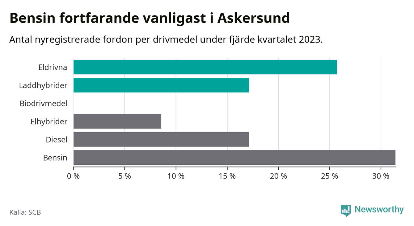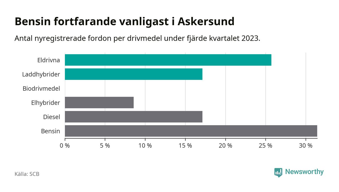 Under fjärde kvartalet 2023 var 43 procent av alla nyregistrerade personbilar i Askersund laddbara (sammanlagt registrerades 35 nya bilar). Merparten av de laddbara bilarna var rena elbilar (26 procent av alla).