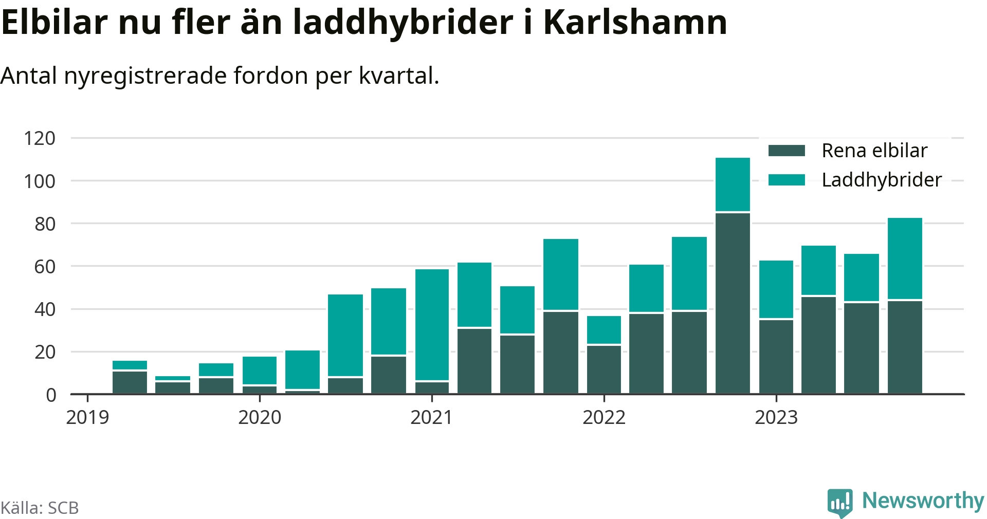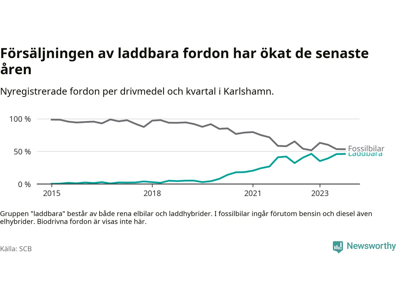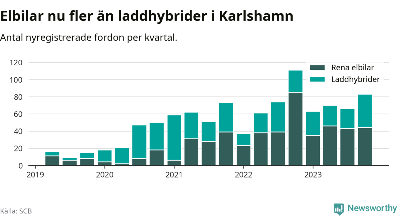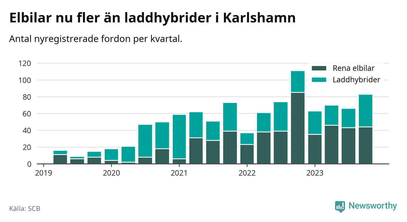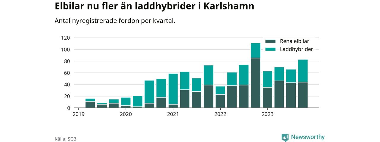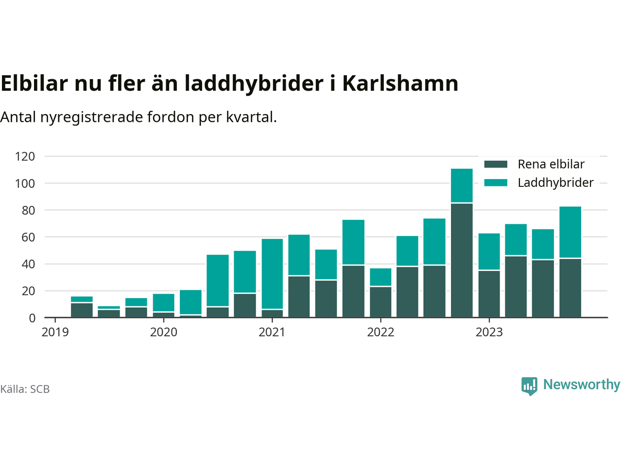 Under fjärde kvartalet 2023 var 46 procent av alla nyregistrerade personbilar i Karlshamn laddbara (sammanlagt registrerades 180 nya bilar). Merparten av de laddbara bilarna var rena elbilar (24 procent av alla).