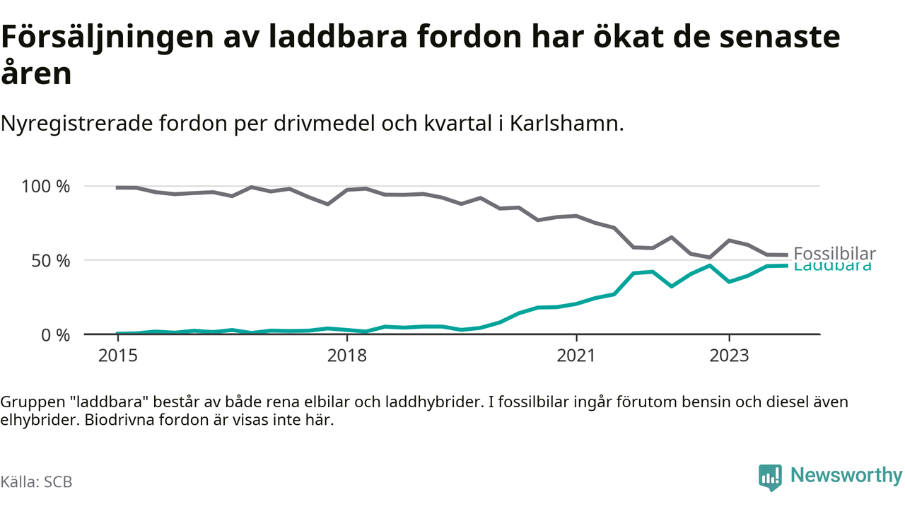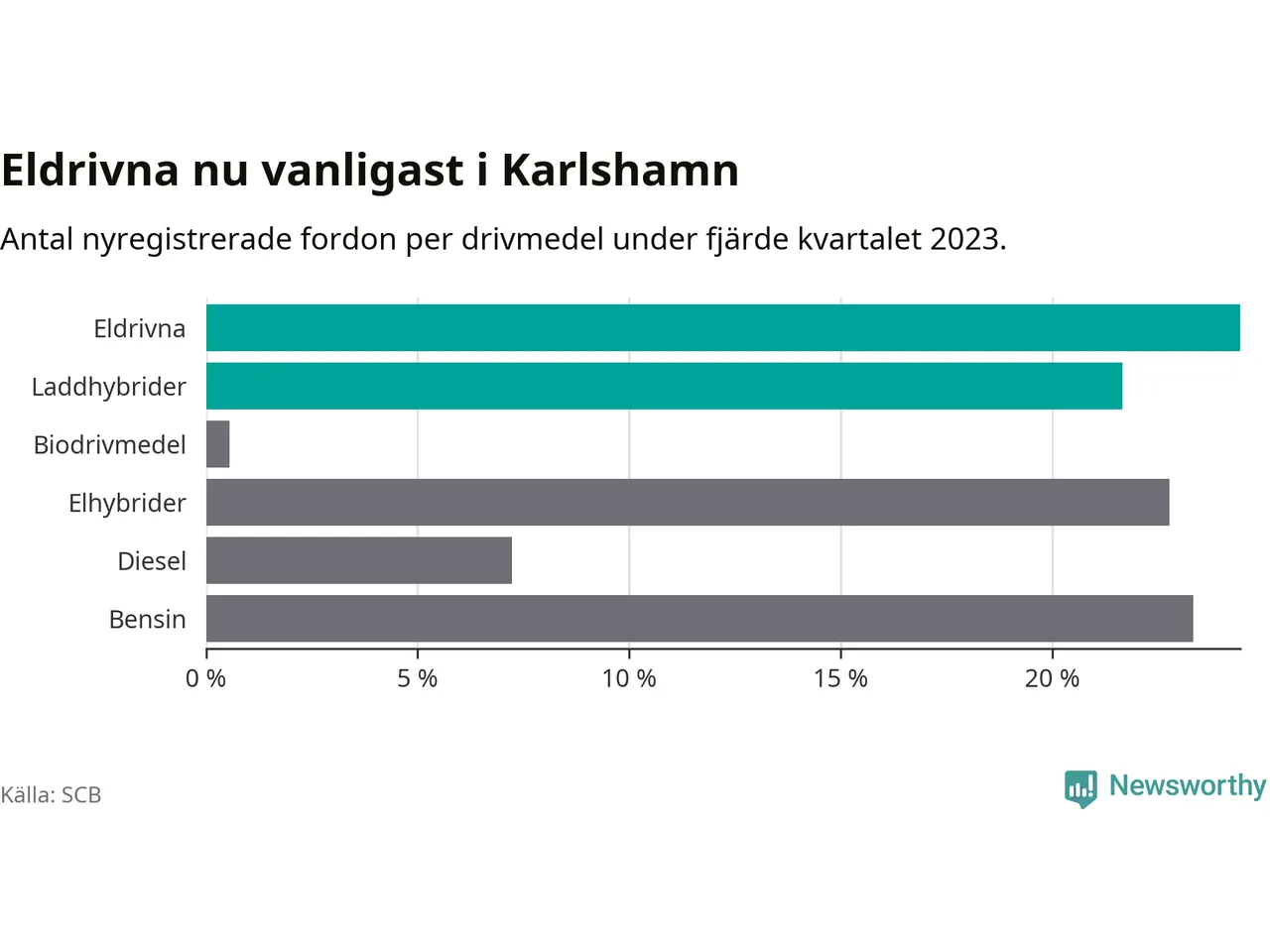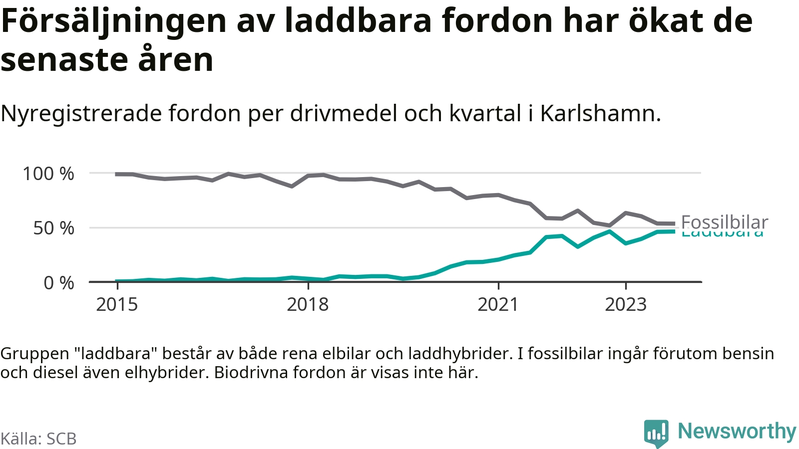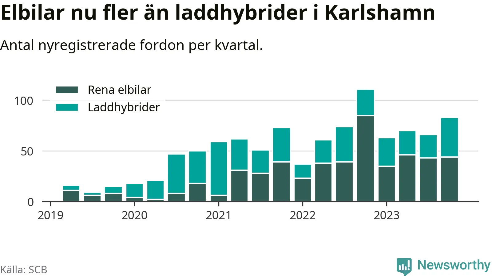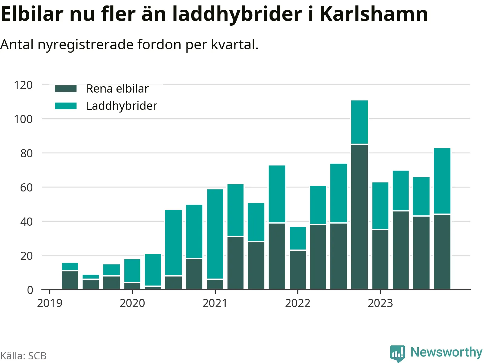 Under fjärde kvartalet 2023 var 46 procent av alla nyregistrerade personbilar i Karlshamn laddbara (sammanlagt registrerades 180 nya bilar). Merparten av de laddbara bilarna var rena elbilar (24 procent av alla).