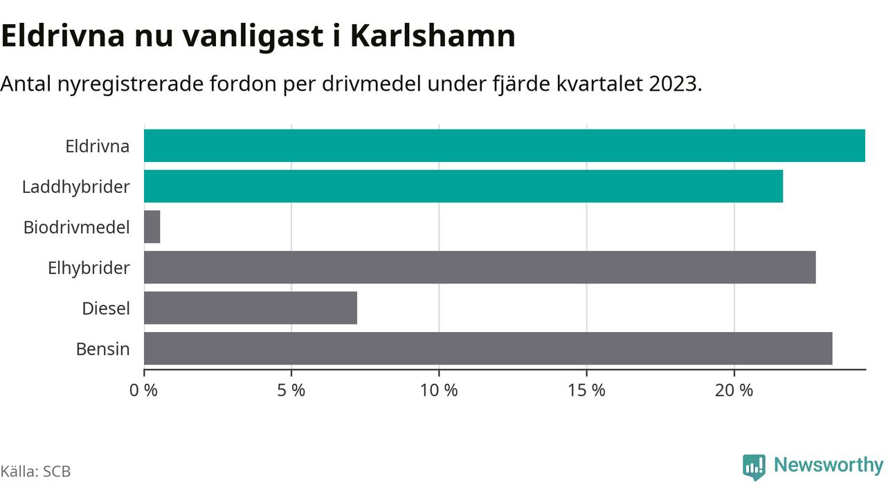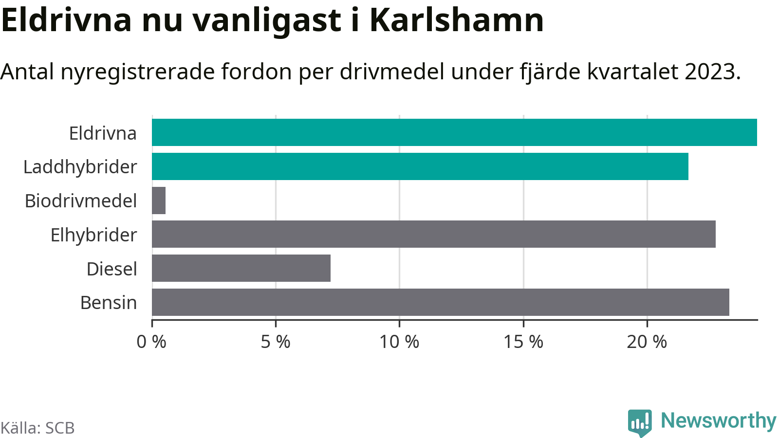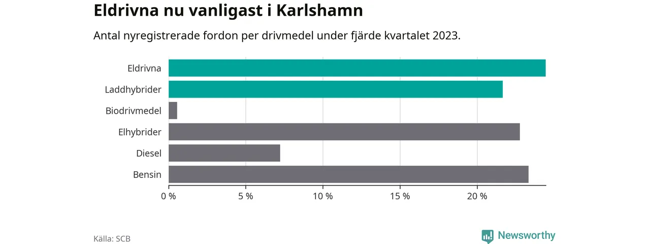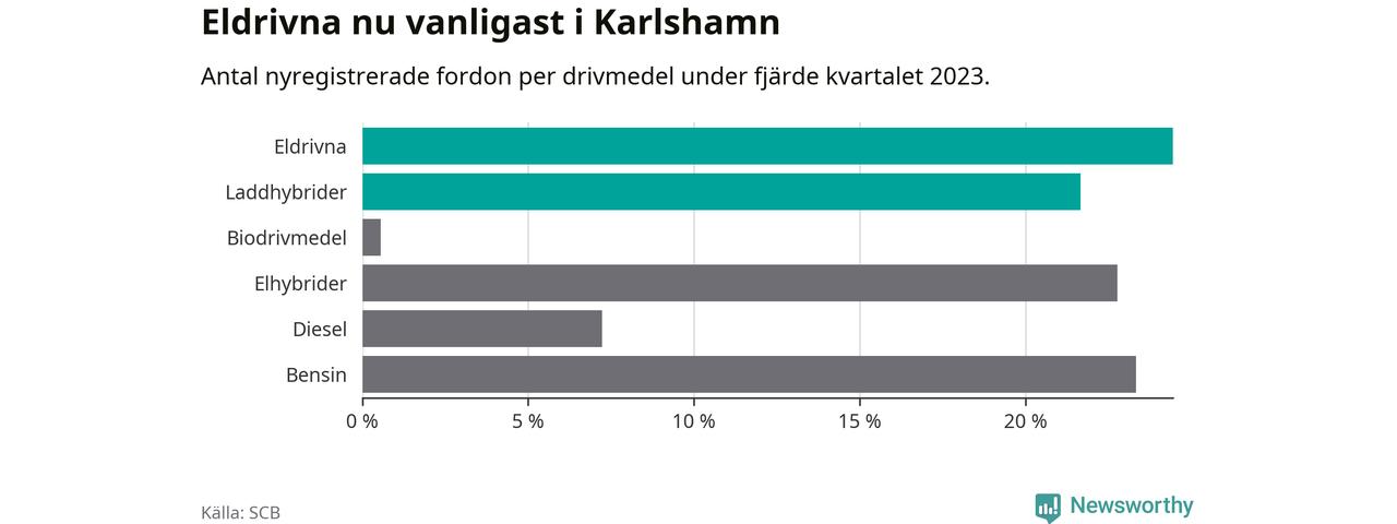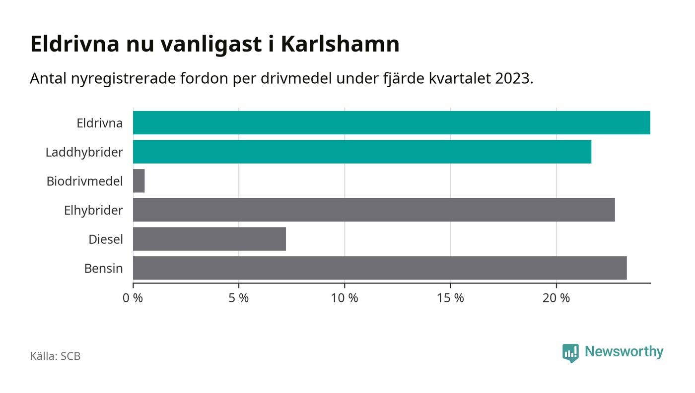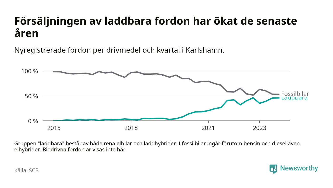 Under fjärde kvartalet 2023 var 46 procent av alla nyregistrerade personbilar i Karlshamn laddbara (sammanlagt registrerades 180 nya bilar). Merparten av de laddbara bilarna var rena elbilar (24 procent av alla).