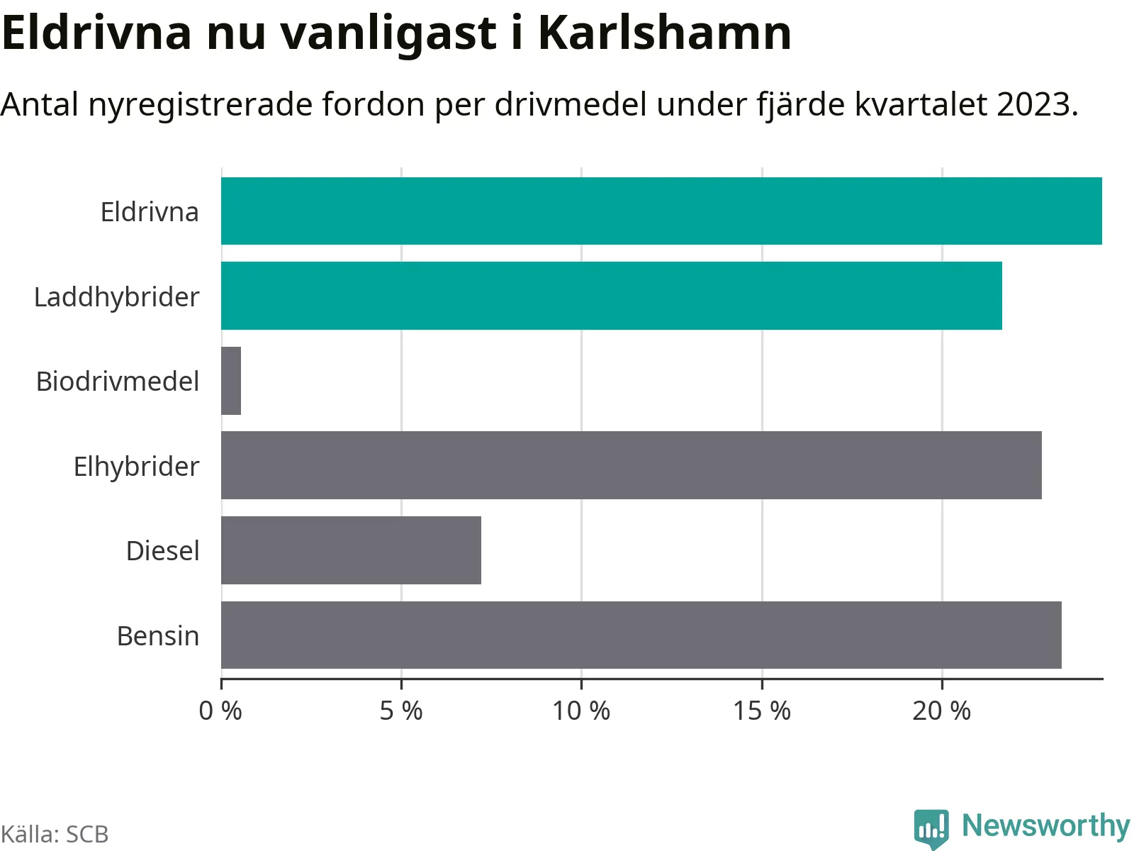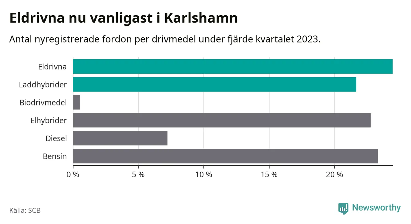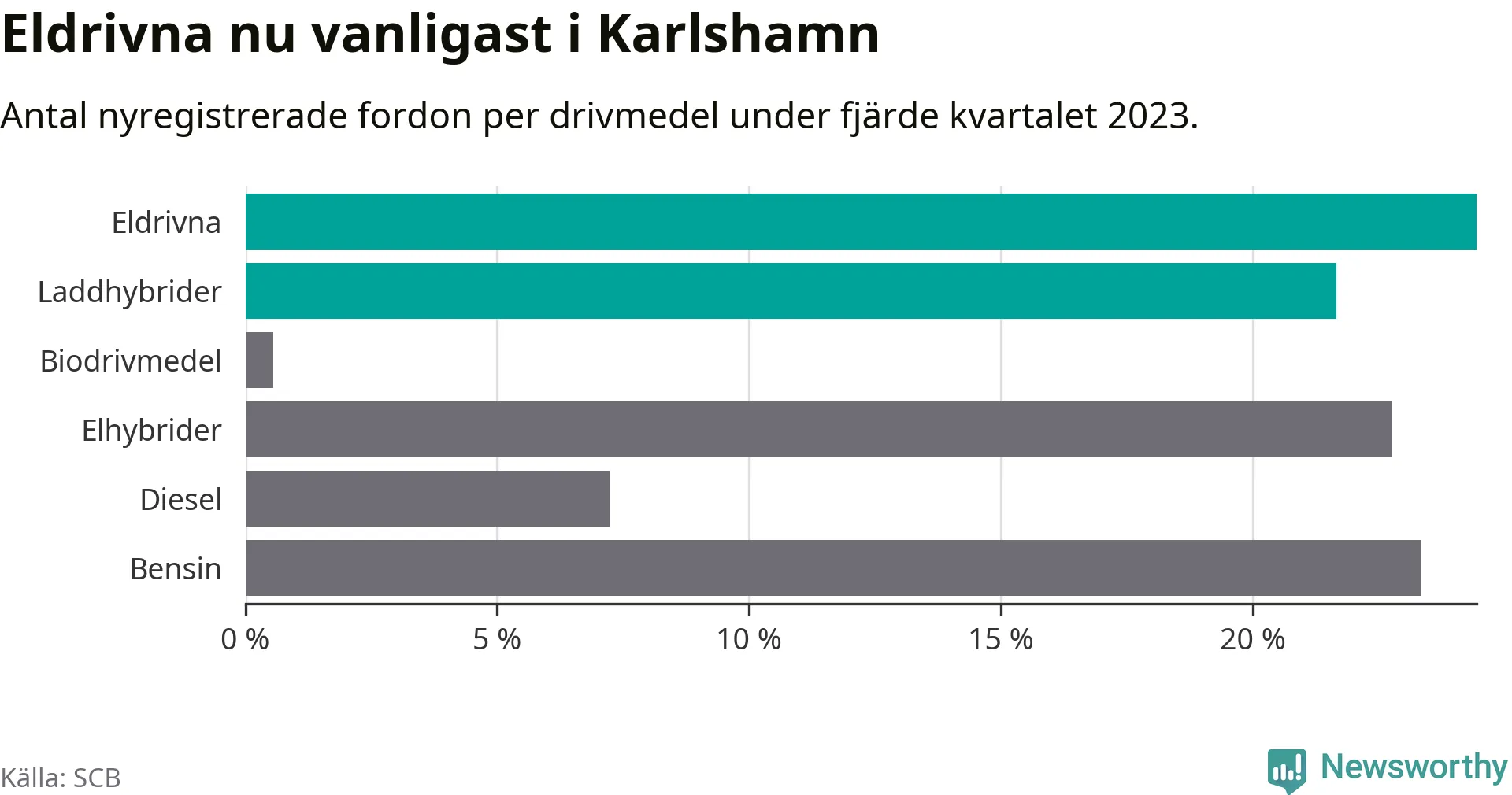 I Karlshamn var andelen laddbara bilar under fjärde kvartalet också lägre än under fjärde kvartalet 2022 då rekordet hittills noterades (46 procent).