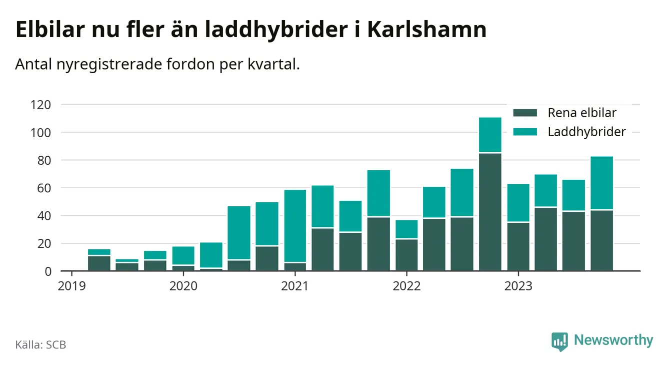 Under fjärde kvartalet var hälften av alla nyregistrerade bilar i Karlshamns kommun rena elbilar eller laddhybrider, en ökning jämfört med kvartalet innan. Detta trots att den slopade elbilsbonusen nu får elektrifieringen att stanna av.