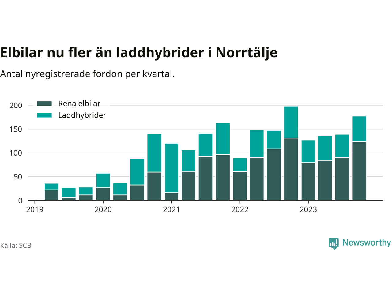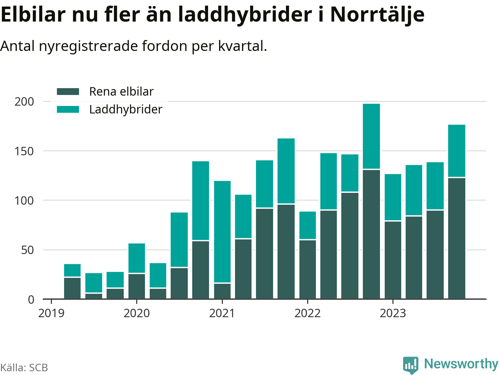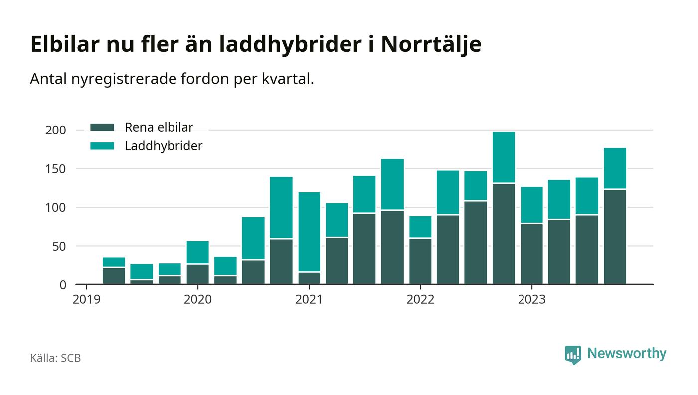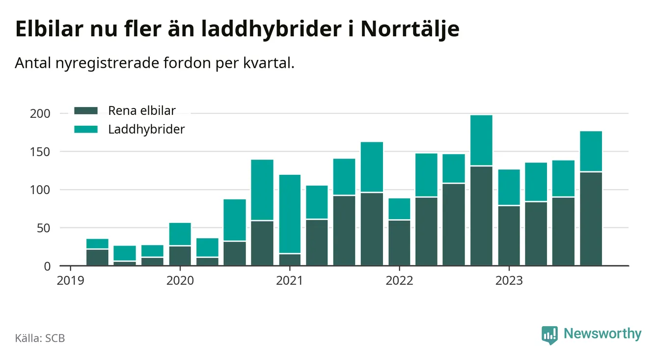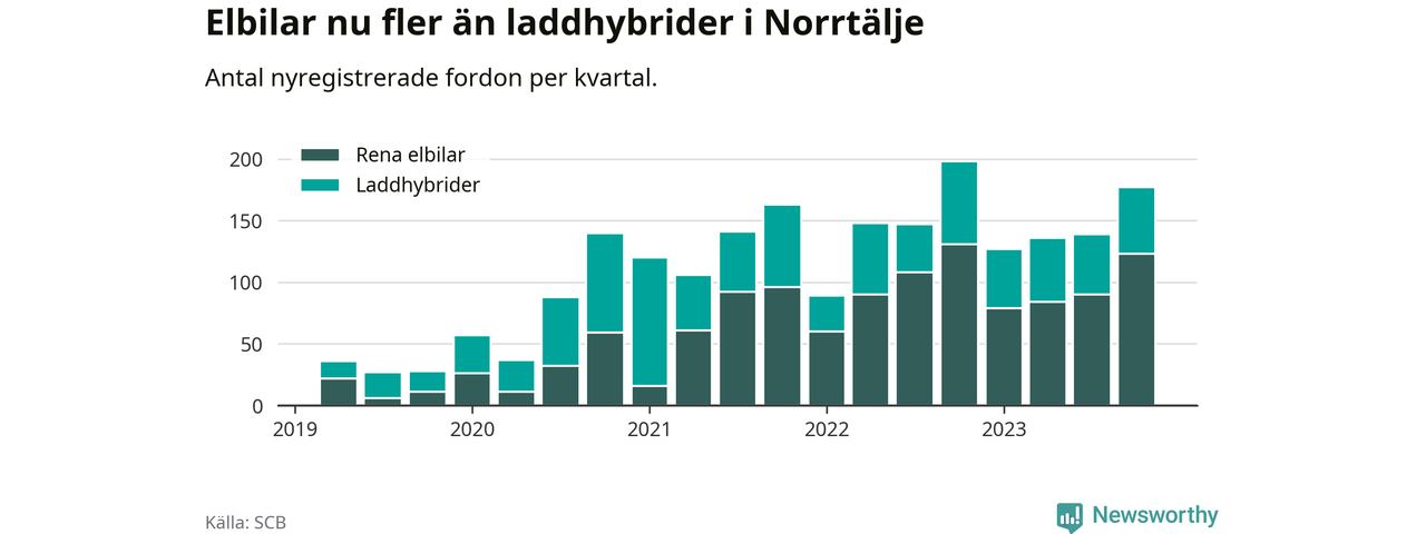 Under fjärde kvartalet 2023 var 48 procent av alla nyregistrerade personbilar i Norrtälje laddbara (sammanlagt registrerades 371 nya bilar). Merparten av de laddbara bilarna var rena elbilar (33 procent av alla).
