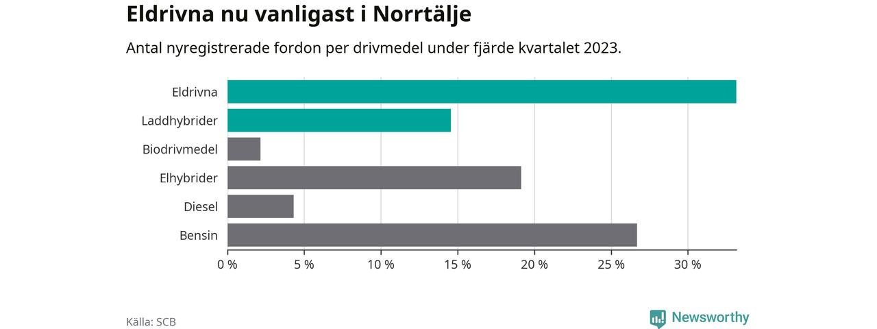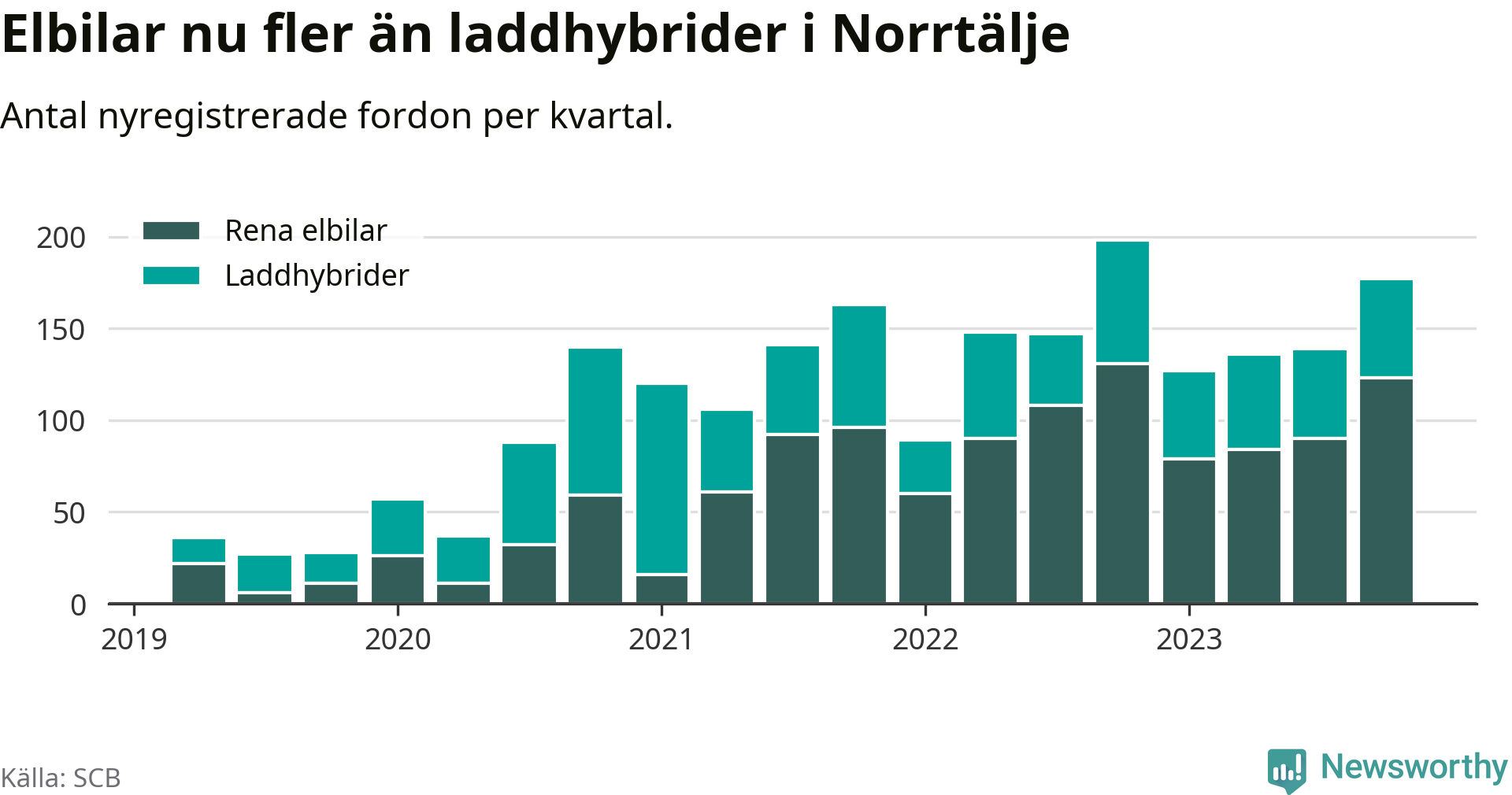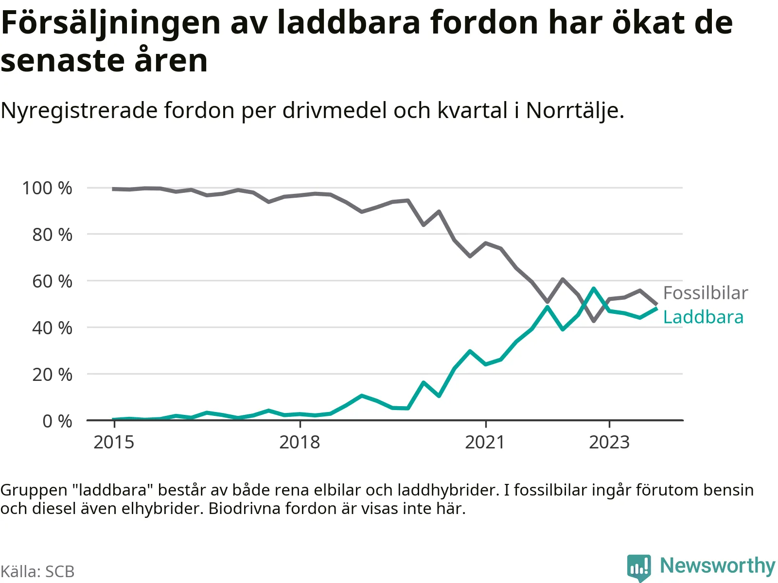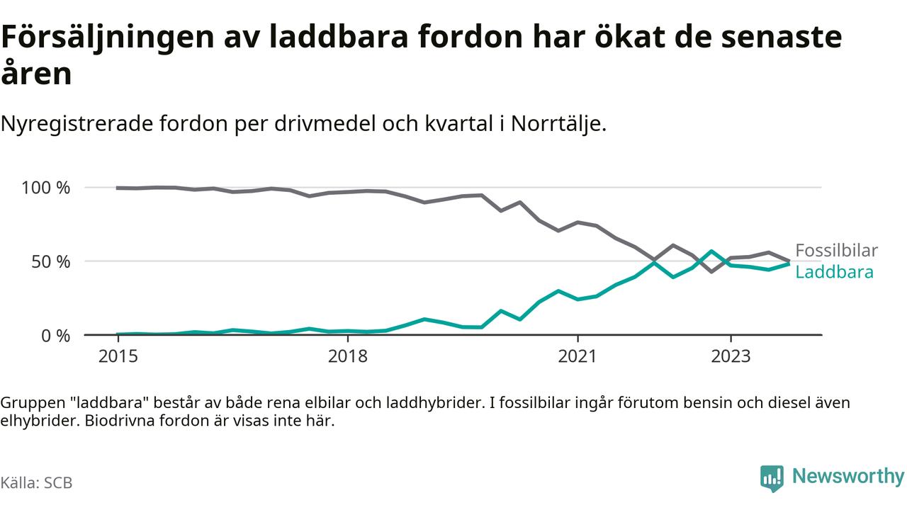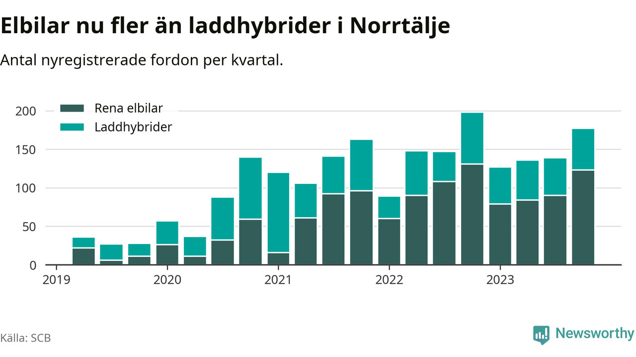 Under fjärde kvartalet 2023 var 48 procent av alla nyregistrerade personbilar i Norrtälje laddbara (sammanlagt registrerades 371 nya bilar). Merparten av de laddbara bilarna var rena elbilar (33 procent av alla).