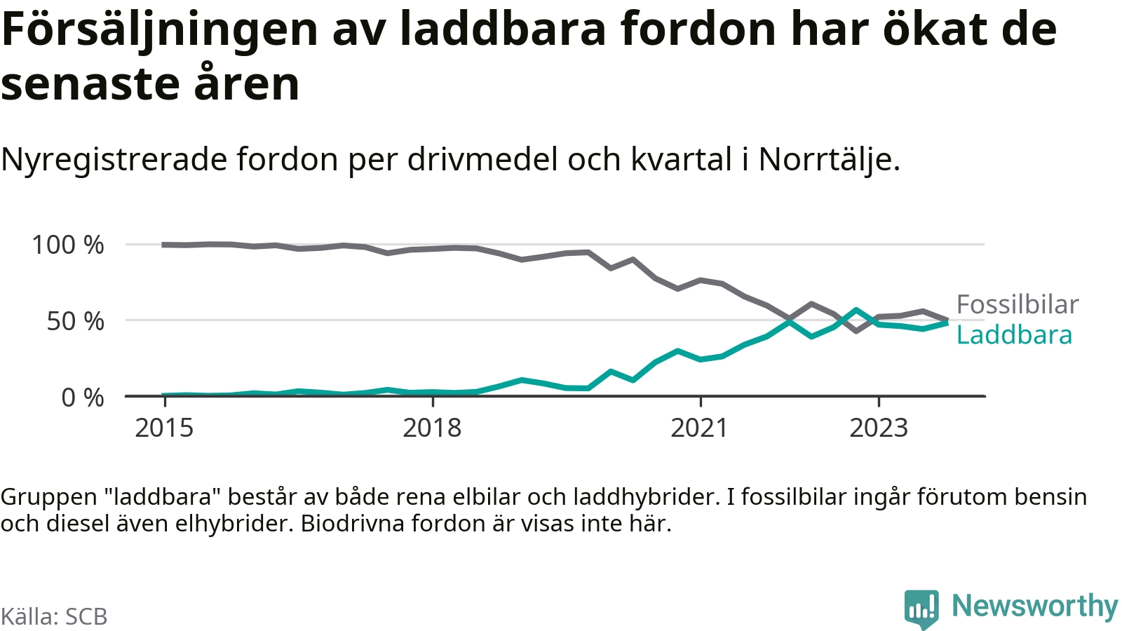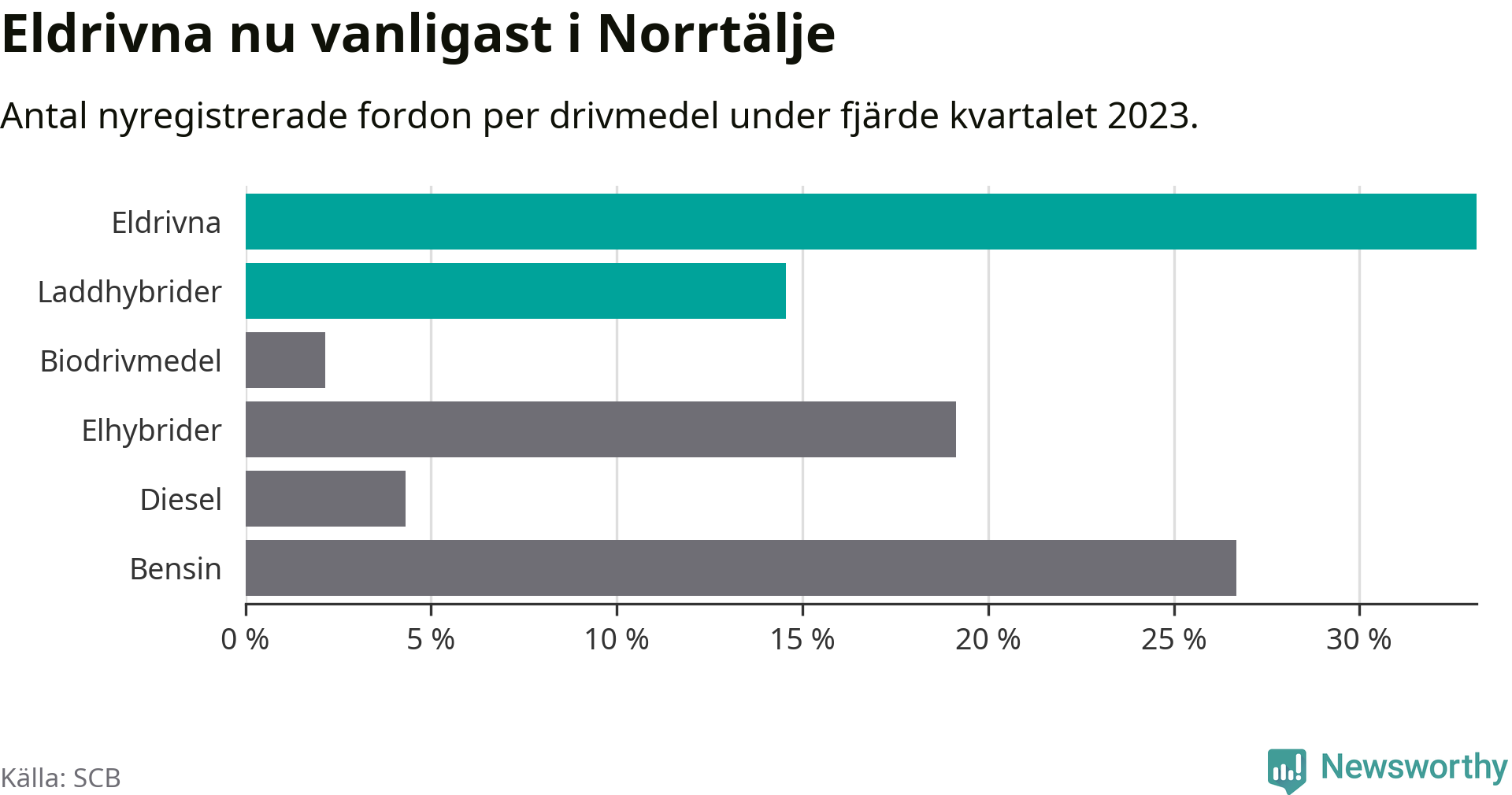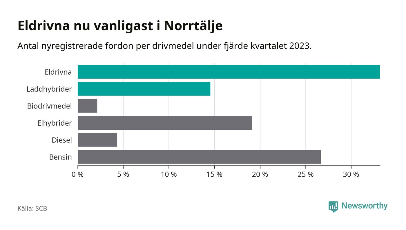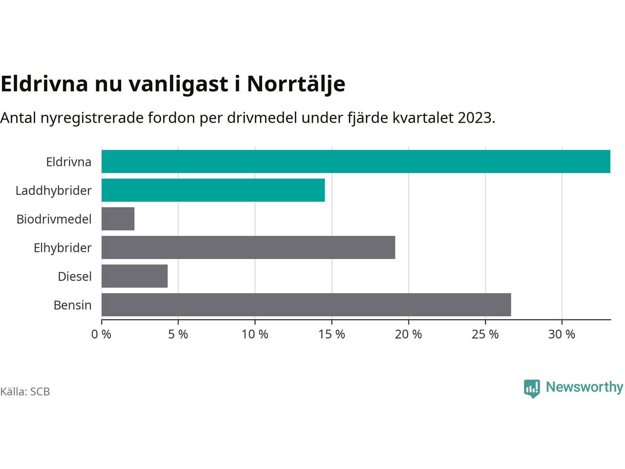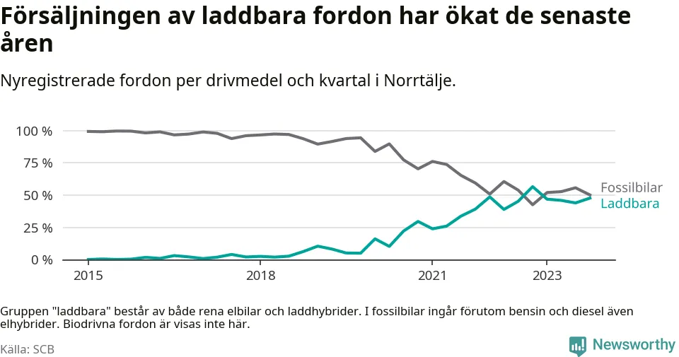 Under fjärde kvartalet 2023 var 48 procent av alla nyregistrerade personbilar i Norrtälje laddbara (sammanlagt registrerades 371 nya bilar). Merparten av de laddbara bilarna var rena elbilar (33 procent av alla).