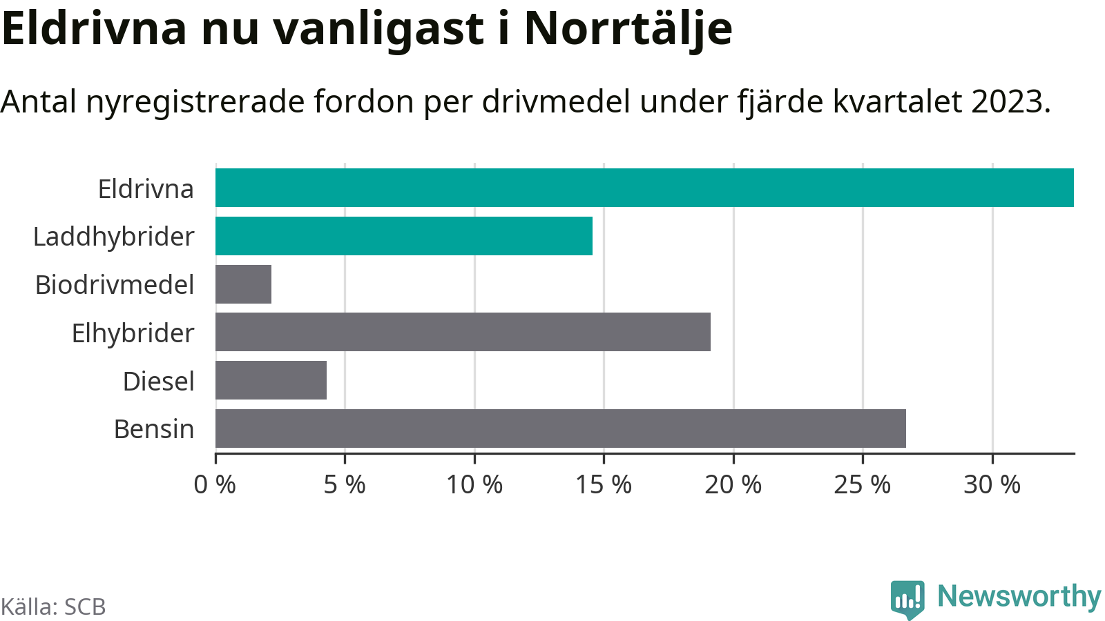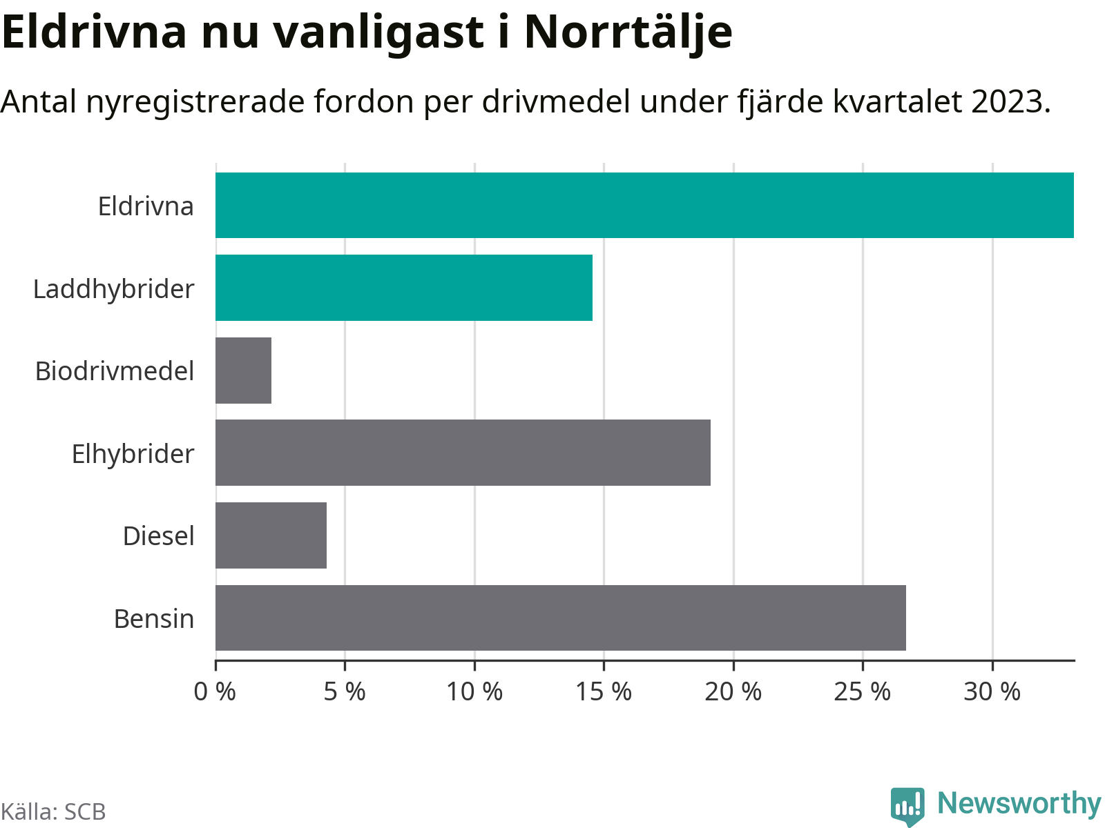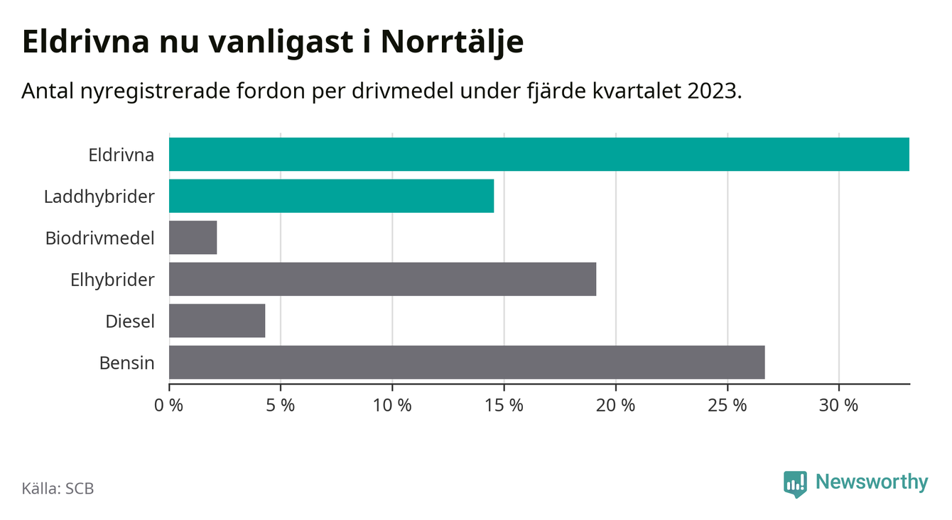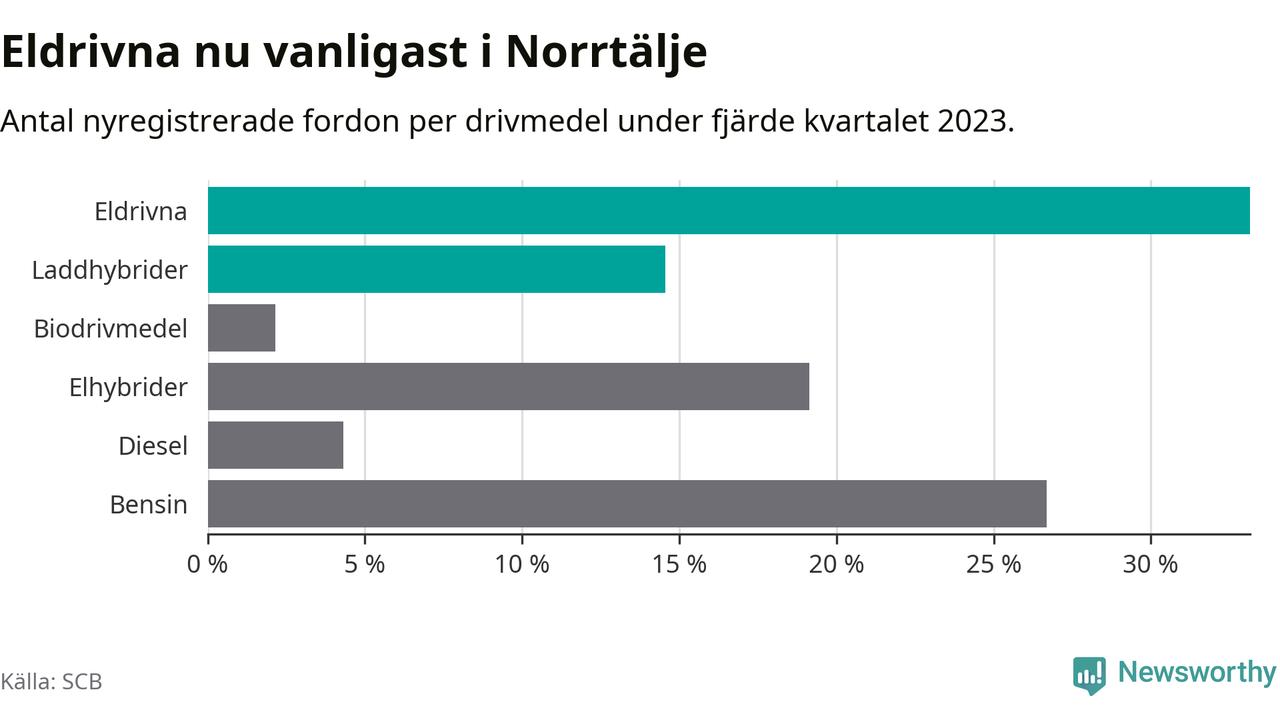 Under fjärde kvartalet 2023 var 48 procent av alla nyregistrerade personbilar i Norrtälje laddbara (sammanlagt registrerades 371 nya bilar). Merparten av de laddbara bilarna var rena elbilar (33 procent av alla).