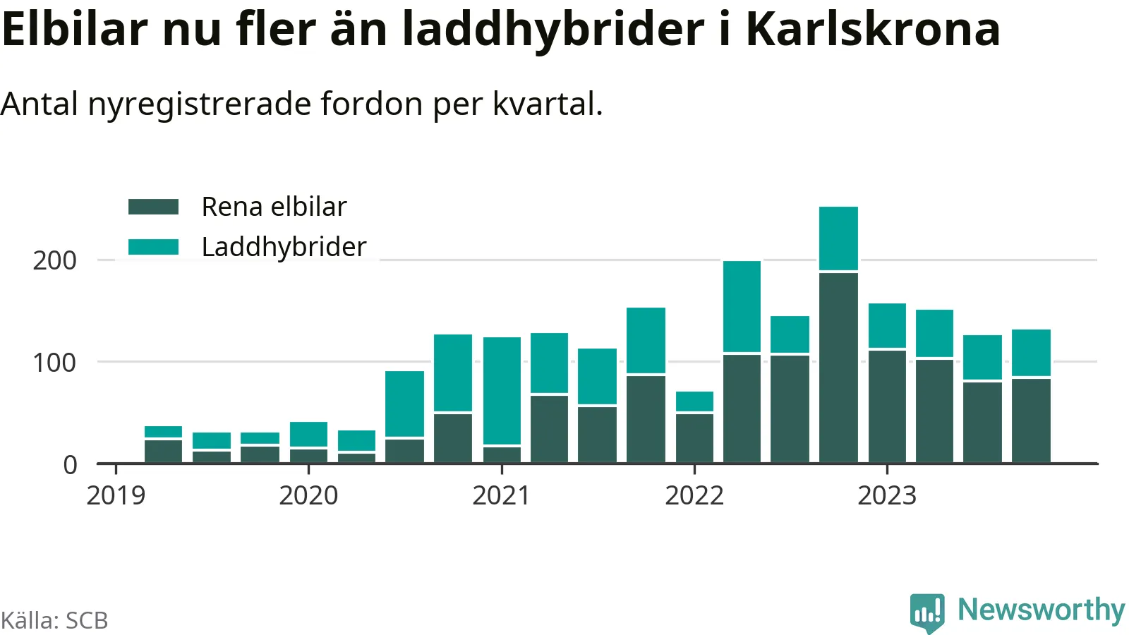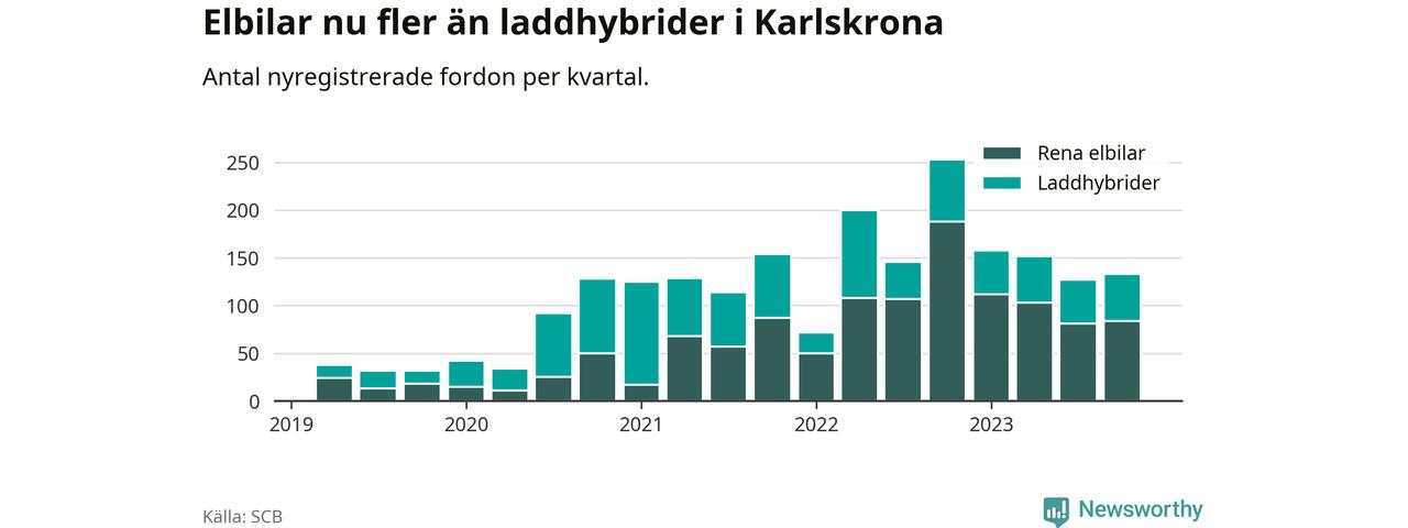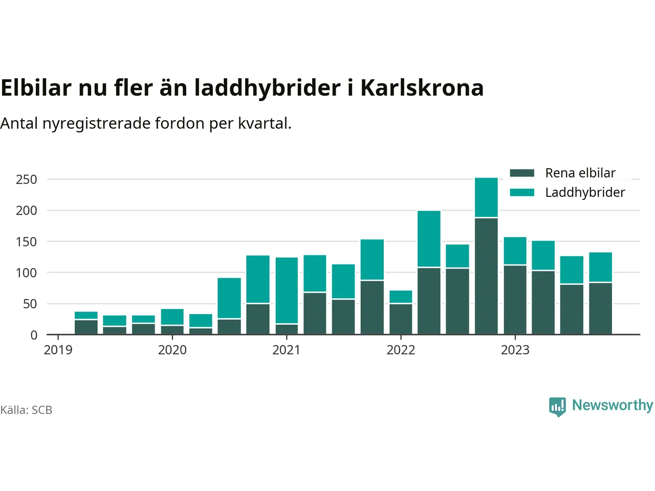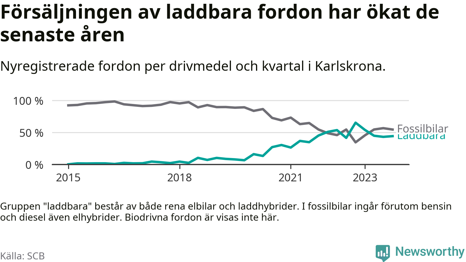 Under fjärde kvartalet 2023 var 44 procent av alla nyregistrerade personbilar i Karlskrona laddbara (sammanlagt registrerades 300 nya bilar). Merparten av de laddbara bilarna var rena elbilar (28 procent av alla).