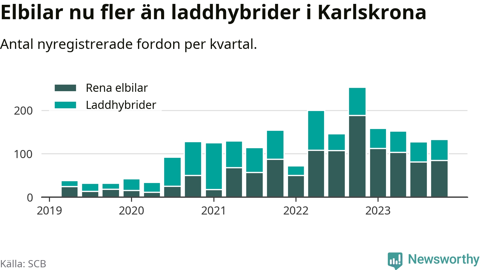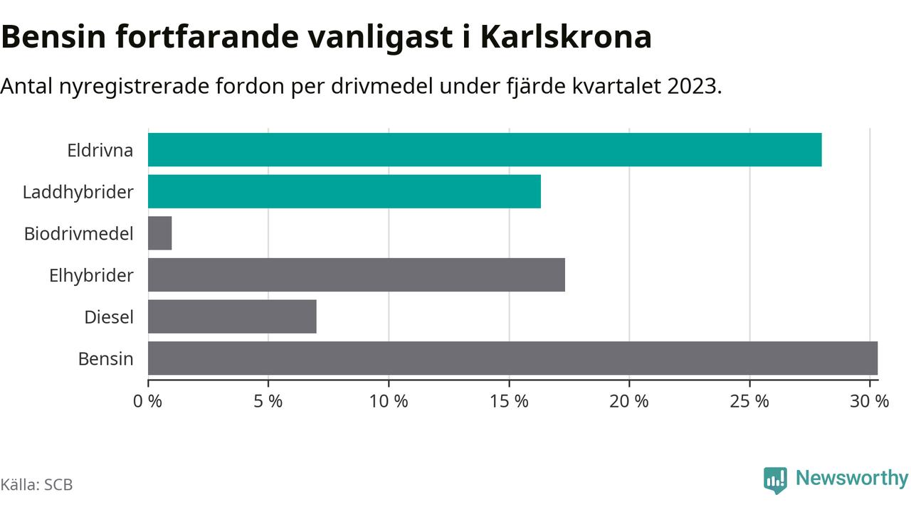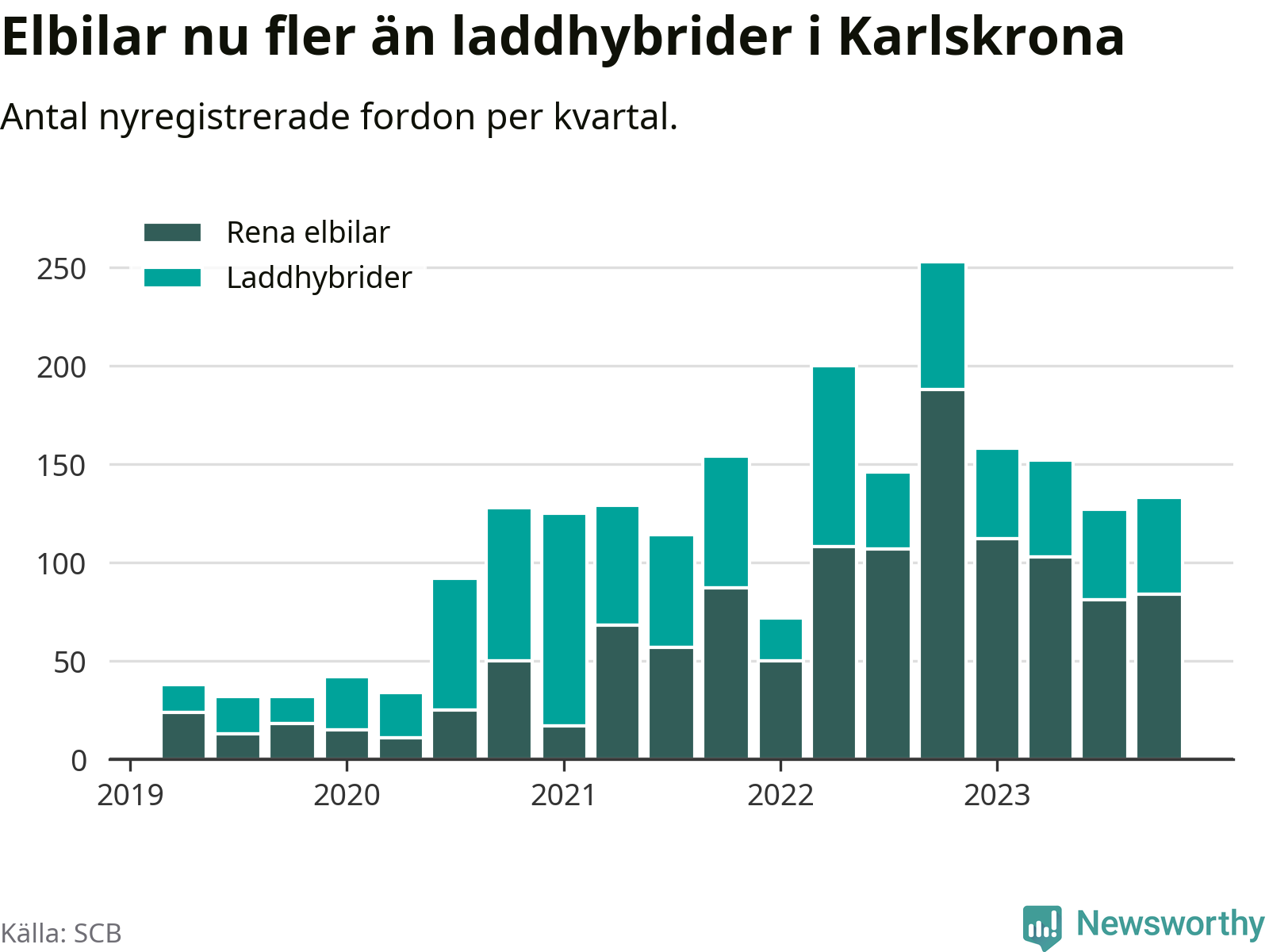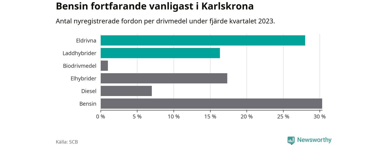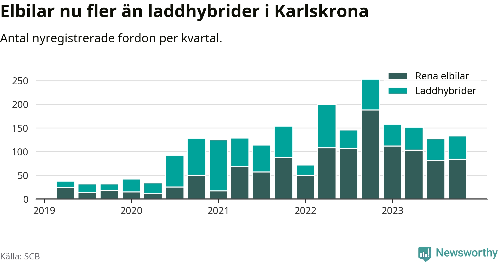 Under fjärde kvartalet 2023 var 44 procent av alla nyregistrerade personbilar i Karlskrona laddbara (sammanlagt registrerades 300 nya bilar). Merparten av de laddbara bilarna var rena elbilar (28 procent av alla).