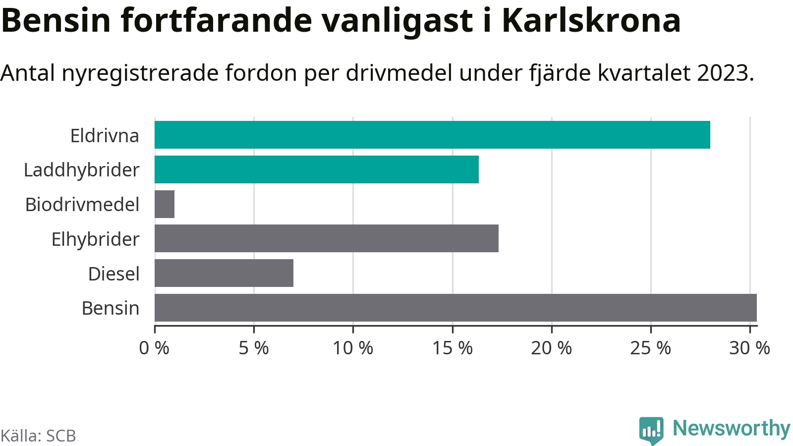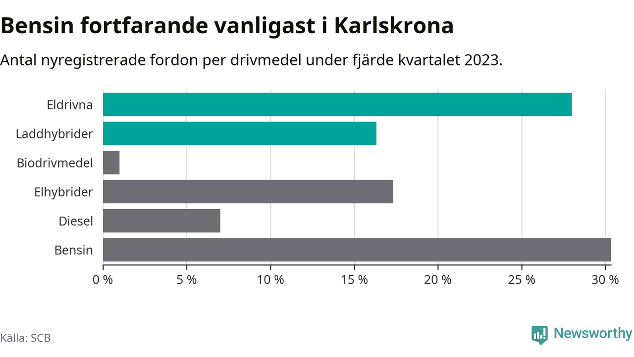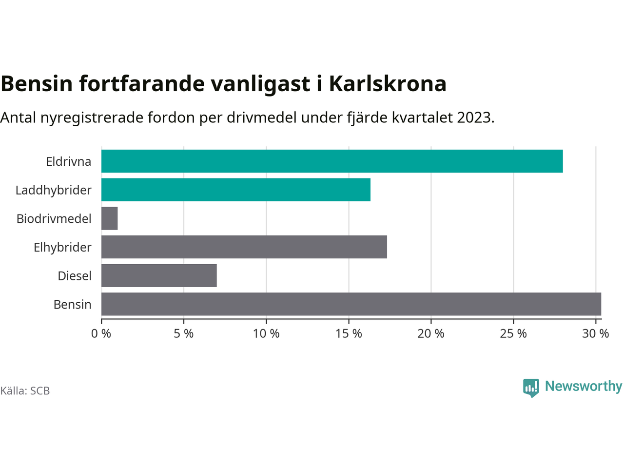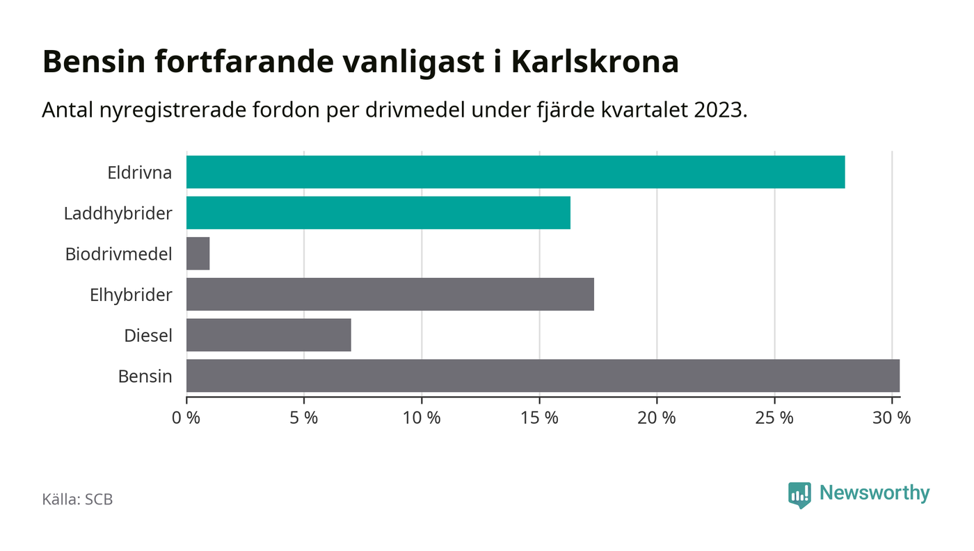 Under fjärde kvartalet 2023 var 44 procent av alla nyregistrerade personbilar i Karlskrona laddbara (sammanlagt registrerades 300 nya bilar). Merparten av de laddbara bilarna var rena elbilar (28 procent av alla).