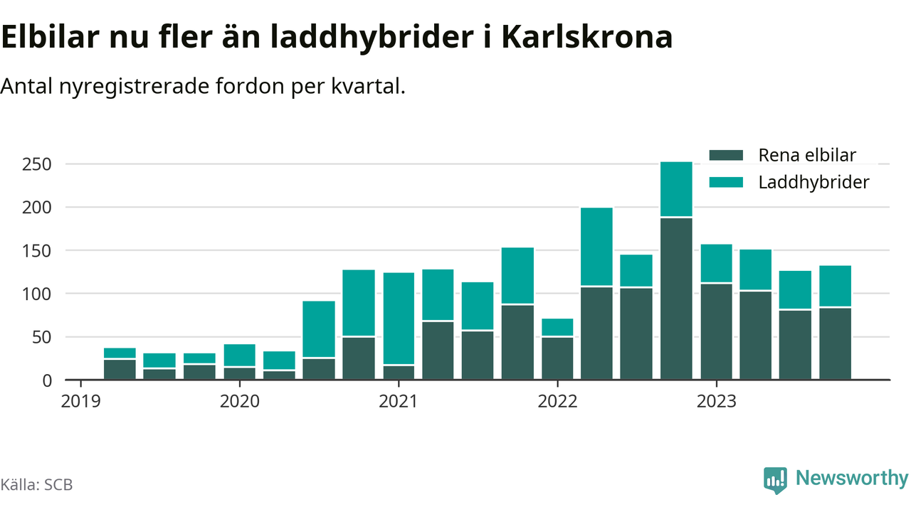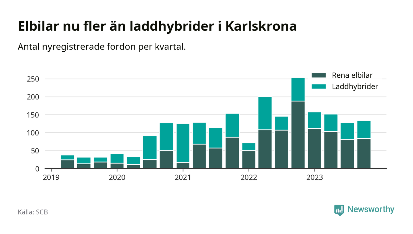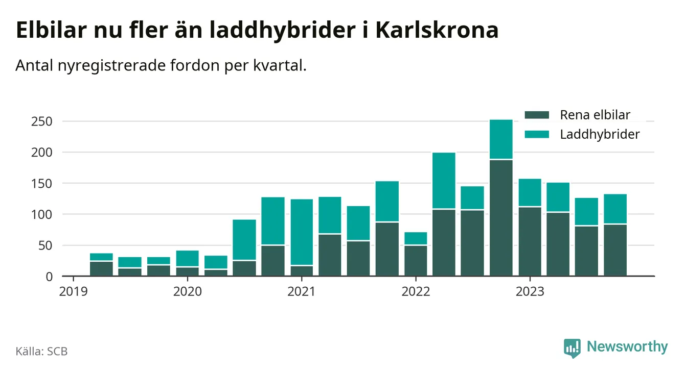 Under fjärde kvartalet var fyra av tio nyregistrerade bilar i Karlskrona kommun rena elbilar eller laddhybrider, en ökning jämfört med kvartalet innan. Detta trots att den slopade elbilsbonusen nu får elektrifieringen att stanna av.