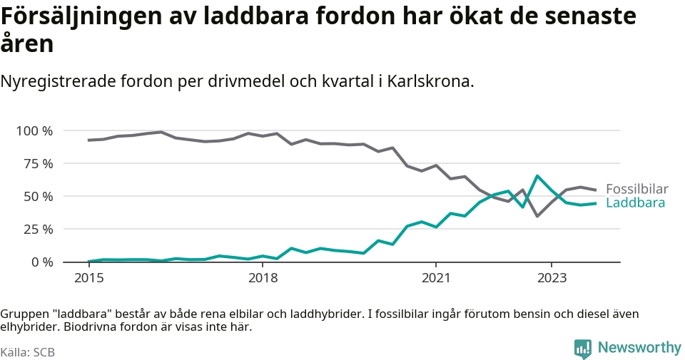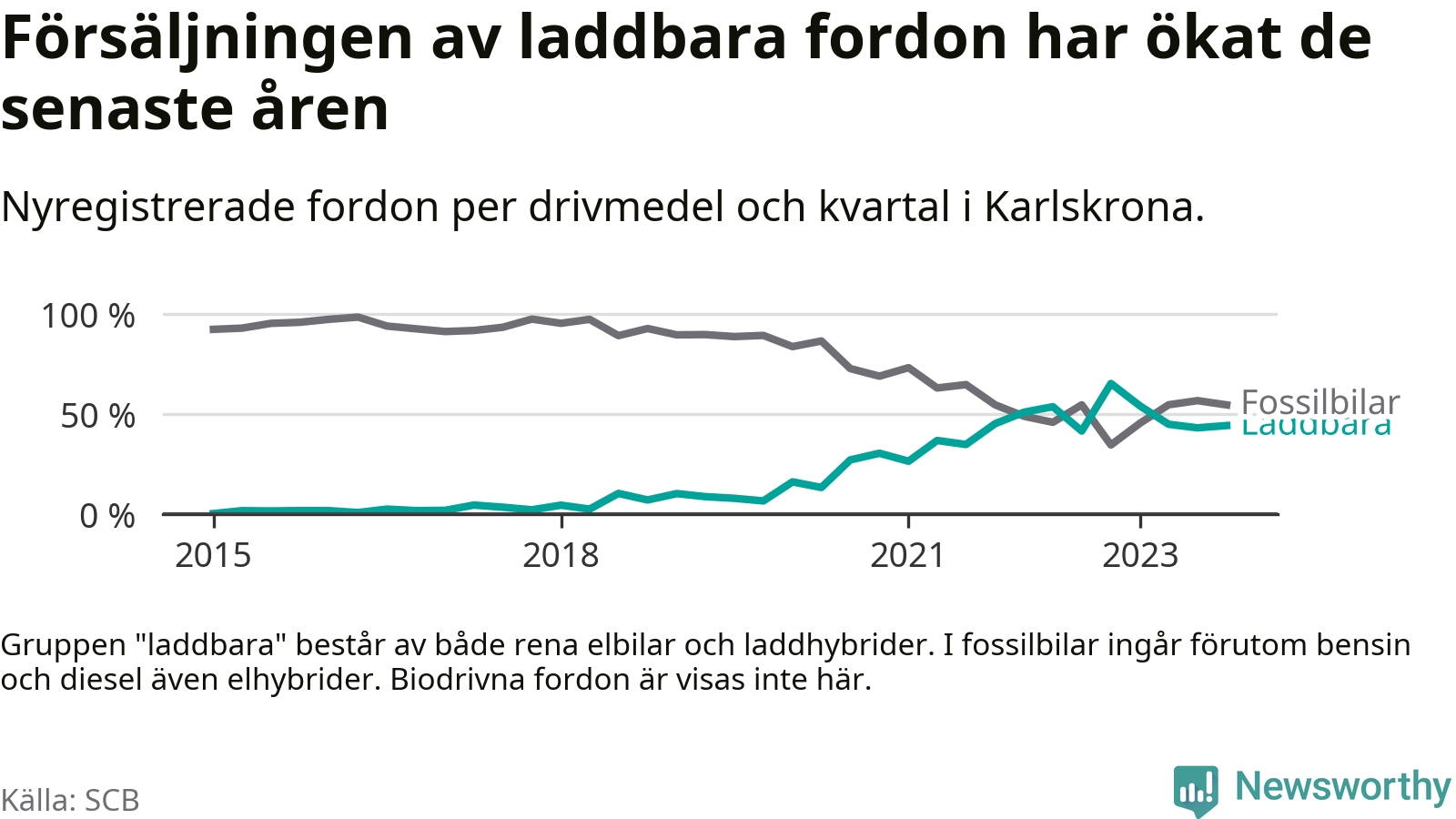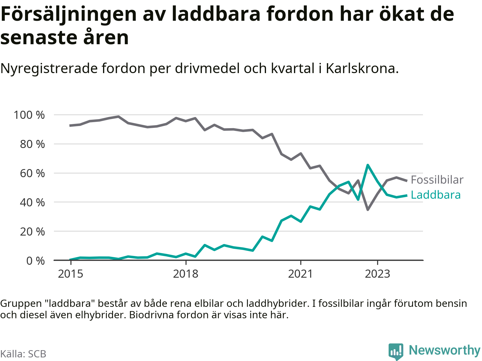 I Karlskrona var andelen laddbara bilar under fjärde kvartalet också lägre än under fjärde kvartalet 2022 då rekordet hittills noterades (65 procent).