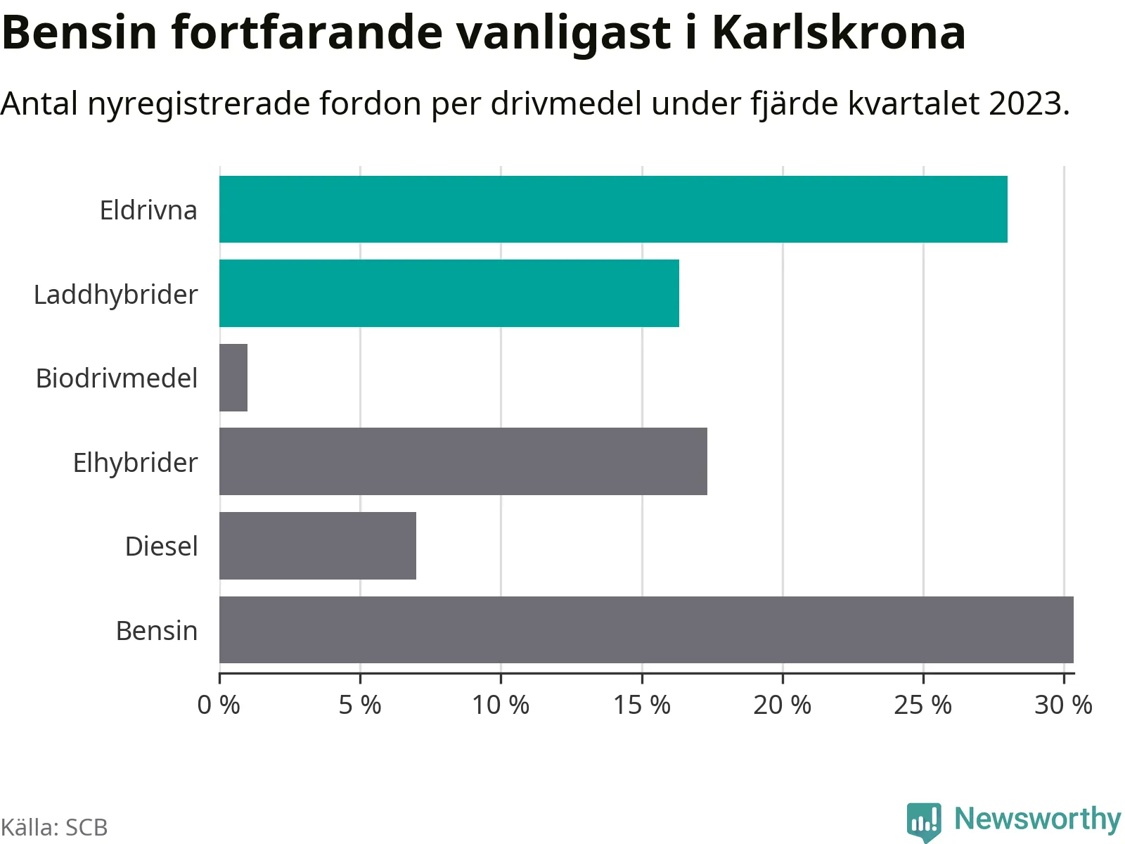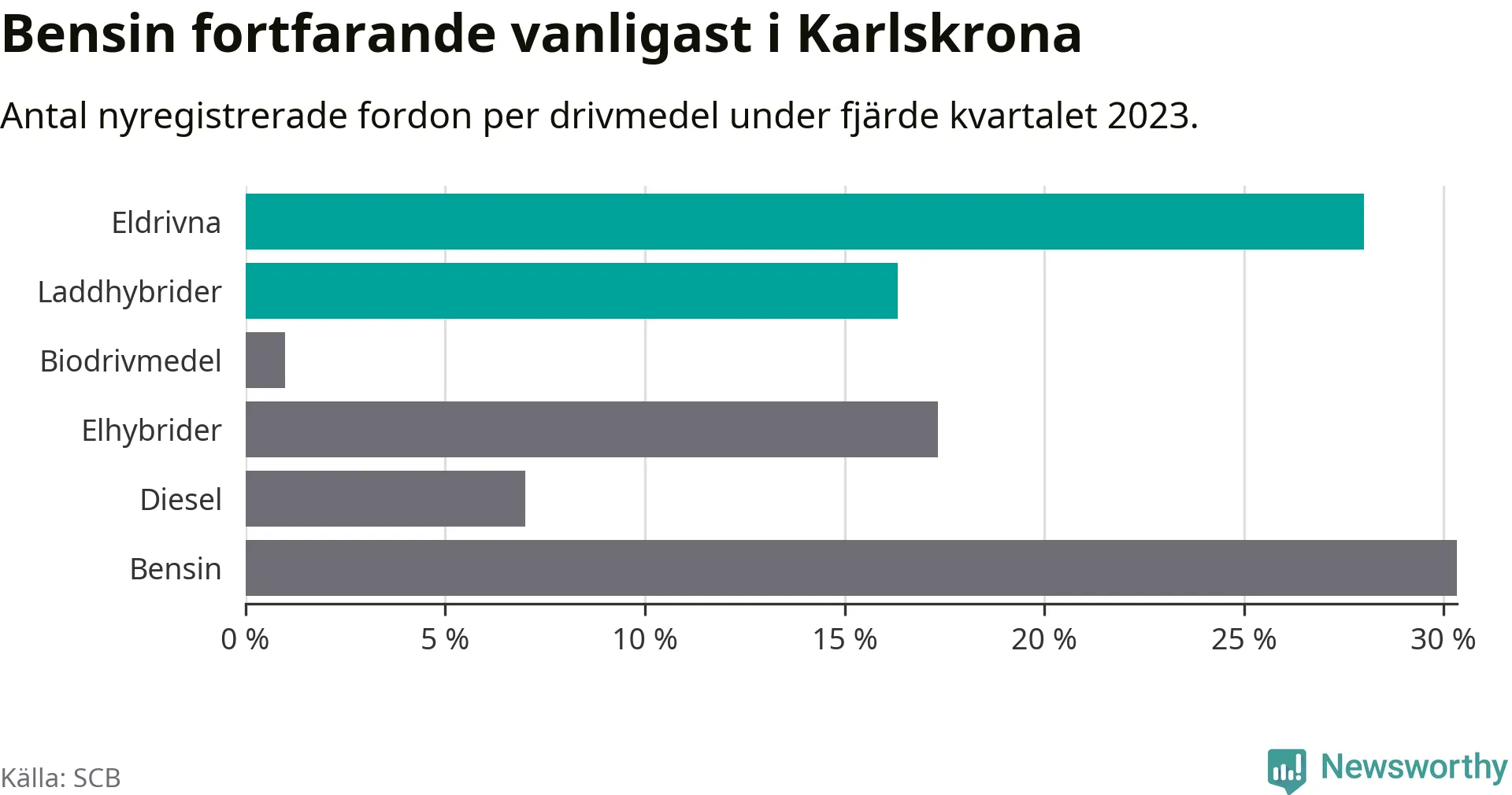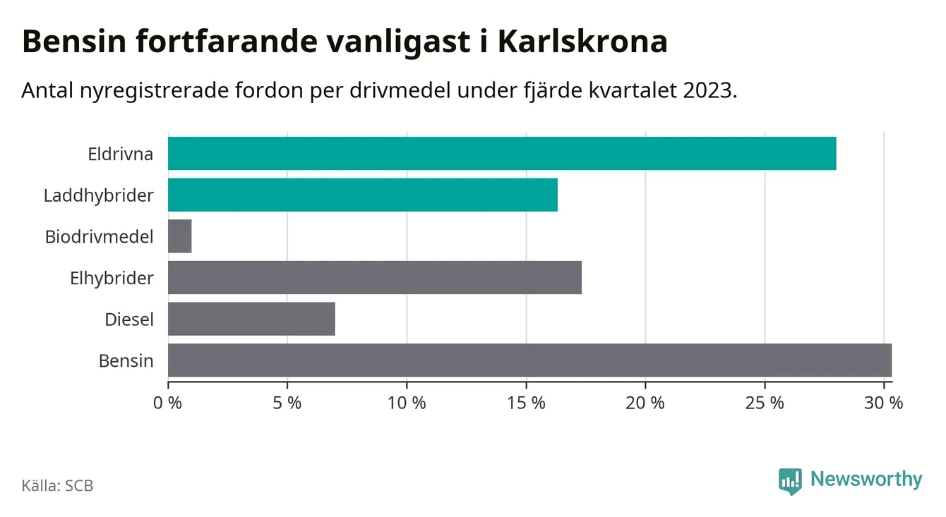 I Karlskrona var andelen laddbara bilar under fjärde kvartalet också lägre än under fjärde kvartalet 2022 då rekordet hittills noterades (65 procent).