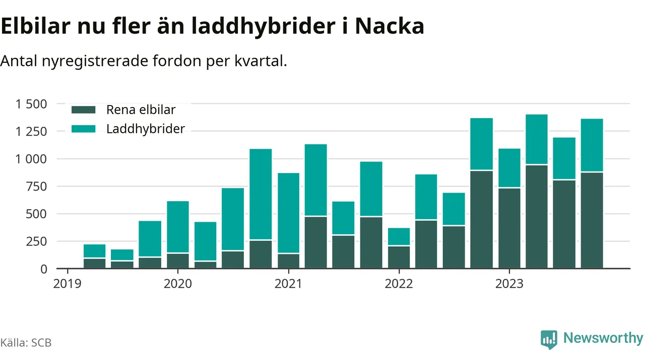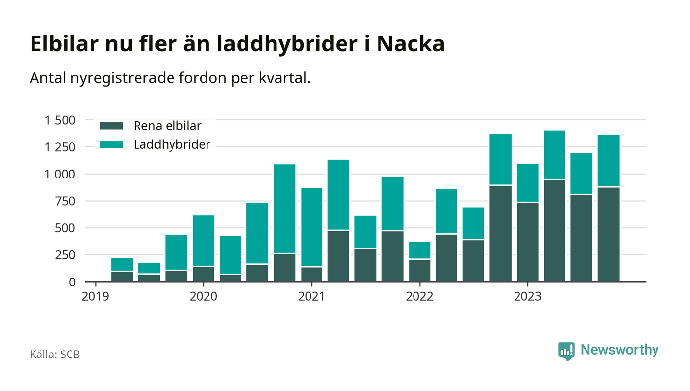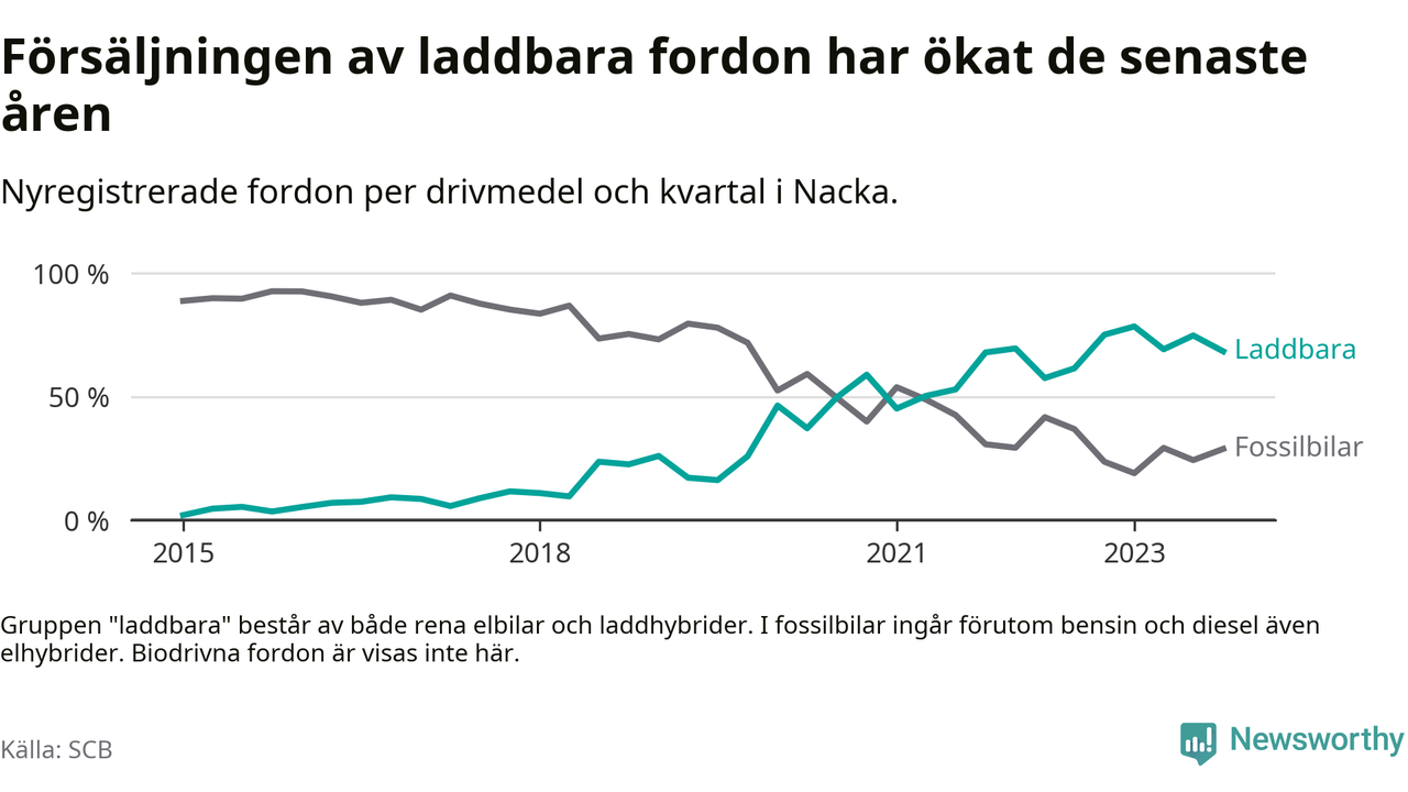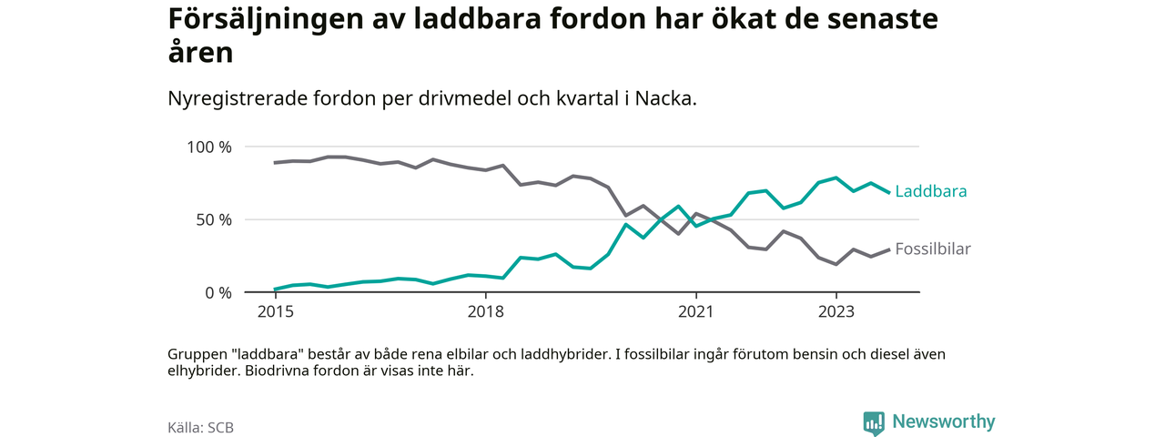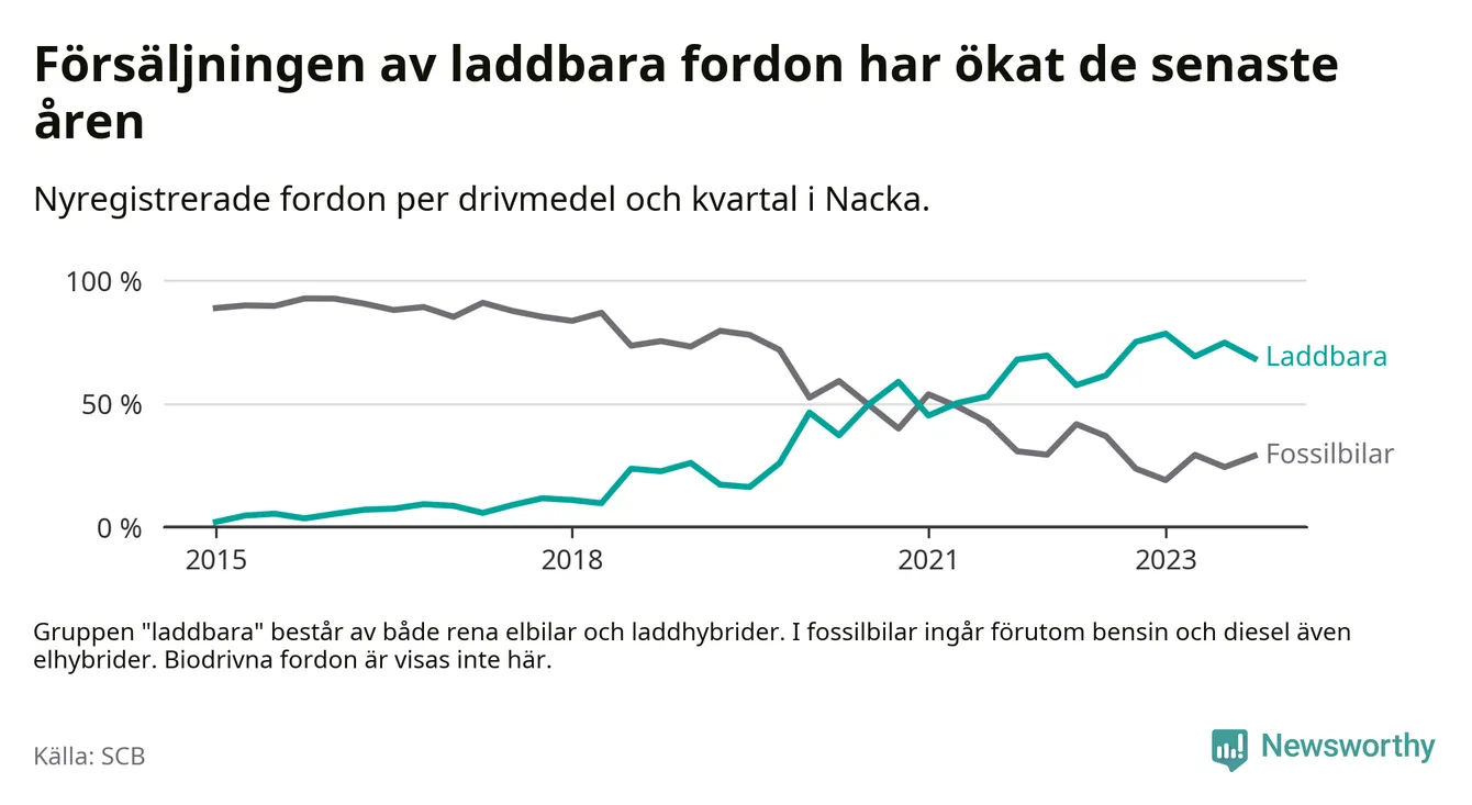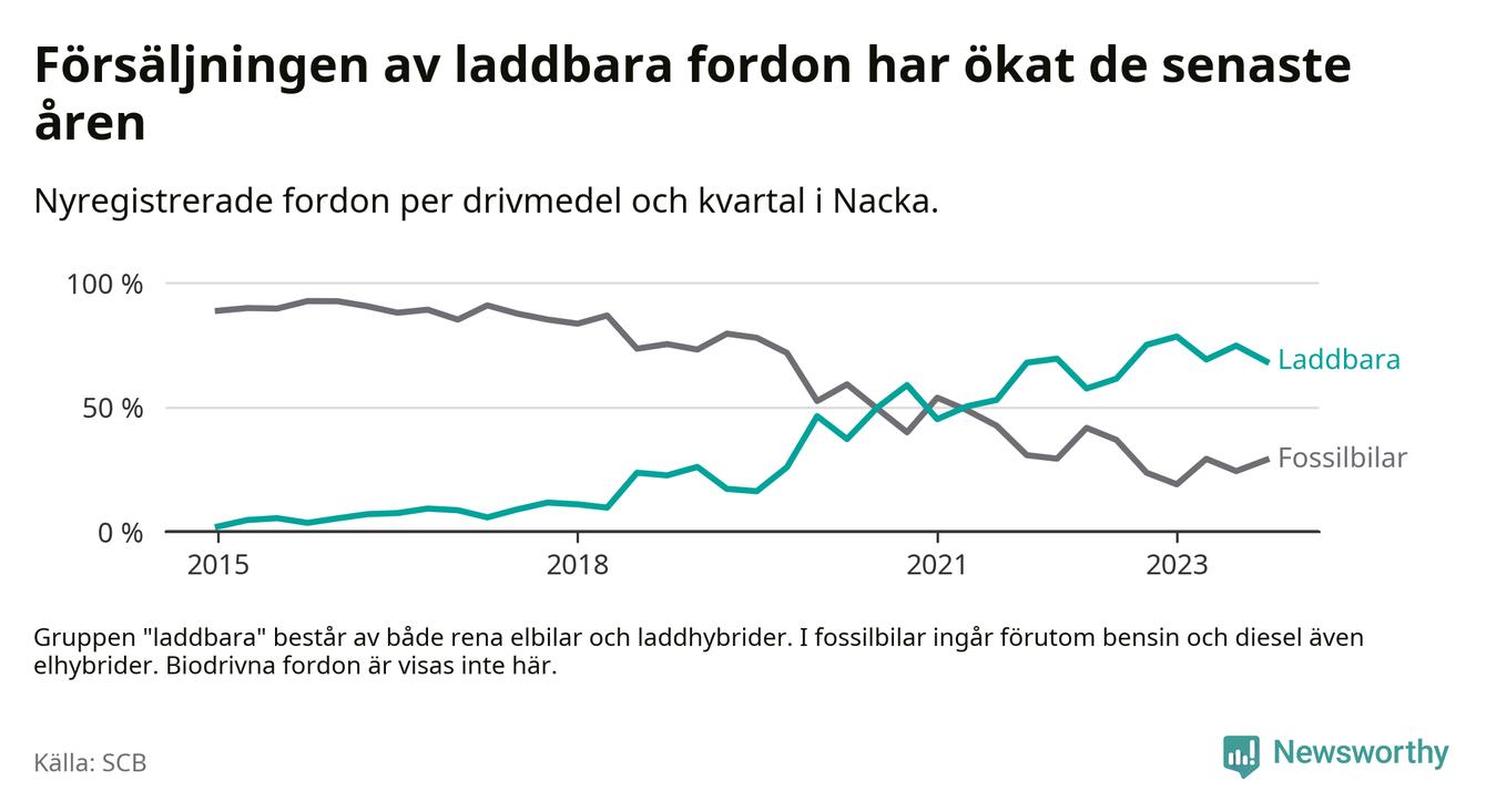 Under fjärde kvartalet 2023 var 68 procent av alla nyregistrerade personbilar i Nacka laddbara (sammanlagt registrerades 2 000 nya bilar). Merparten av de laddbara bilarna var rena elbilar (44 procent av alla).