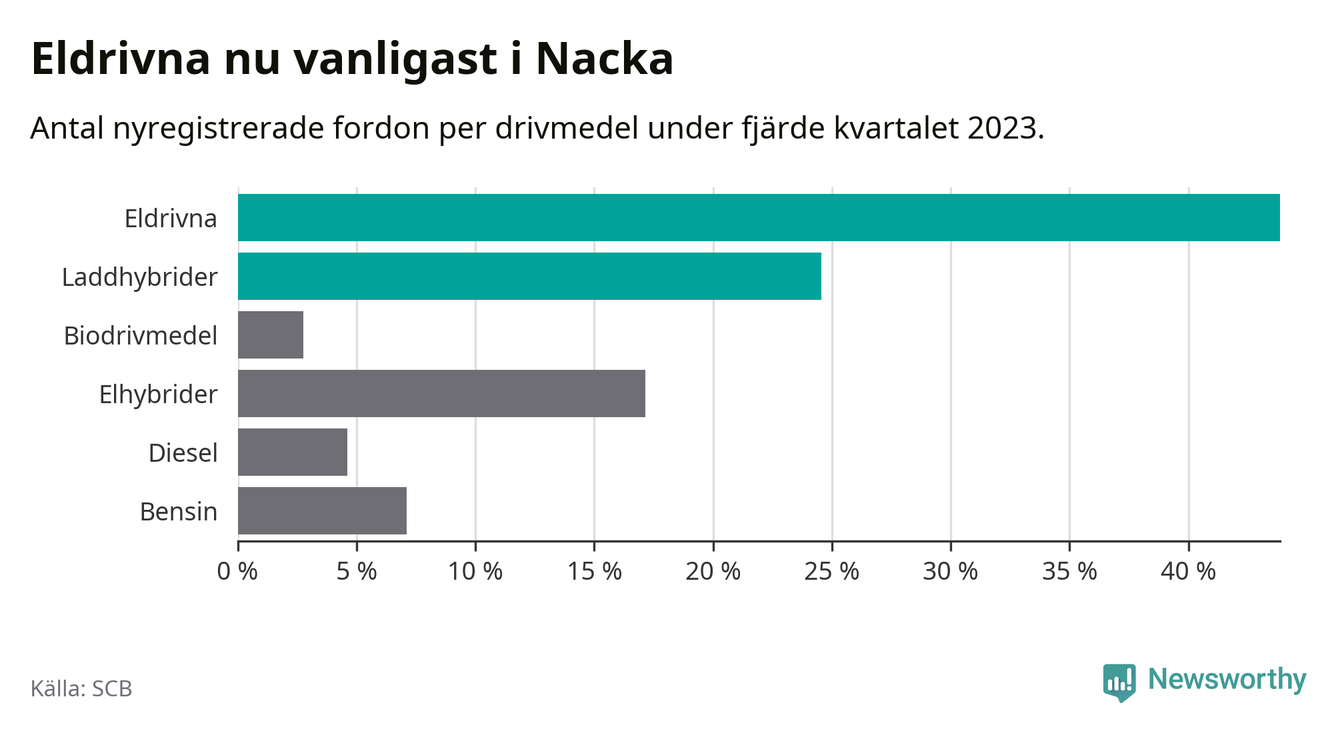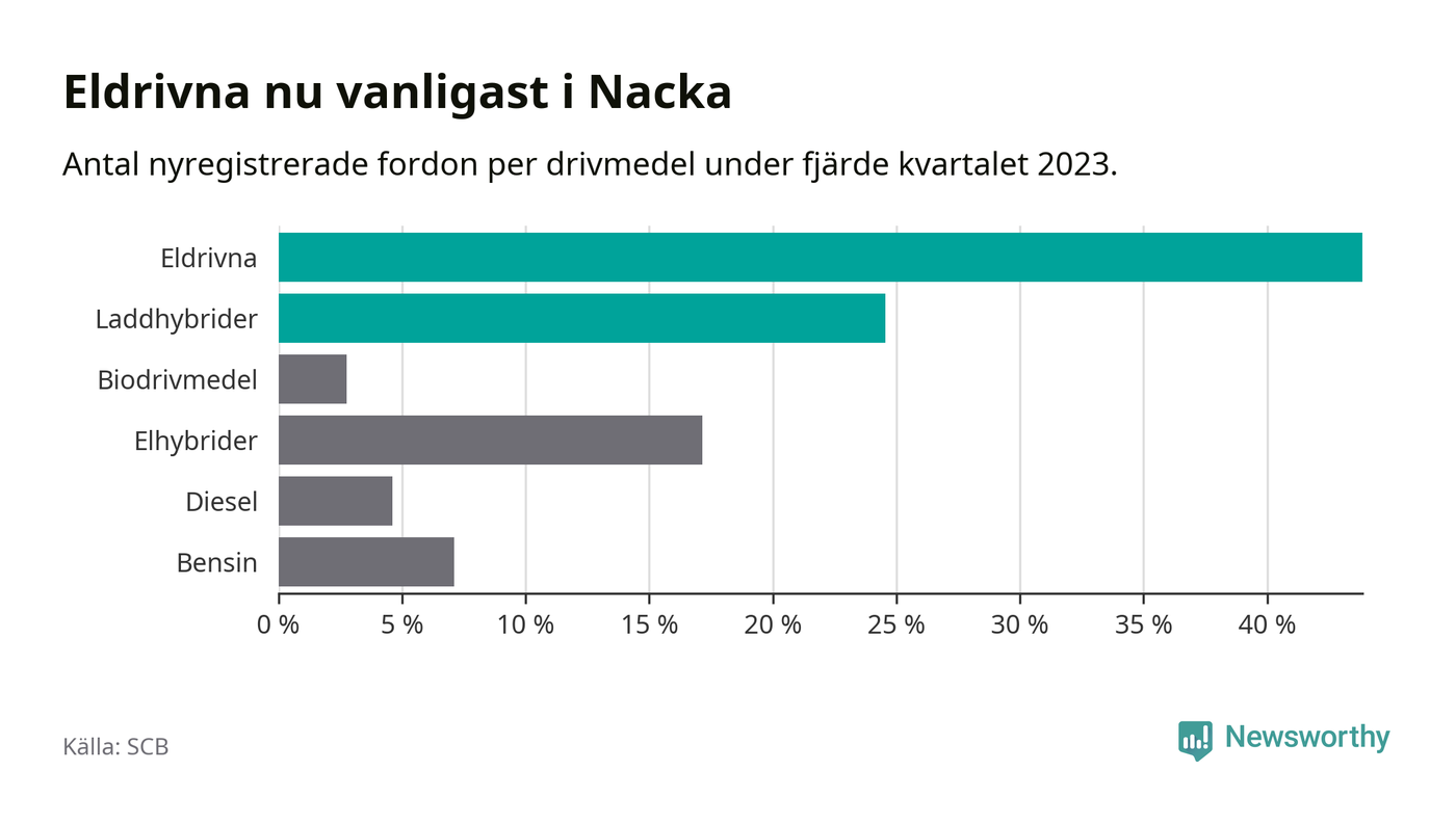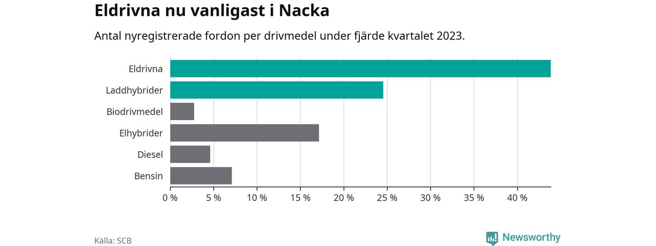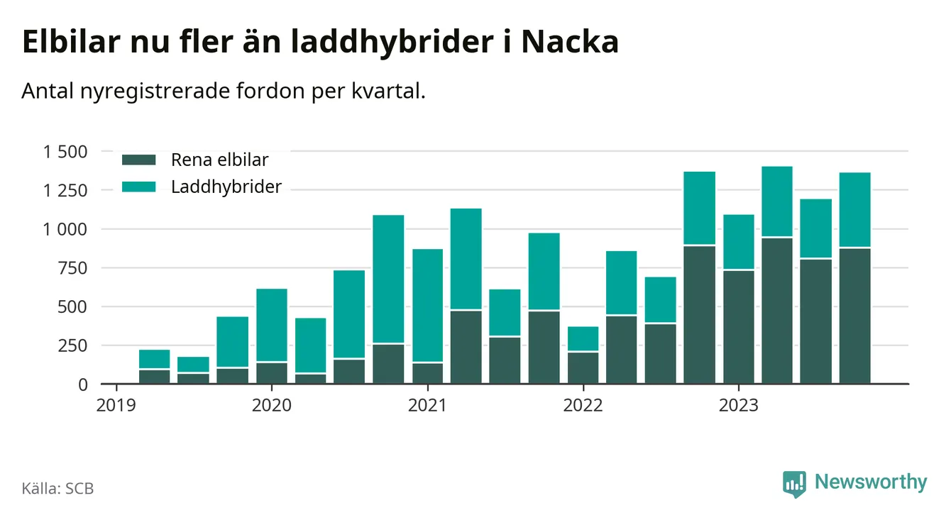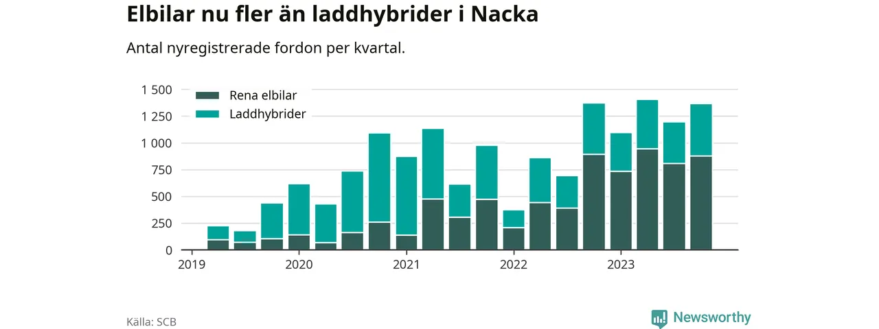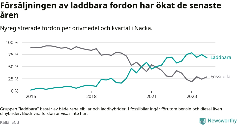 Under fjärde kvartalet 2023 var 68 procent av alla nyregistrerade personbilar i Nacka laddbara (sammanlagt registrerades 2 000 nya bilar). Merparten av de laddbara bilarna var rena elbilar (44 procent av alla).