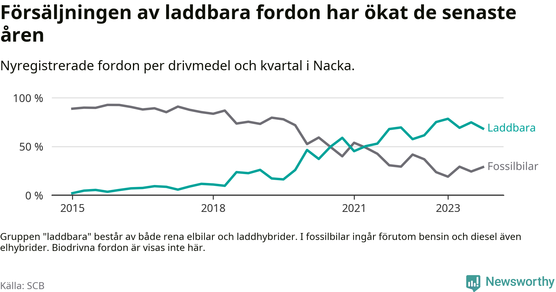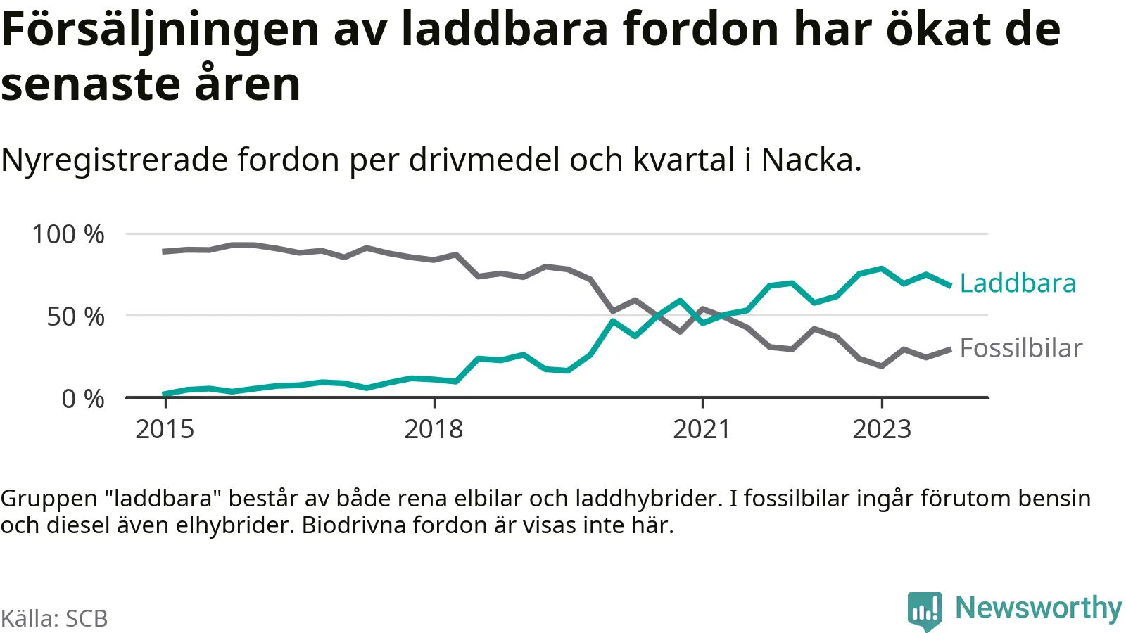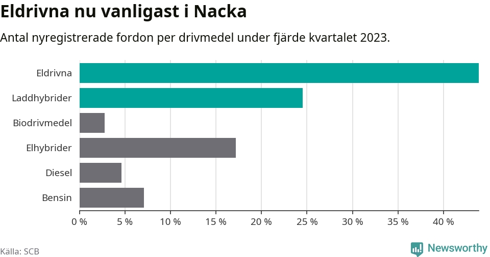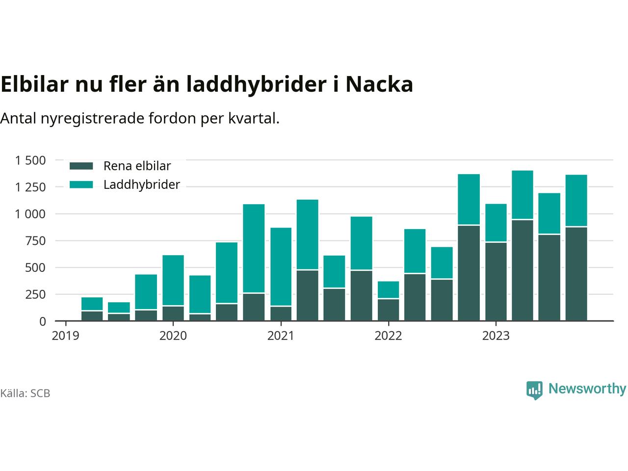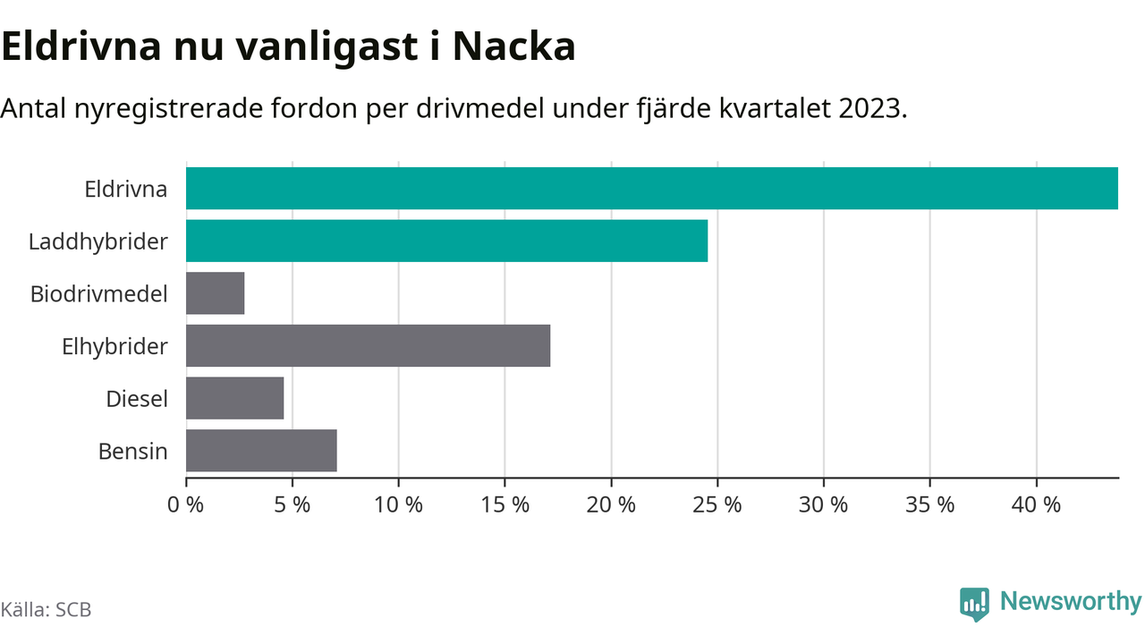 Under fjärde kvartalet 2023 var 68 procent av alla nyregistrerade personbilar i Nacka laddbara (sammanlagt registrerades 2 000 nya bilar). Merparten av de laddbara bilarna var rena elbilar (44 procent av alla).