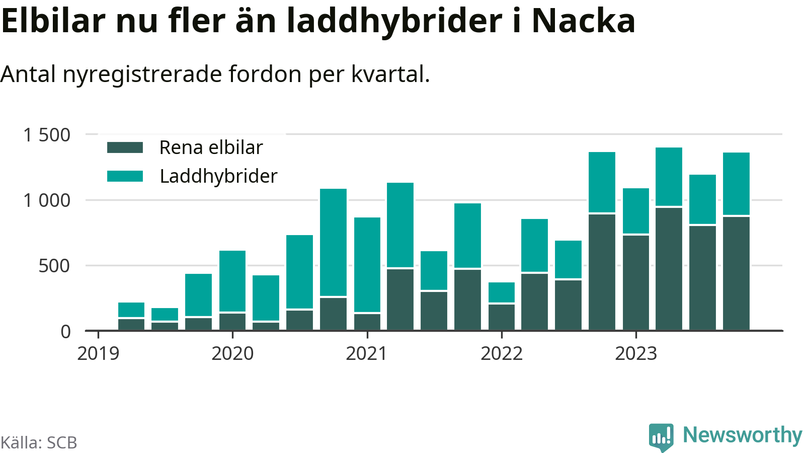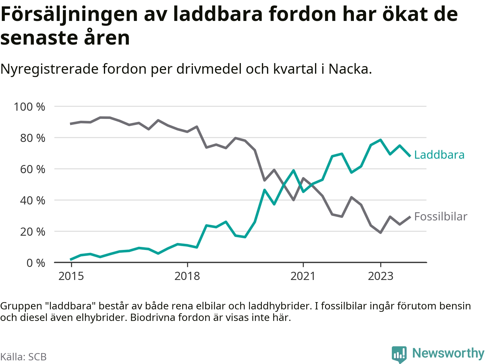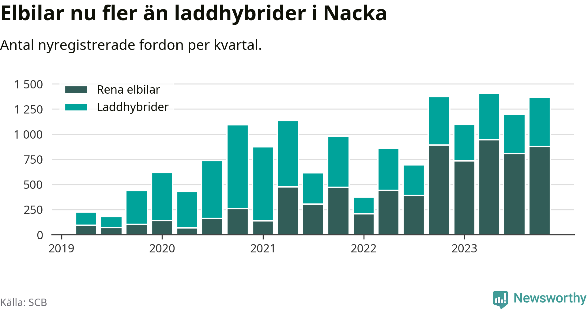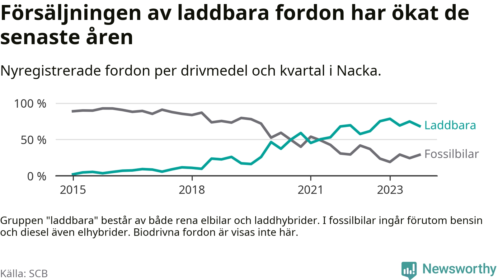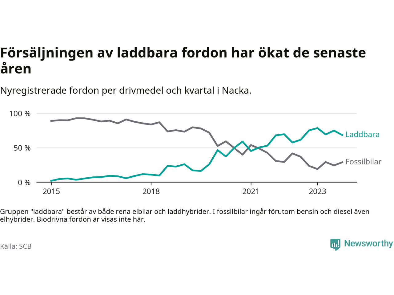 Under fjärde kvartalet 2023 var 68 procent av alla nyregistrerade personbilar i Nacka laddbara (sammanlagt registrerades 2 000 nya bilar). Merparten av de laddbara bilarna var rena elbilar (44 procent av alla).