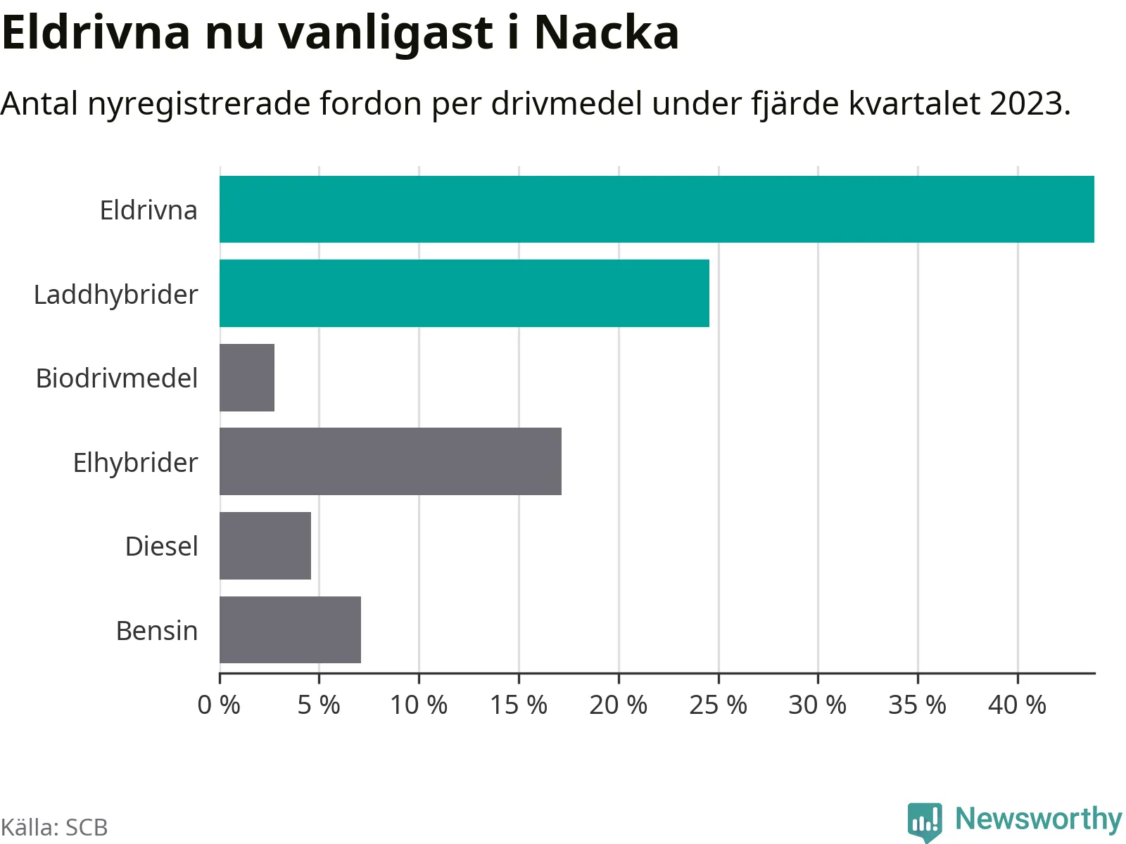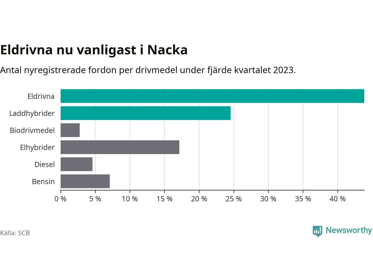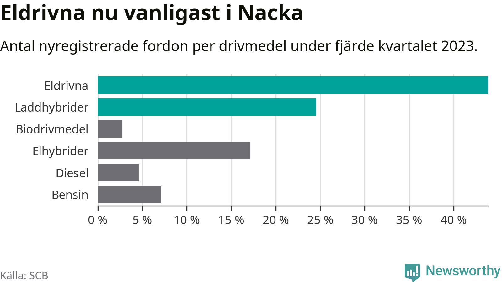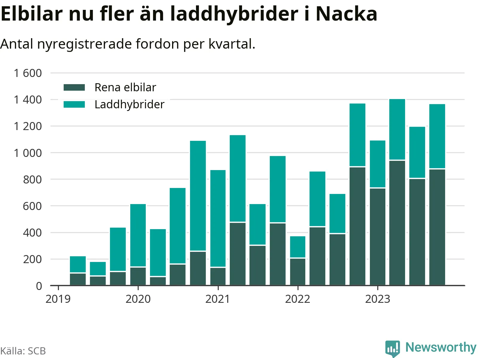 Under fjärde kvartalet 2023 var 68 procent av alla nyregistrerade personbilar i Nacka laddbara (sammanlagt registrerades 2 000 nya bilar). Merparten av de laddbara bilarna var rena elbilar (44 procent av alla).