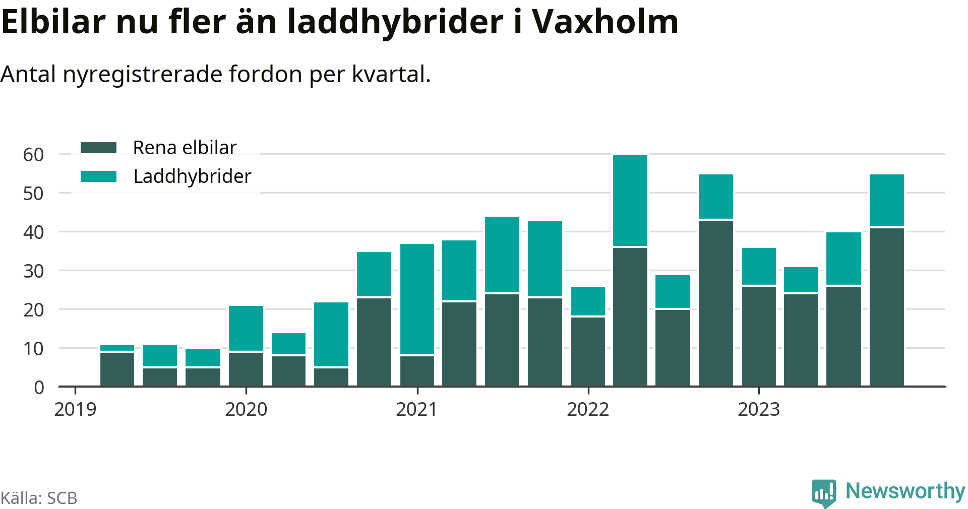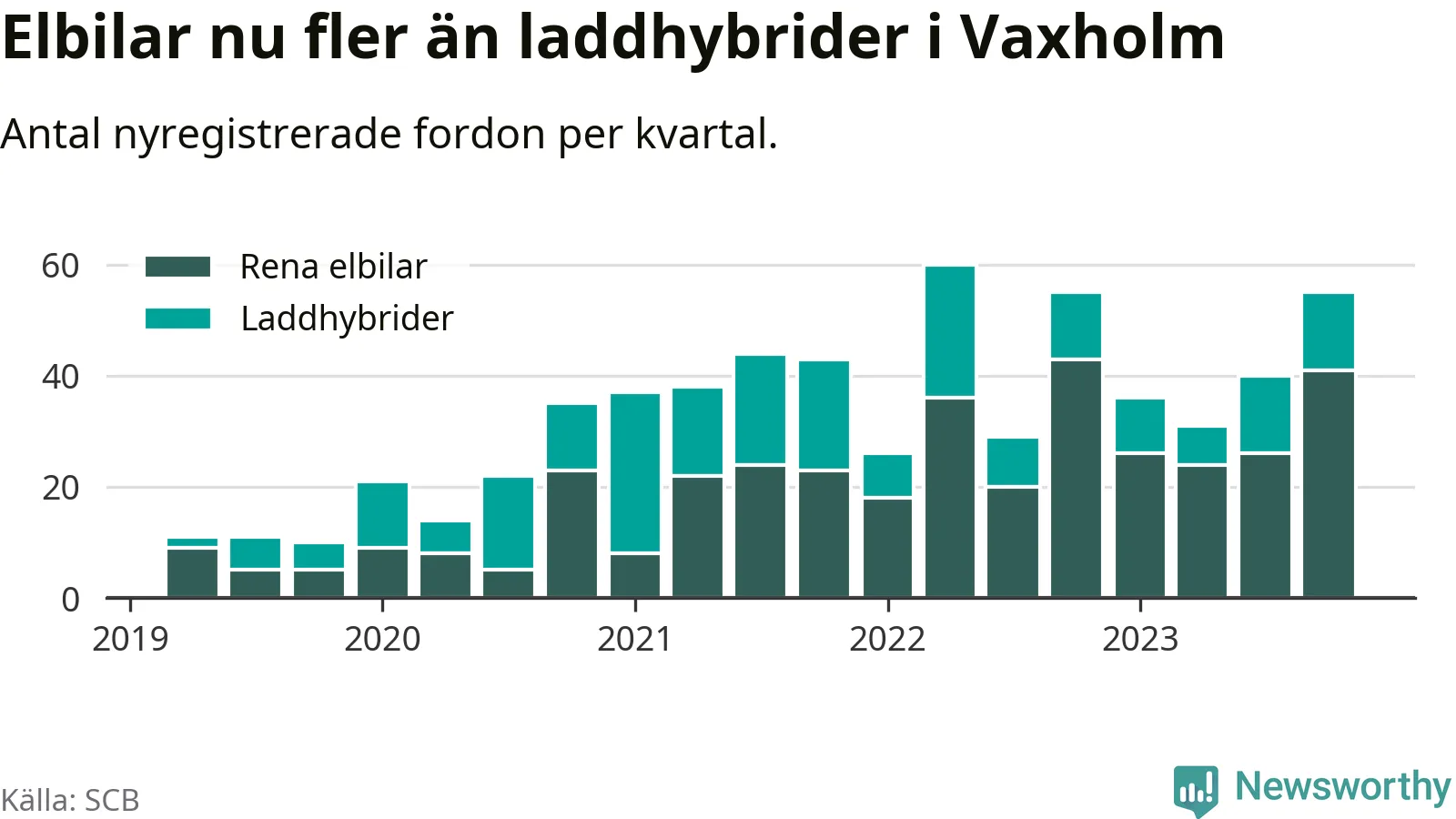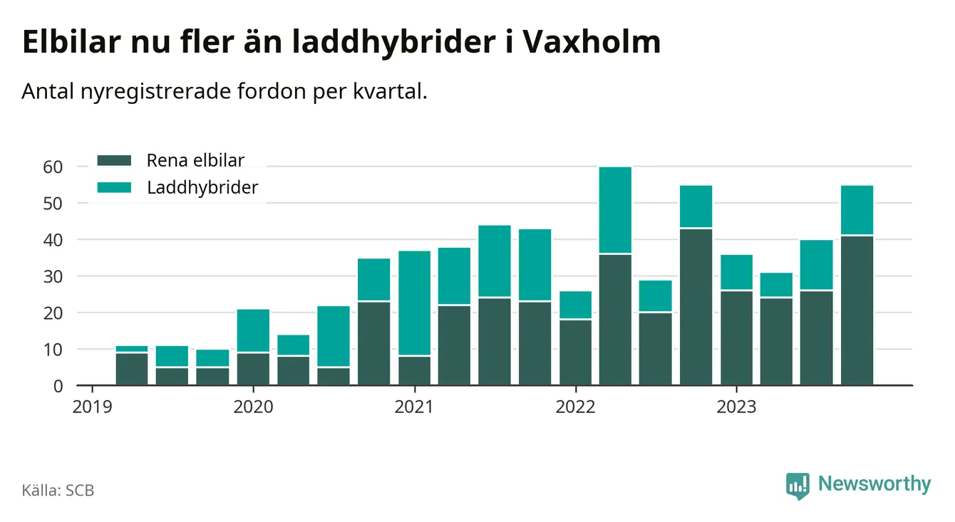 Men i Vaxholm noterades ett nytt rekord under fjärde kvartalet. Aldrig tidigare har laddbara bilar utgjort en så stor del av alla nya bilar.